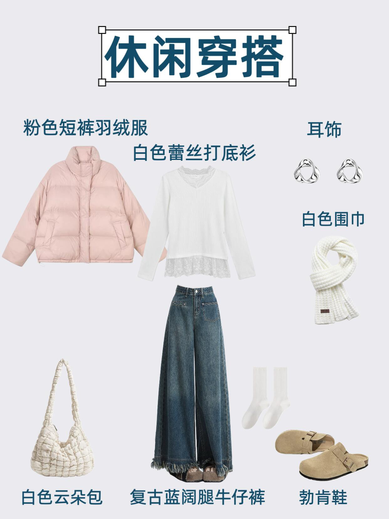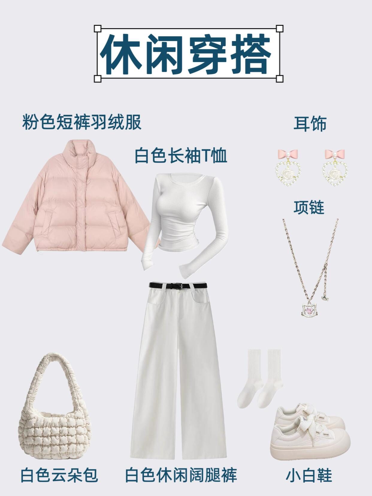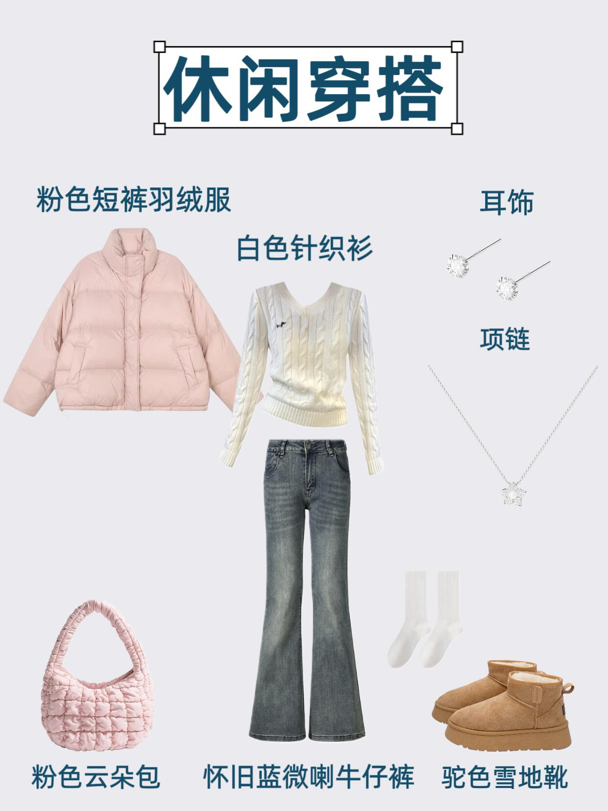 第1️⃣套:清新甜妹风 粉色短款羽绒服+白色长袖T恤+白色休闲阔腿裤+白色云朵包+小白鞋+耳饰+项链+白色袜子 第2️⃣套:复古温柔风 粉色短款羽绒服+白色针织衫+怀旧蓝微喇牛仔裤+粉色云朵包+驼色雪地靴+耳饰+项链+白色袜子 第3️⃣套:干练通勤风 粉色短款羽绒服+白色蕾丝打底衫+灰色微喇西装裤+粉色单肩包+灰色毛毛鞋+耳饰+项链+白色袜子 第4️⃣套:温暖休闲风 粉色短款羽绒服+白...