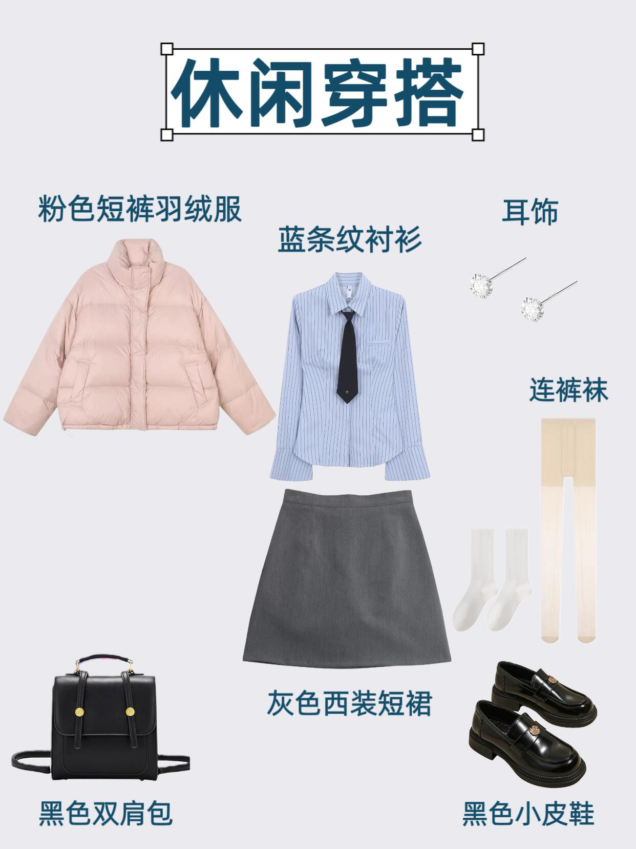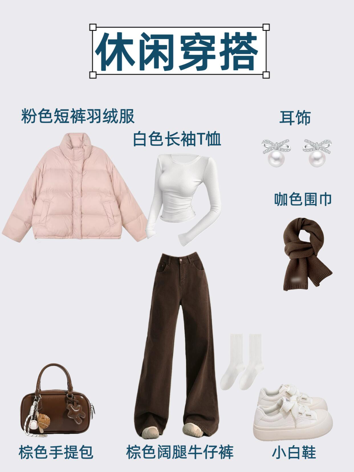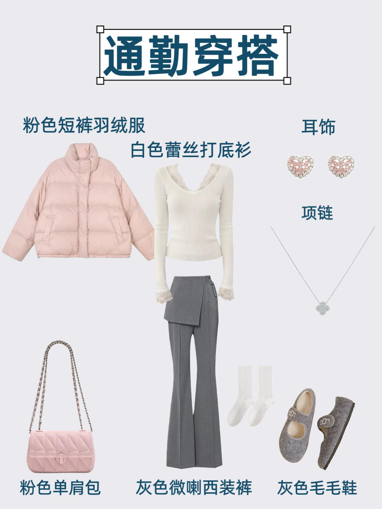 第1️⃣套:清新甜妹风 粉色短款羽绒服+白色长袖T恤+白色休闲阔腿裤+白色云朵包+小白鞋+耳饰+项链+白色袜子 第2️⃣套:复古温柔风 粉色短款羽绒服+白色针织衫+怀旧蓝微喇牛仔裤+粉色云朵包+驼色雪地靴+耳饰+项链+白色袜子 第3️⃣套:干练通勤风 粉色短款羽绒服+白色蕾丝打底衫+灰色微喇西装裤+粉色单肩包+灰色毛毛鞋+耳饰+项链+白色袜子 第4️⃣套:温暖休闲风 粉色短款羽绒服+白...