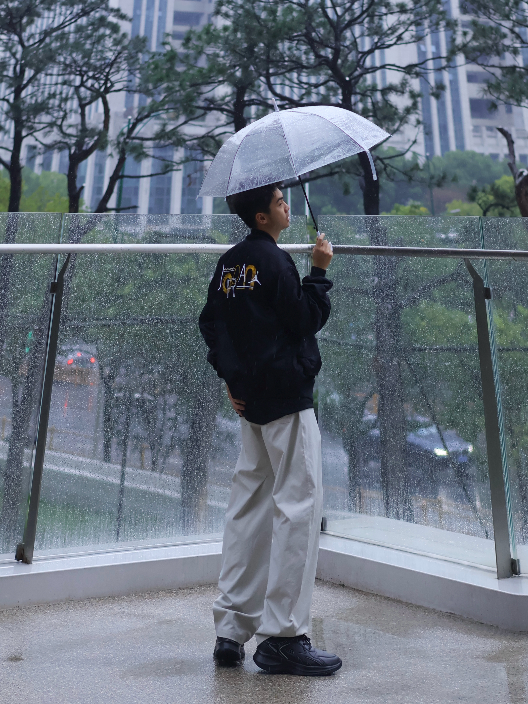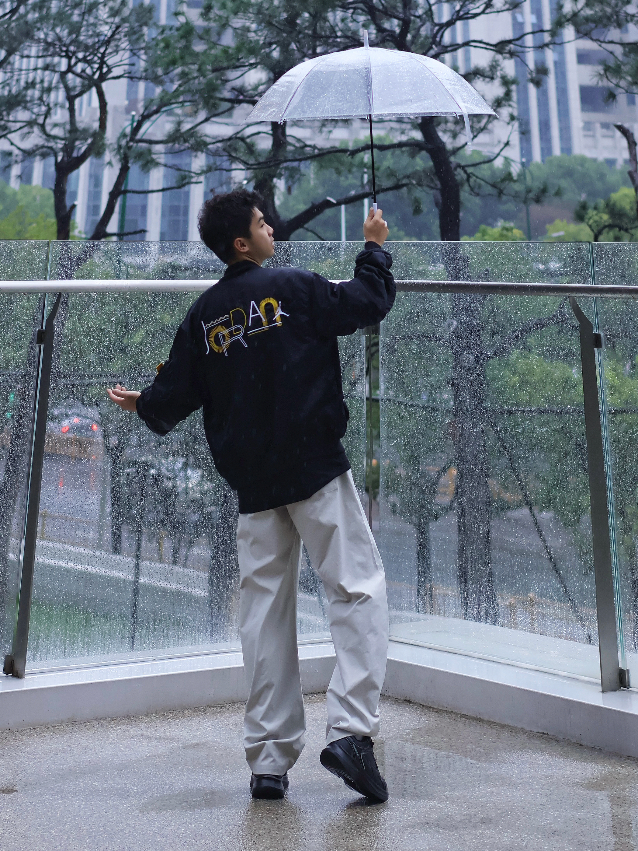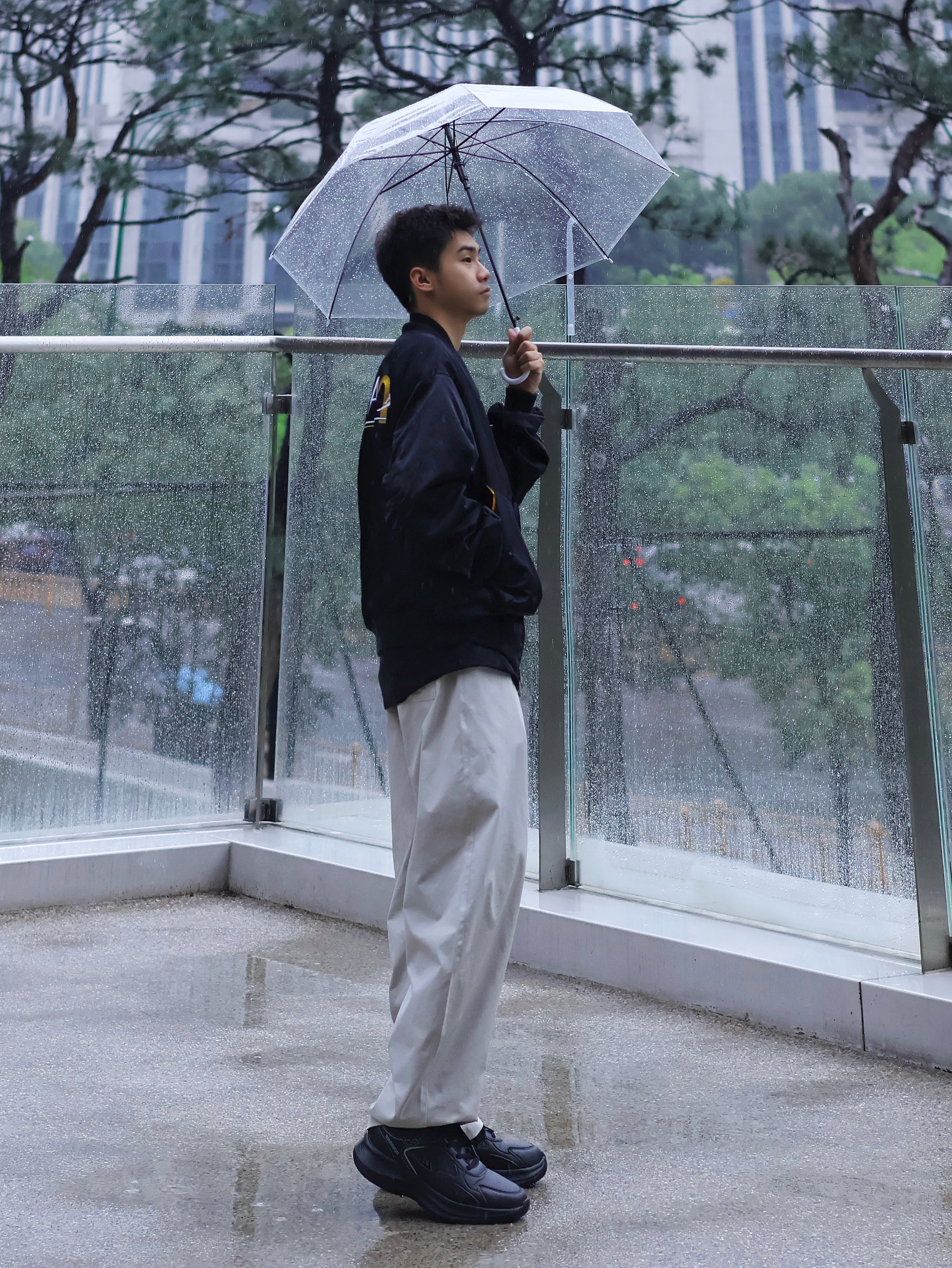 氛围感穿搭怎么拍?📷 不是只有晴天☀️才能出片! 🌧️雨天一样拍出街头氛围感~ 今日look: 上身一件美式黑色夹克搭配白色休闲裤 黑白配的设计更显简约 上脚一双纯黑运动鞋 颜色上下呼应 回弹的脚感暴走也不会太累~ 打上一个透明的雨伞(这是精髓🌟‼️) 轻松拿捏雨天的氛围感~