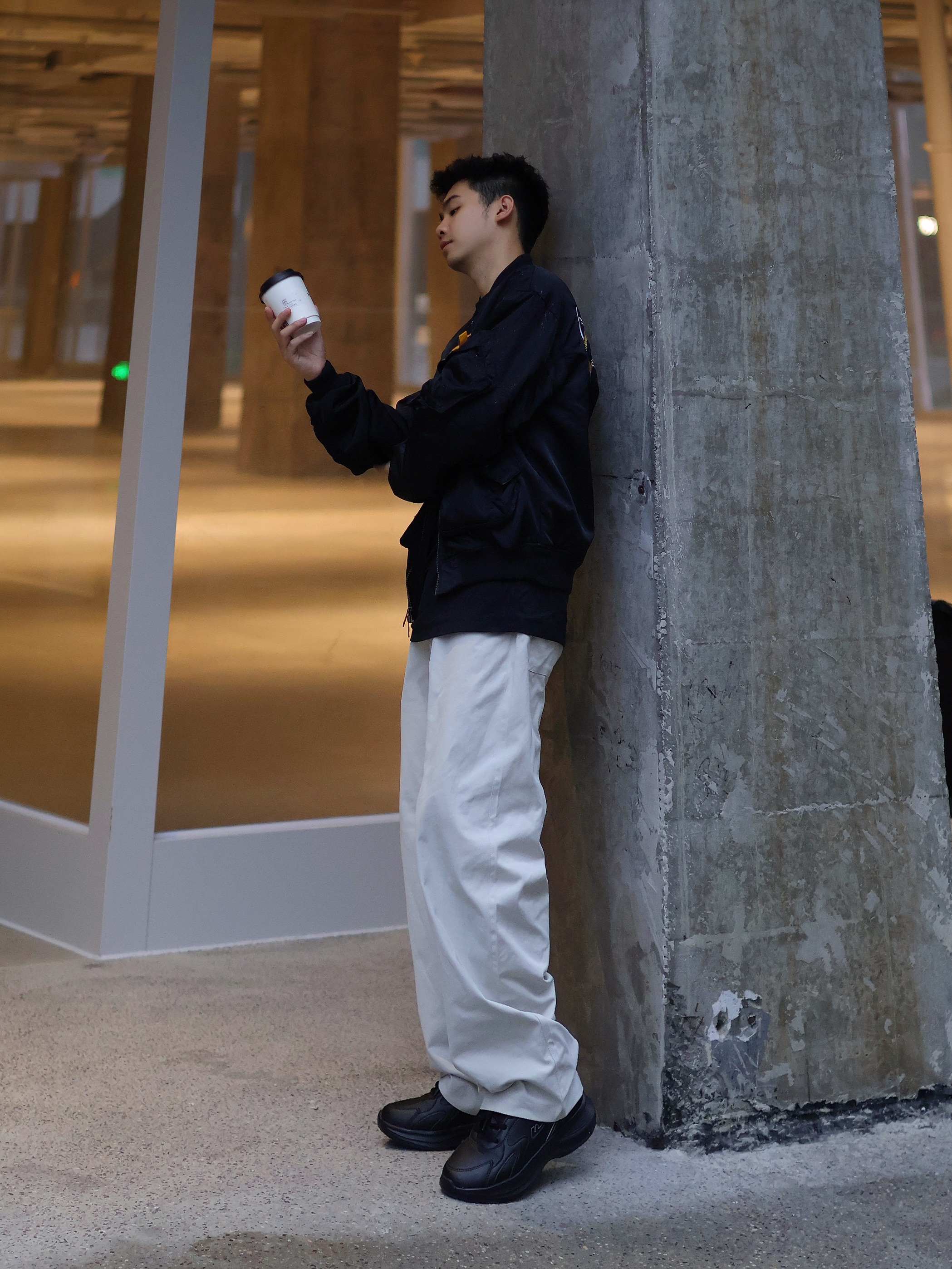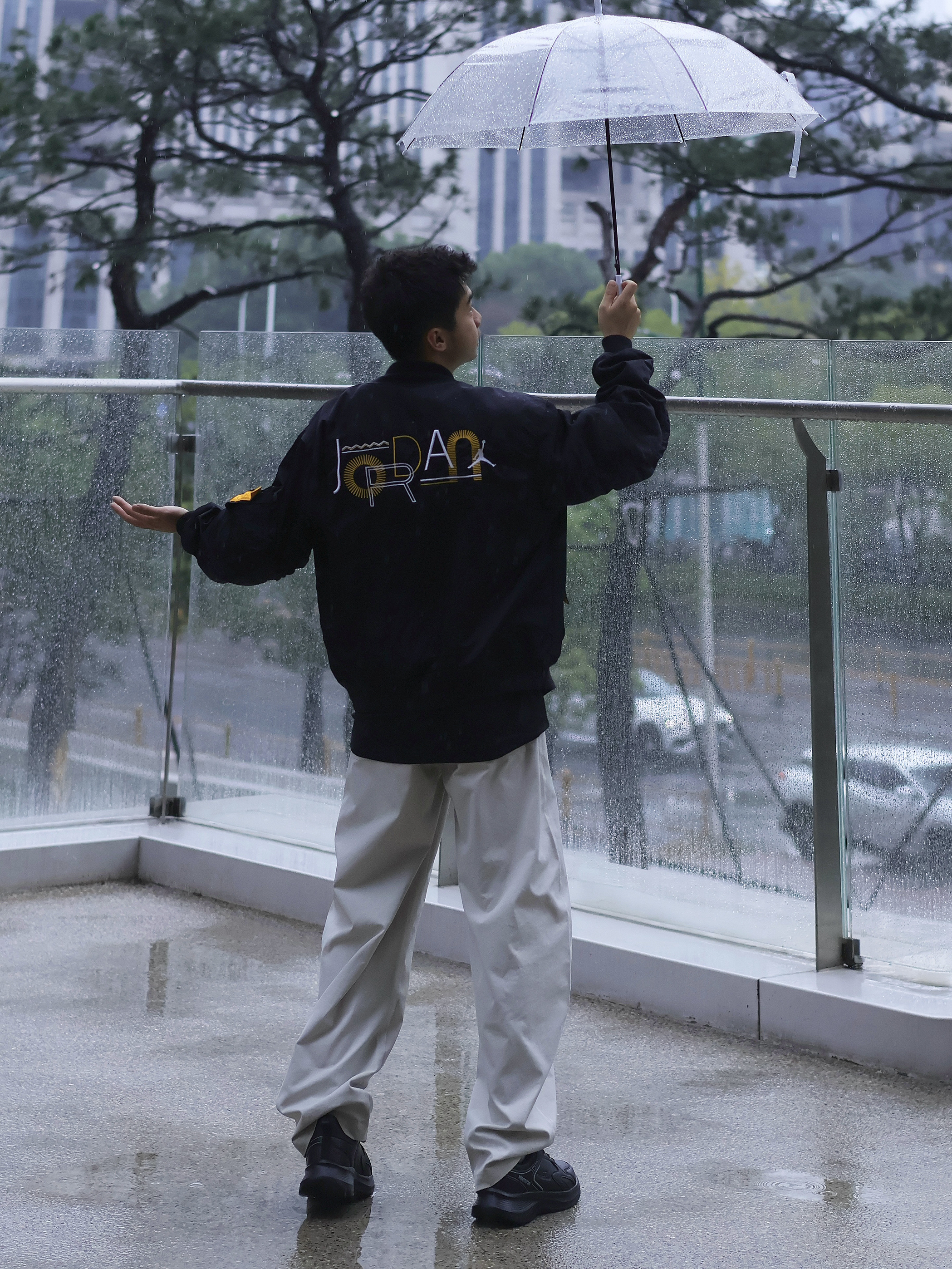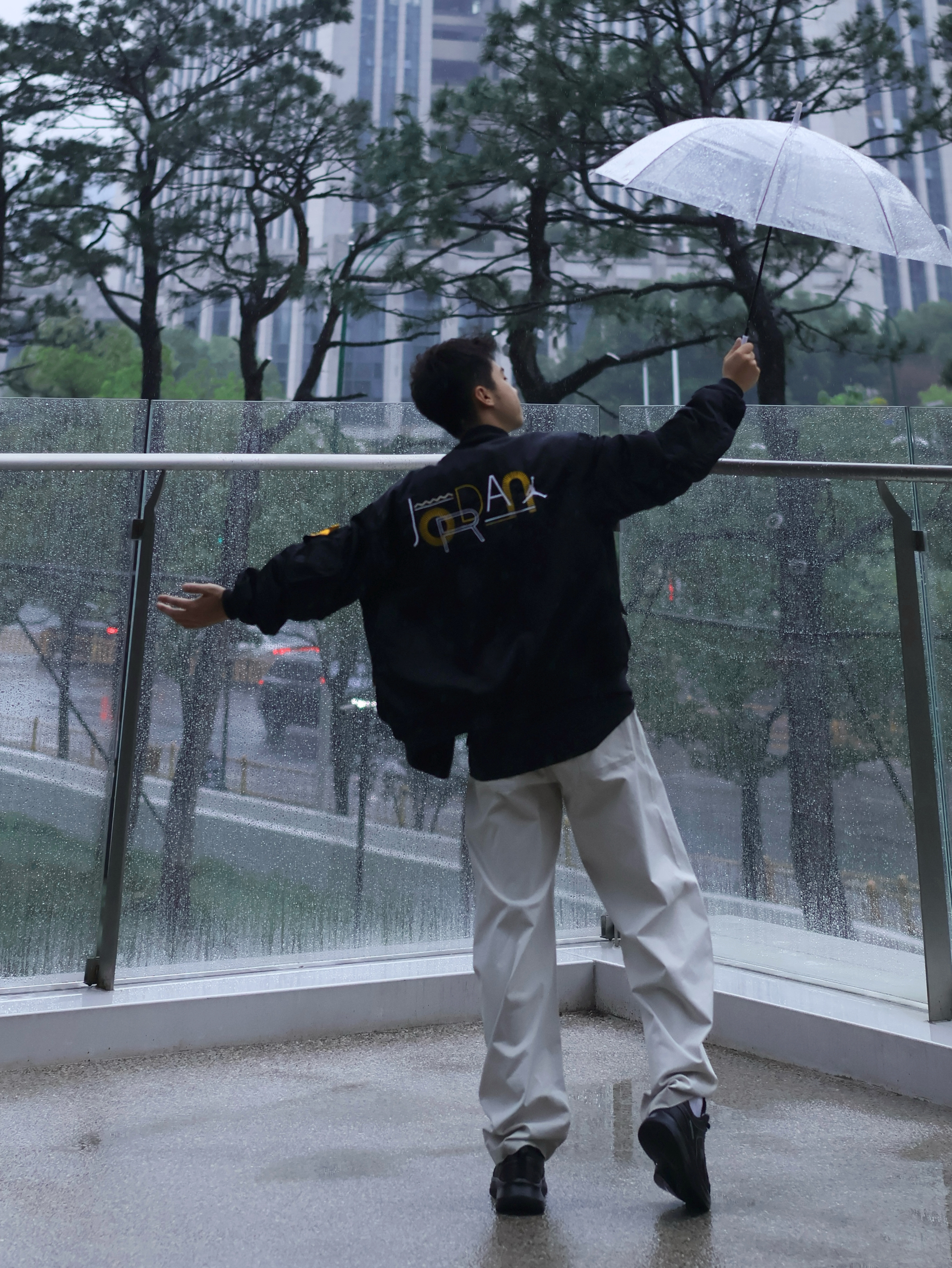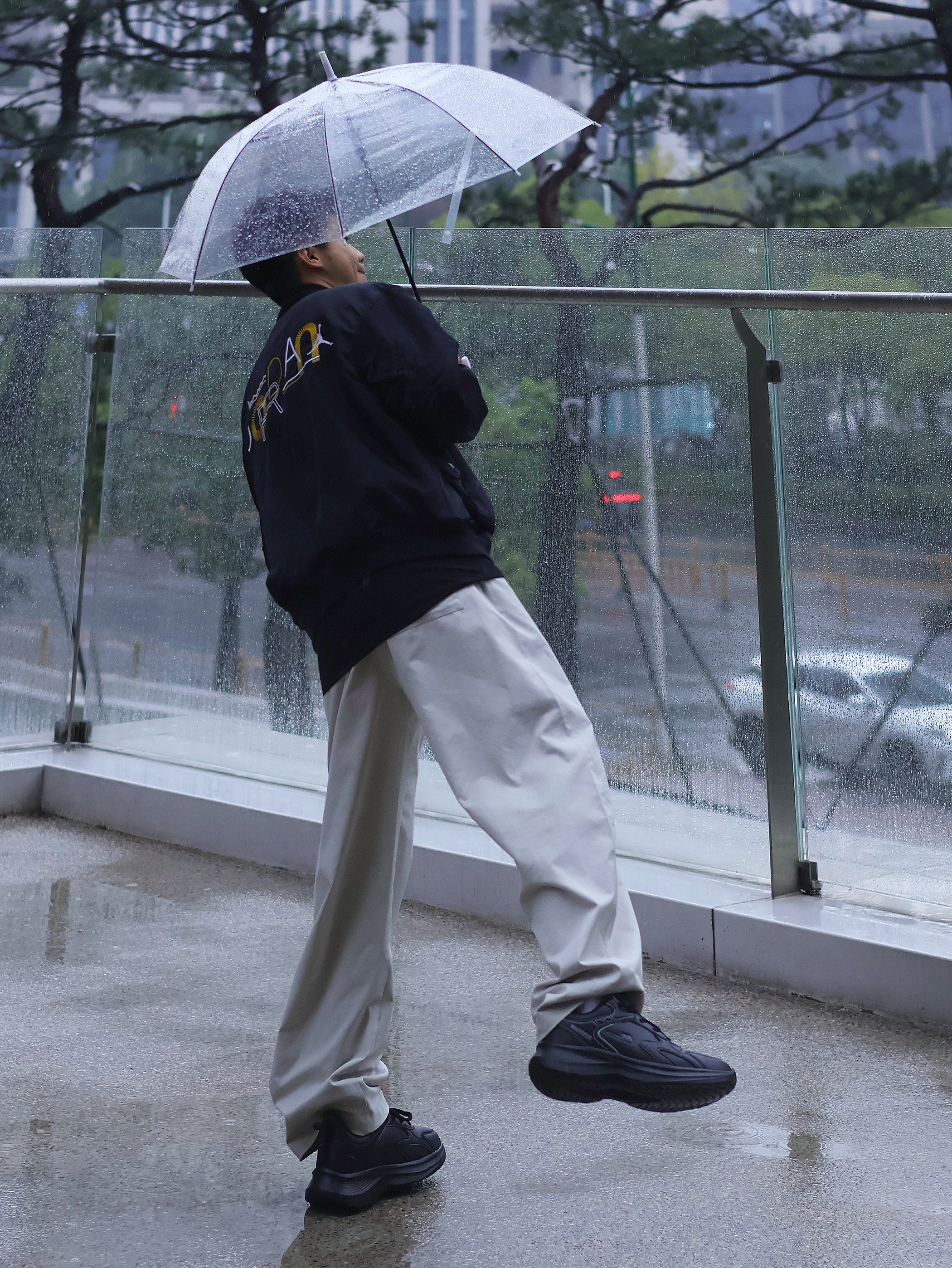 氛围感穿搭怎么拍?📷 不是只有晴天☀️才能出片! 🌧️雨天一样拍出街头氛围感~ 今日look: 上身一件美式黑色夹克搭配白色休闲裤 黑白配的设计更显简约 上脚一双纯黑运动鞋 颜色上下呼应 回弹的脚感暴走也不会太累~ 打上一个透明的雨伞(这是精髓🌟‼️) 轻松拿捏雨天的氛围感~
