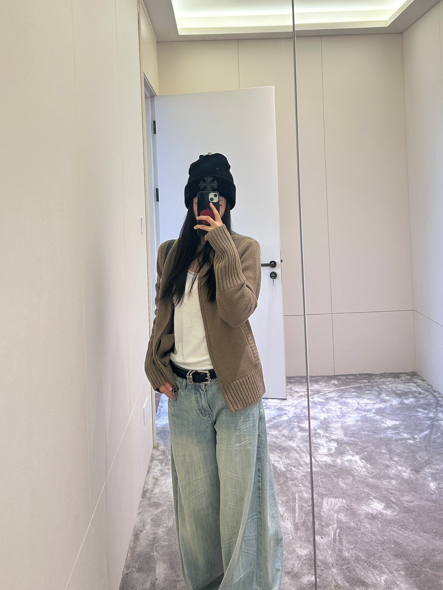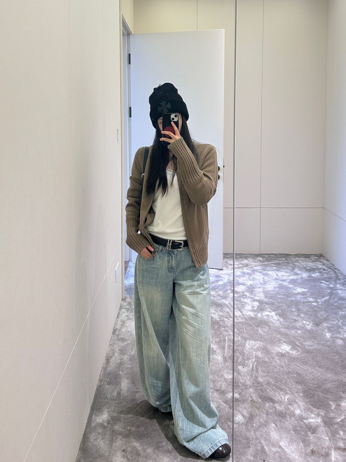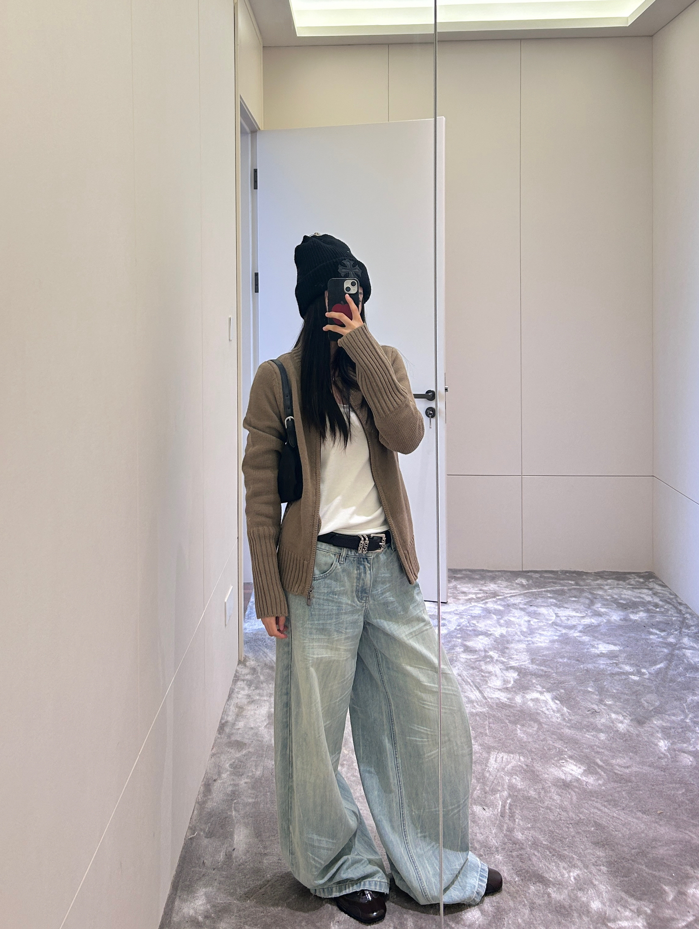 驼色开衫裹满温柔,软乎乎的针织质感像把秋天穿在身上~内搭白T做减法,金属扣皮带一掐,把慵懒和利落的比例调得刚好~ 浅蓝阔腿牛子裤坠出随性轮廓,黑包+皮鞋压稳风格,冷帽一戴,整套就是“不费力的舒服时髦”~