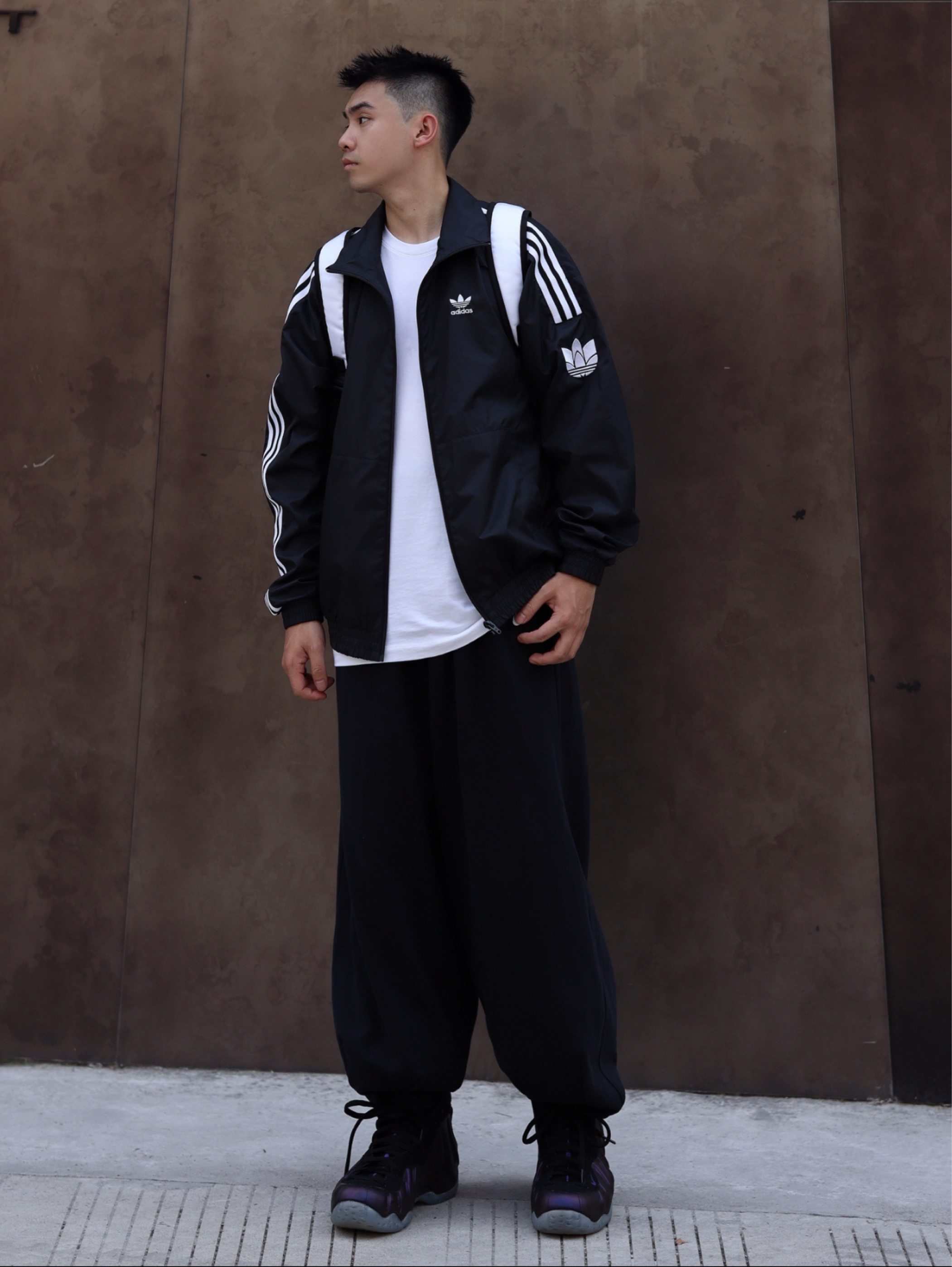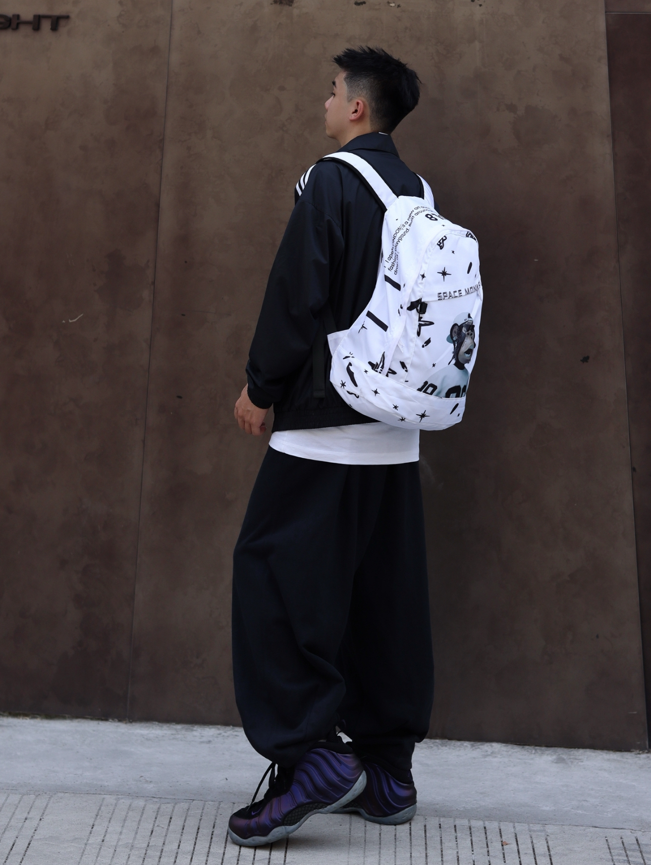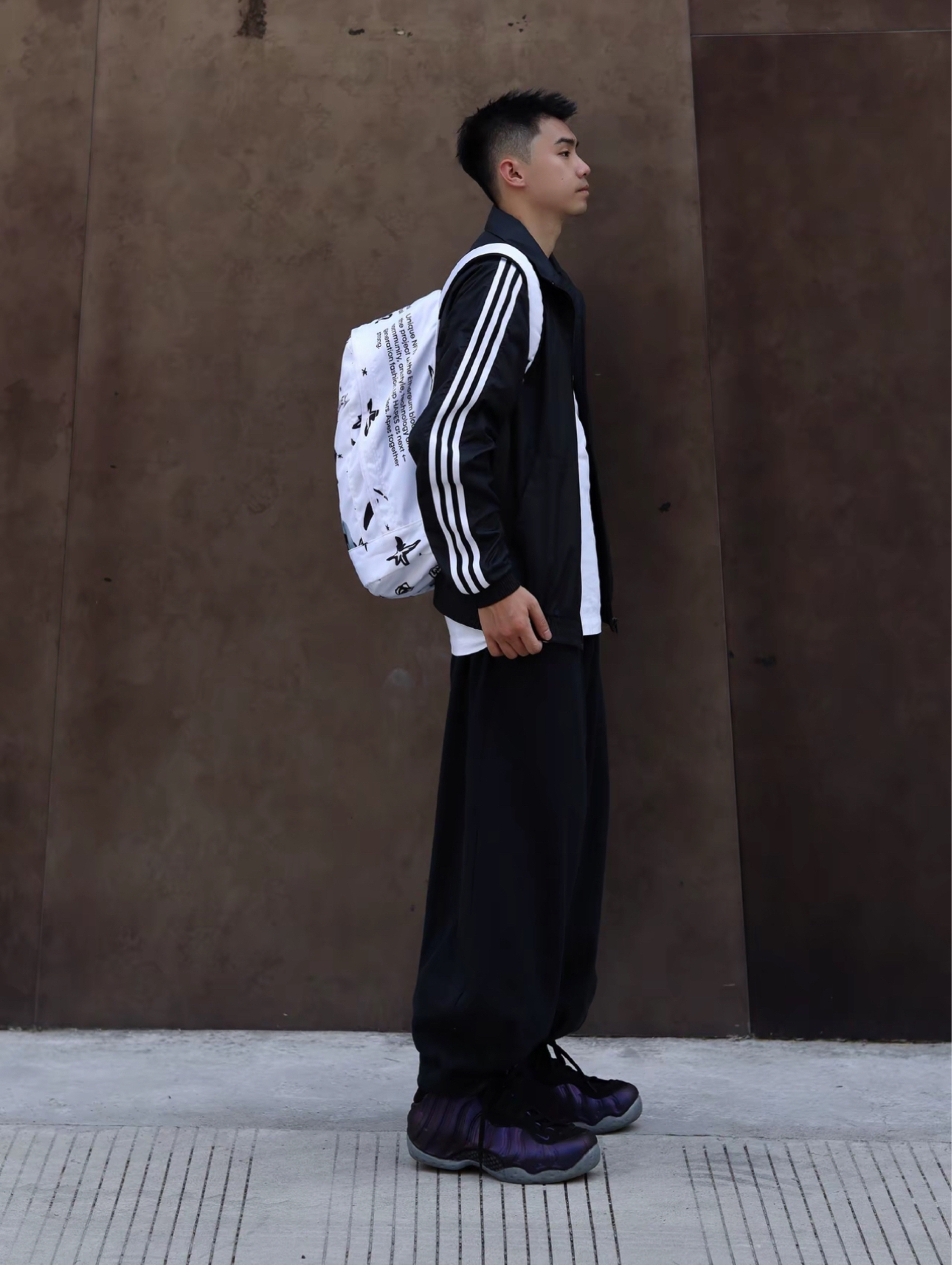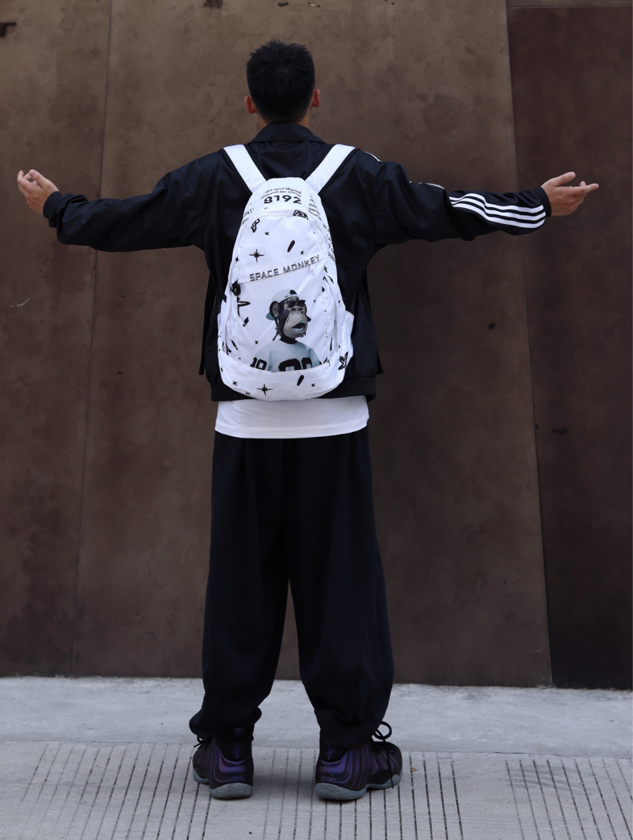 还是首选 black&white 谁都可以轻松驾驭⬇️ 黑色adidas夹克外套搭 白色内里 层次感就有了✨ 下搭同色系休闲裤 简约又自然~ 🎒: DRACONITE 🐒联名双肩包 酷帅的不行 白灰质感还挺不错的 Space Monkey的印花也是我喜欢的
