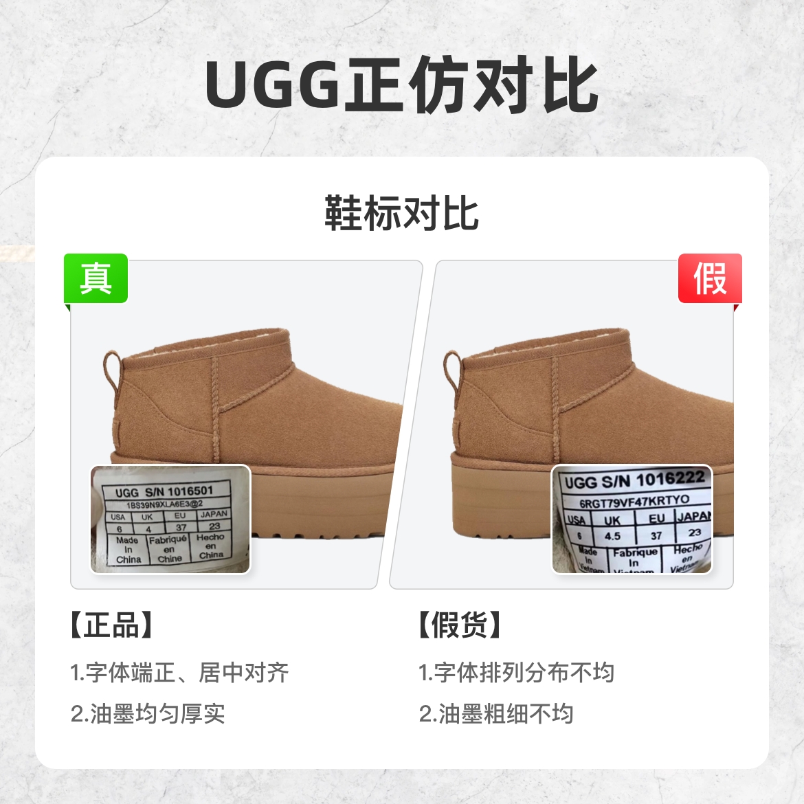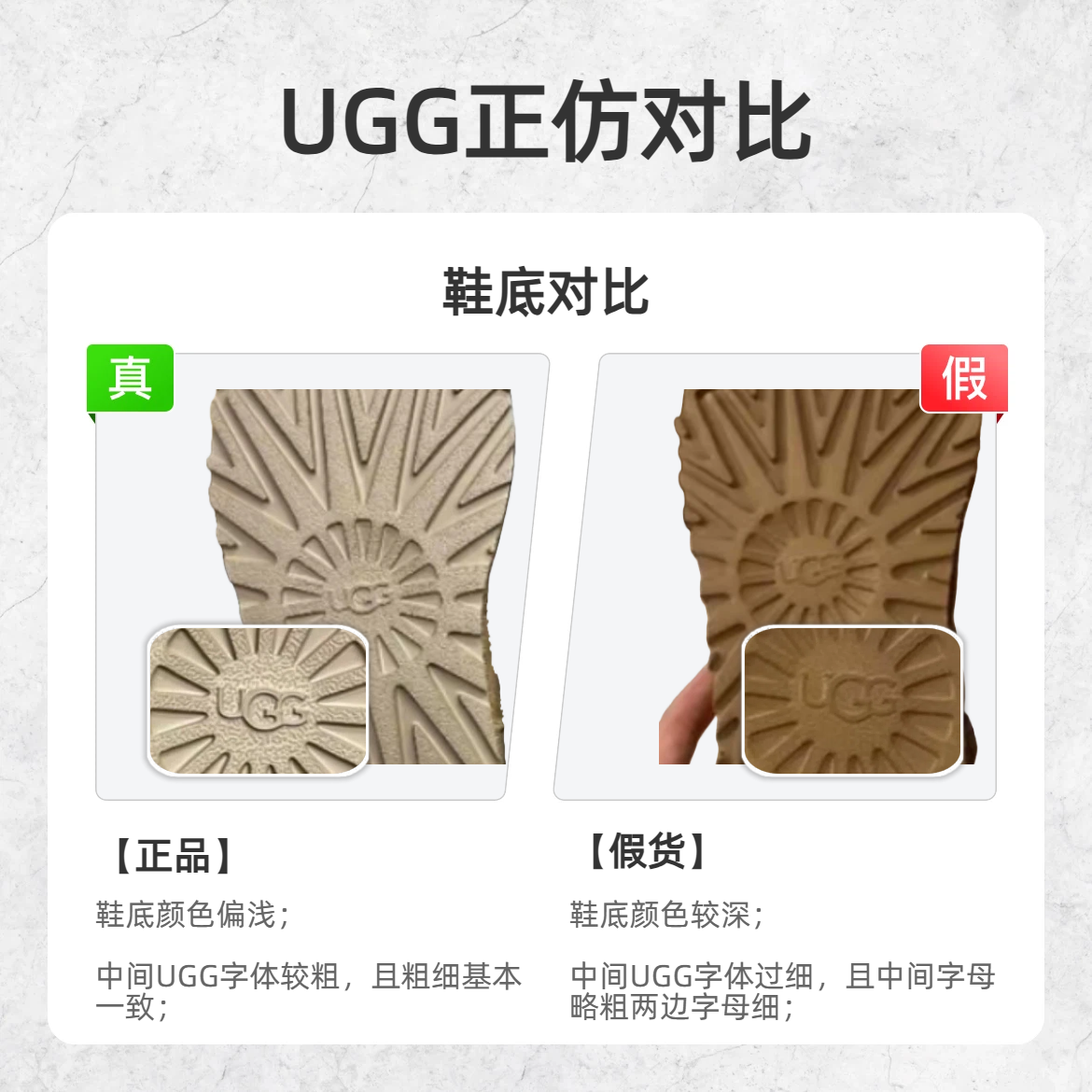 冬天来了,谁能拒绝一双暖呼呼的 UGG 雪地靴呢?但市面上假货太多,一不小心就踩坑!今天就教大家几招,轻松辨别 UGG 经典款雪地靴的真假~ 鞋标对比 - 正品:字体端正、居中对齐,油墨均匀厚实,整体印刷精致规整。 - 假货:字体排列分布不均,油墨粗细不一,细节处尽显粗糙。 后鞋标对比 - 正品:后跟标为动物皮革,质感细腻,纹理自然。 - 假货:后跟标为人造皮革,质感僵硬,缺乏天然皮革的纹理和...
