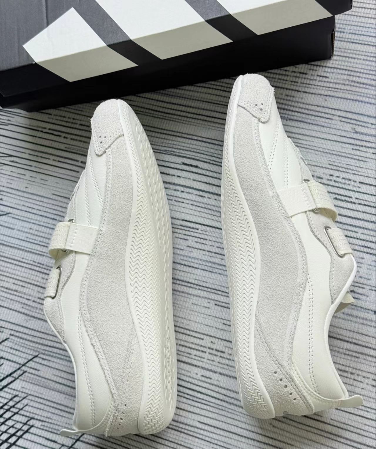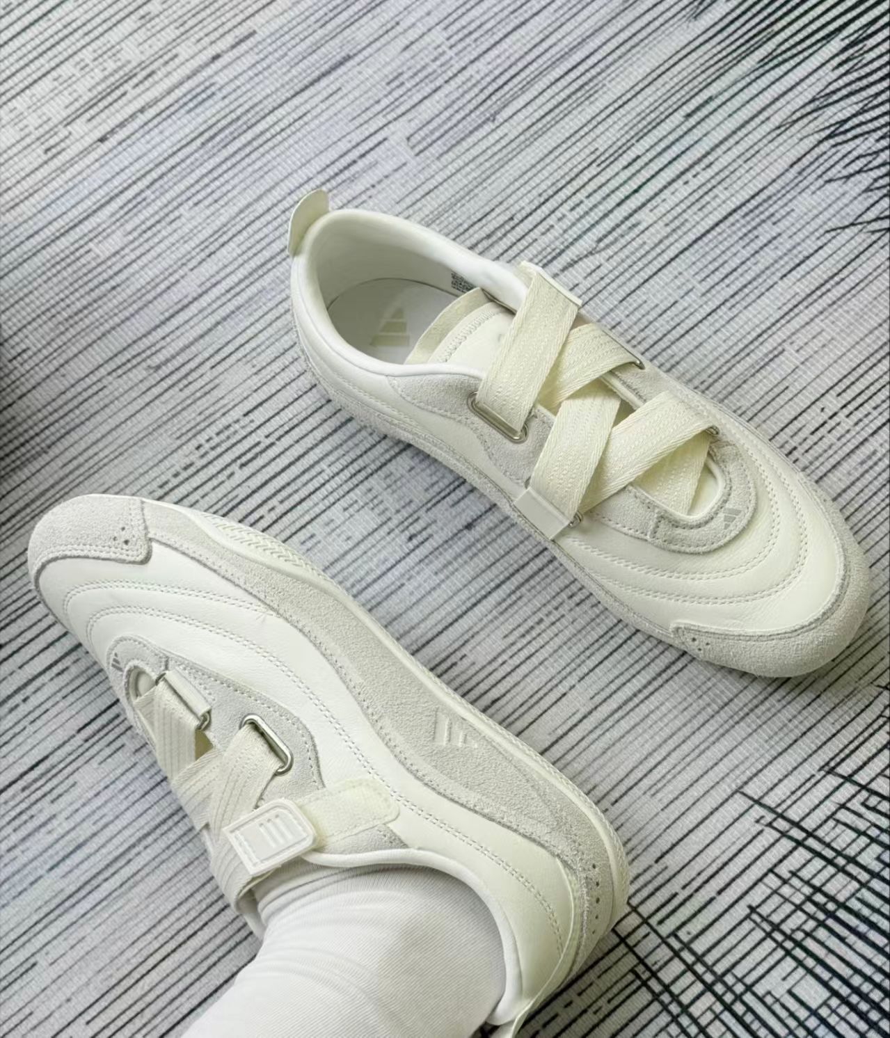 🛒好物名称:adidas休闲运动鞋 🤔推荐理由:这款鞋子的鞋面部分,亮白色区域大概率采用的是合成皮革或者头层牛皮这类皮革材质,这种材质相对比较耐磨,也容易清洁,能呈现出比较挺括的质感;矾土棕区域看起来有绒面的视觉效果,推测可能是猪巴革(猪剖层绒面革)或者牛反绒这类绒面材质,这类材质触感柔软,能提升鞋子的复古感和质感。 看起来还是挺好看的很轻便,像极了芭蕾舞鞋