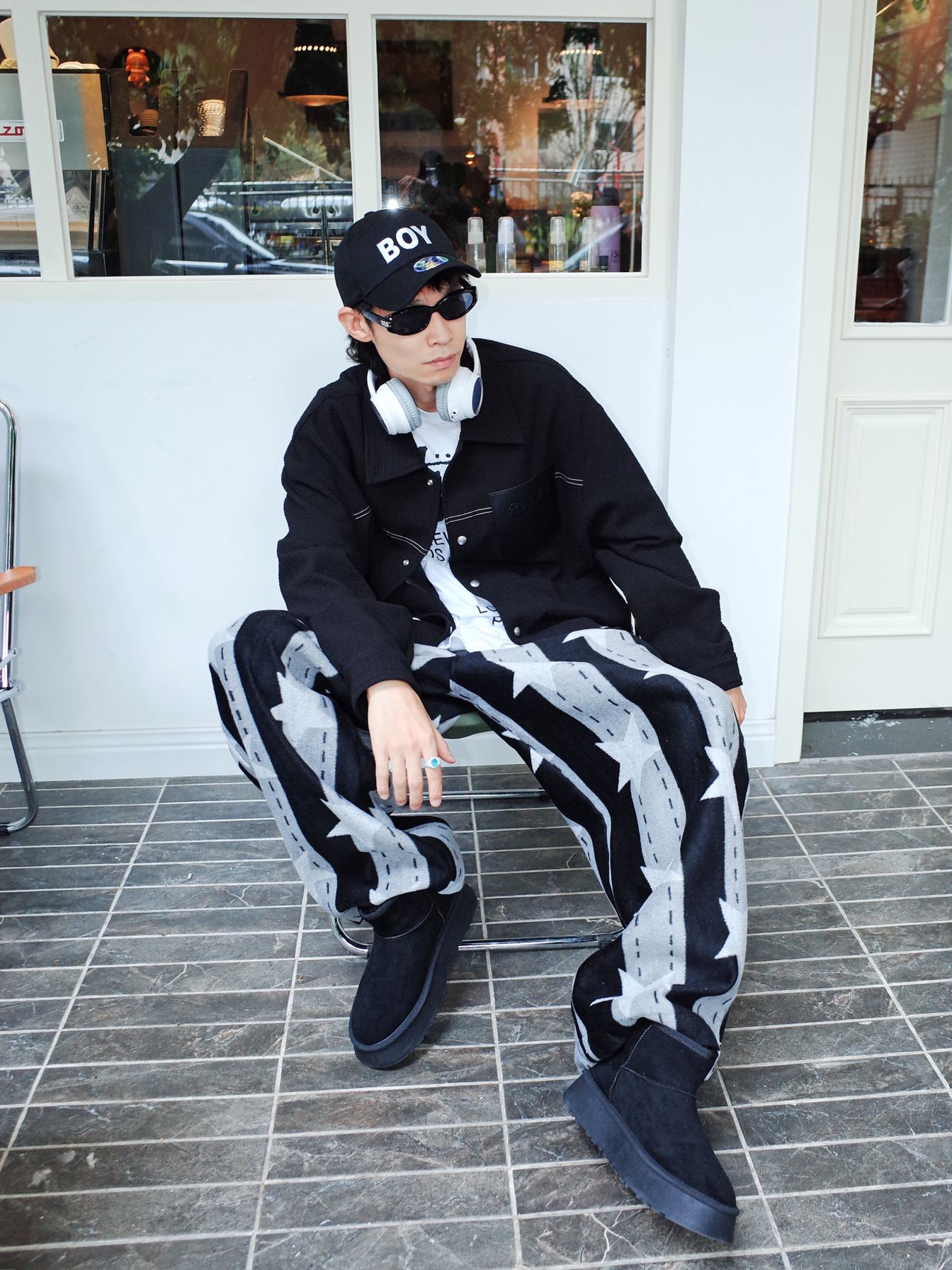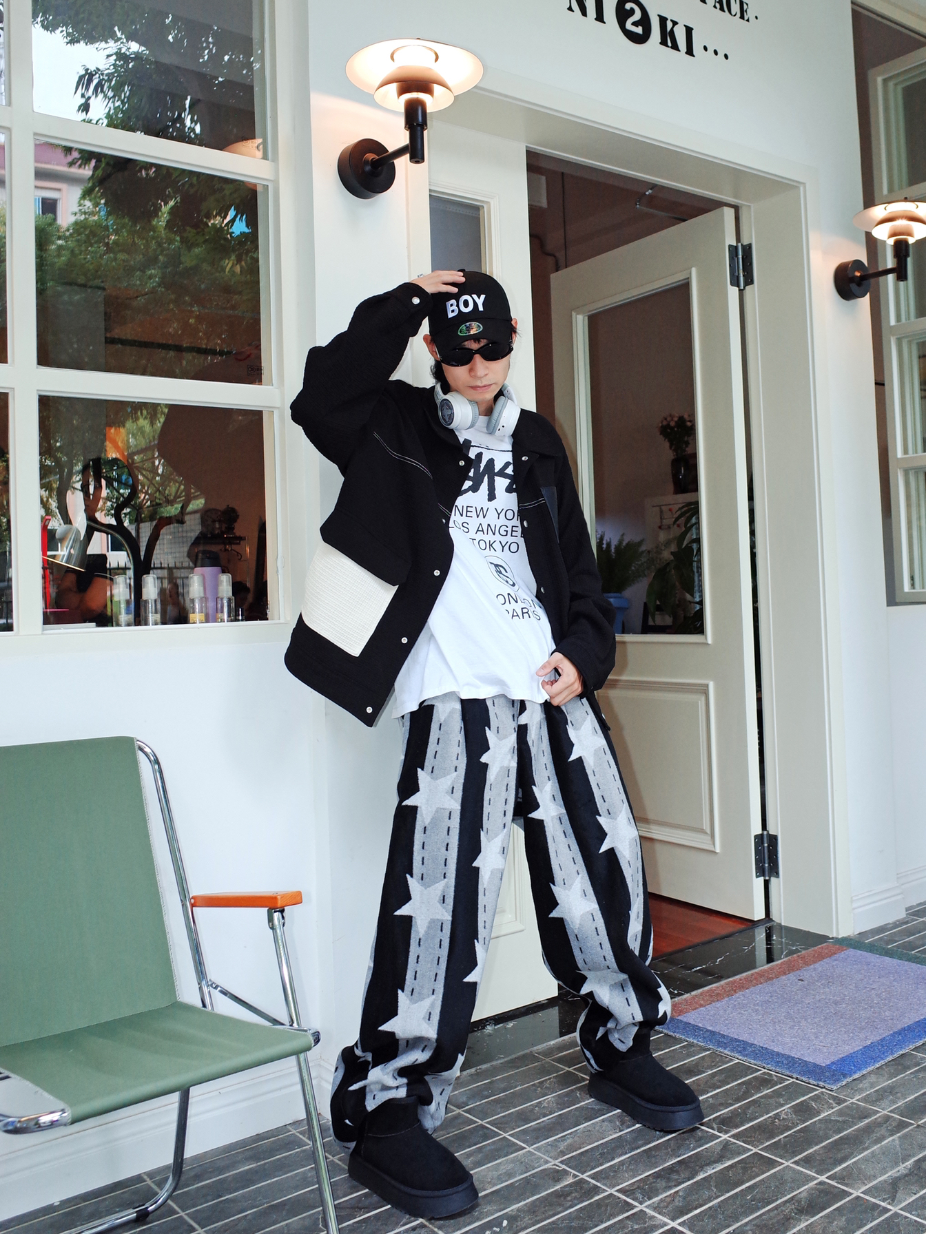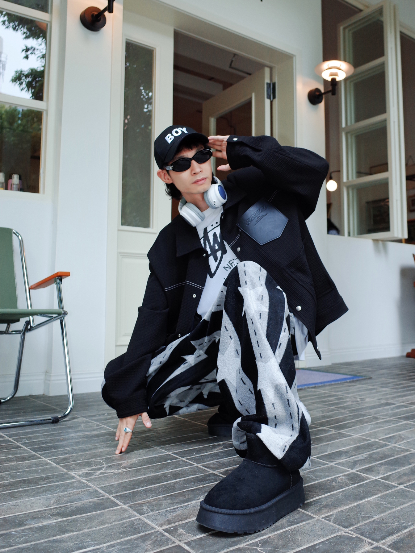 降温了穿什么? 可以试试黑白配! 黑色夹克➕黑灰条纹裤 内搭白t叠穿出层次感 宽松的版型自带松弛感 脚上一双暖fufu的黑色雪地靴 上脚舒适、配色耐脏 轻松拿捏秋冬的氛围感