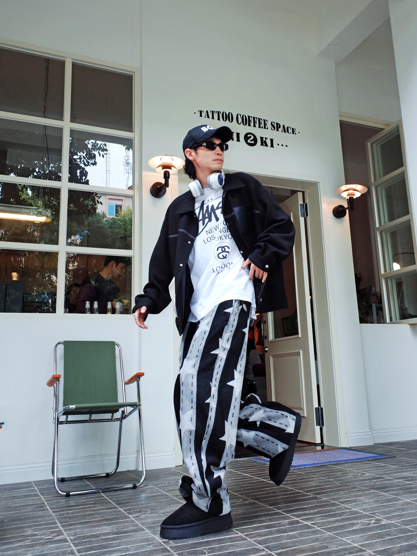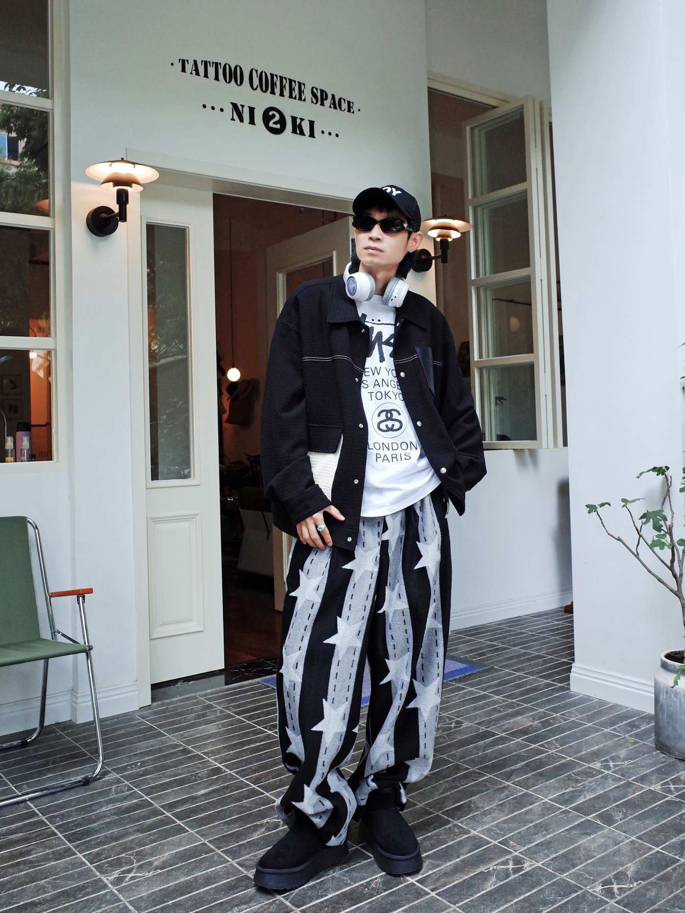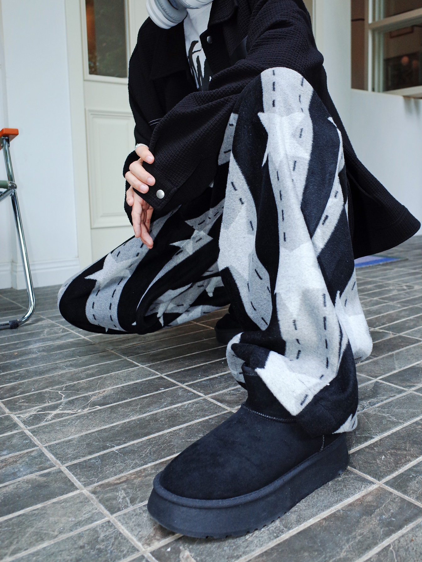 降温了穿什么? 可以试试黑白配! 黑色夹克➕黑灰条纹裤 内搭白t叠穿出层次感 宽松的版型自带松弛感 脚上一双暖fufu的黑色雪地靴 上脚舒适、配色耐脏 轻松拿捏秋冬的氛围感