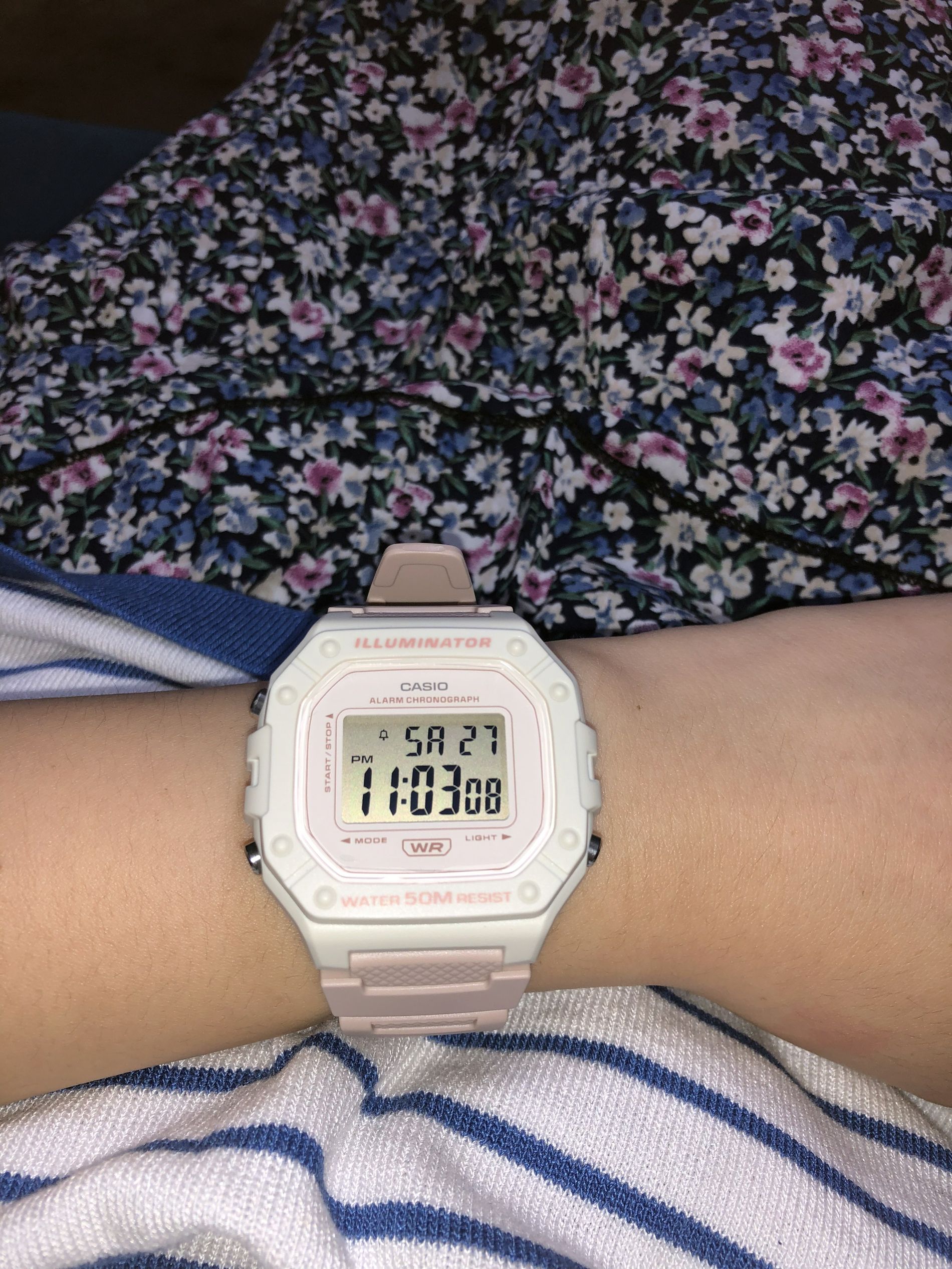 奶乎乎的白色表带,配上表盘里的玫瑰金刻度,又酷又温柔!而且戴在手上特别轻,运动或者日常戴都合适~