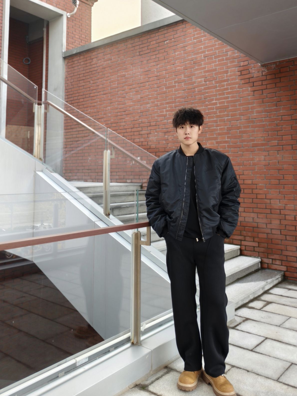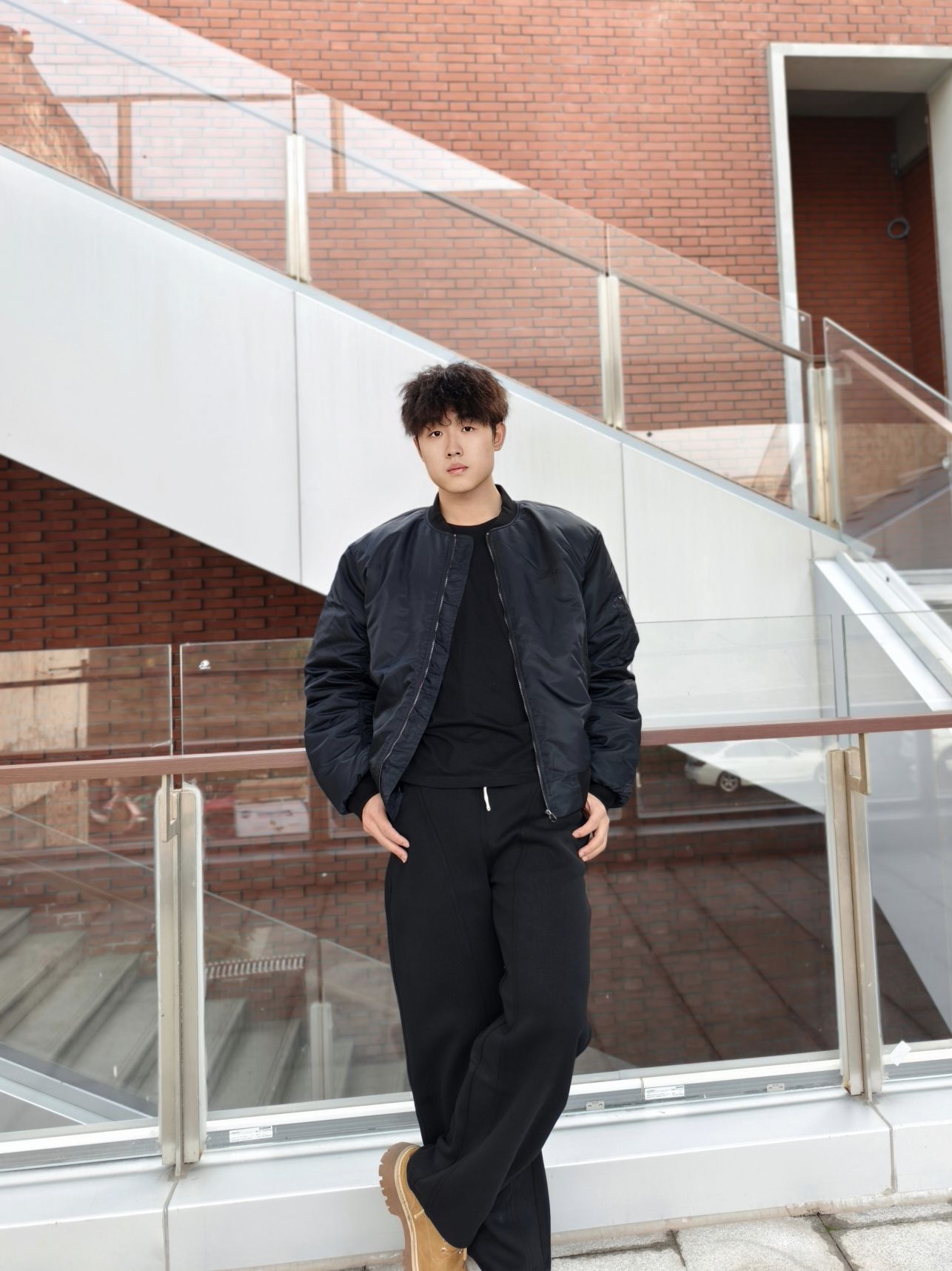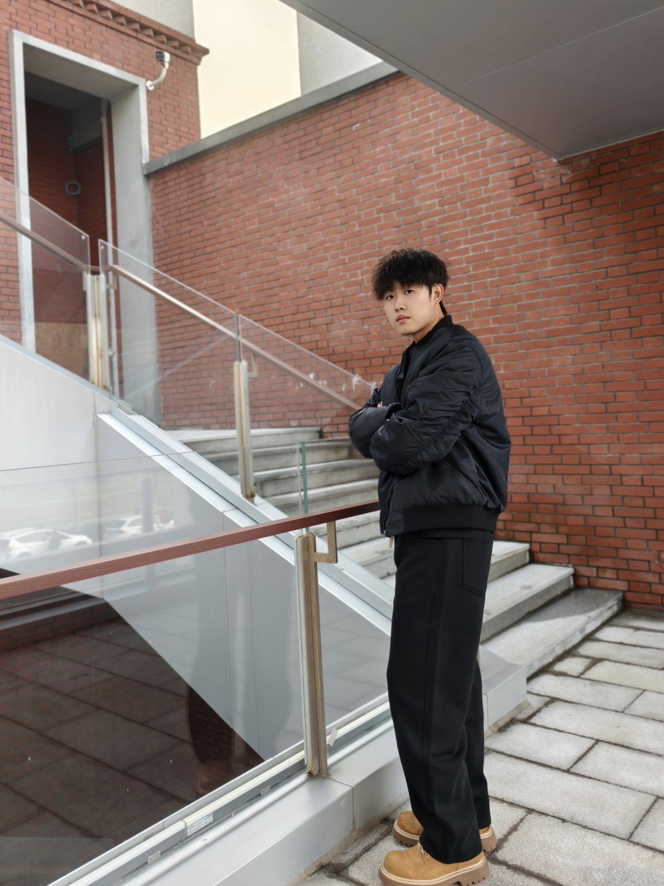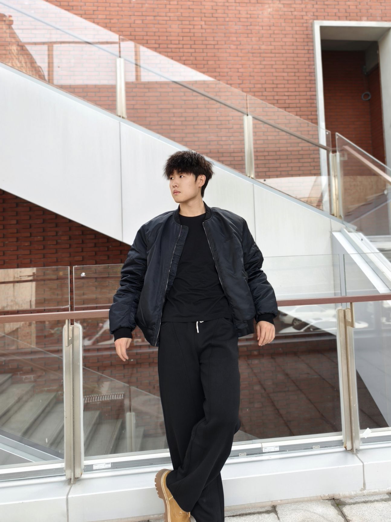 上衣黑色长袖T恤+黑色弯刀裤 这样的穿搭显的简约又帅气 而且裤子的松紧腰抽绳设计很贴心,穿着舒适不勒腰,弯刀裤真的不挑腿型 上身也显高 搭配一双大黄靴,层次感立马就出来了 本人📏178/70kg裤子xl很合身