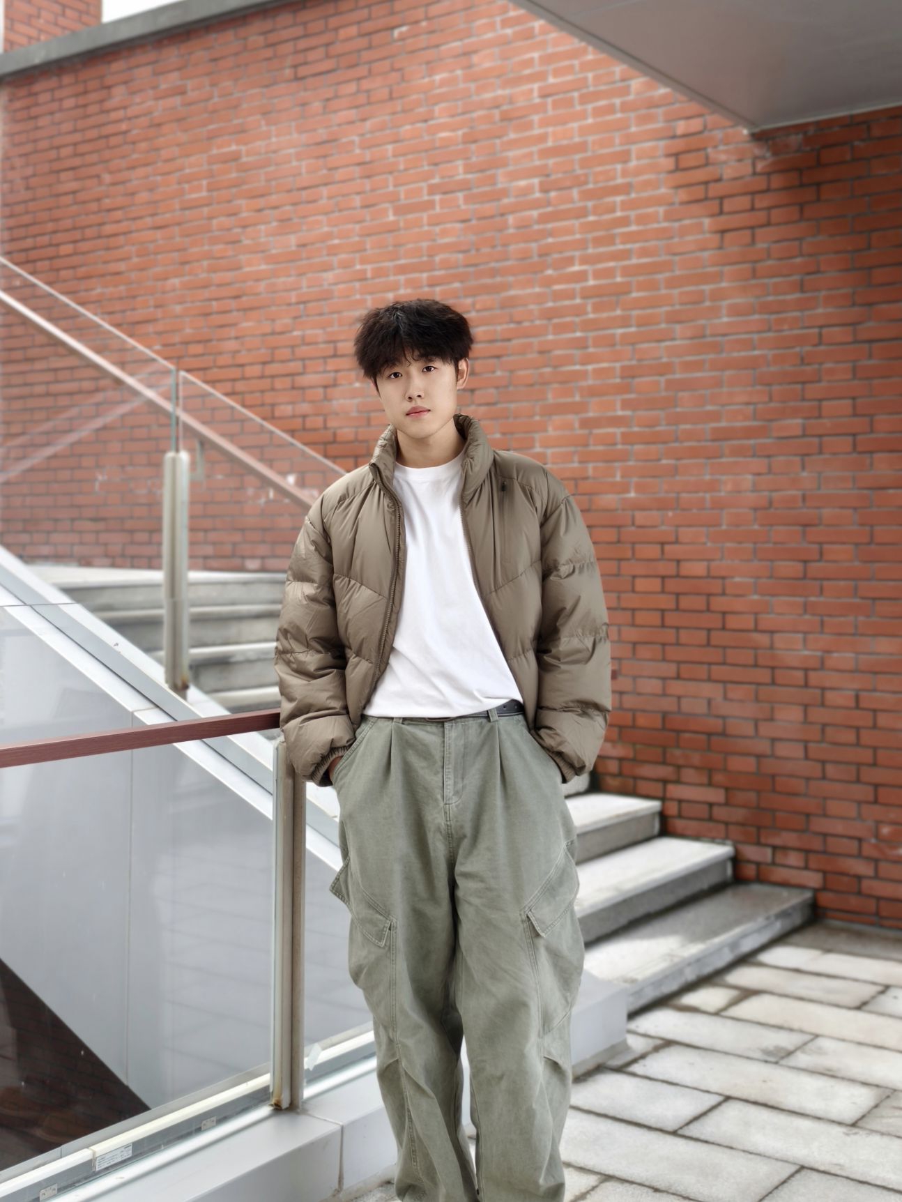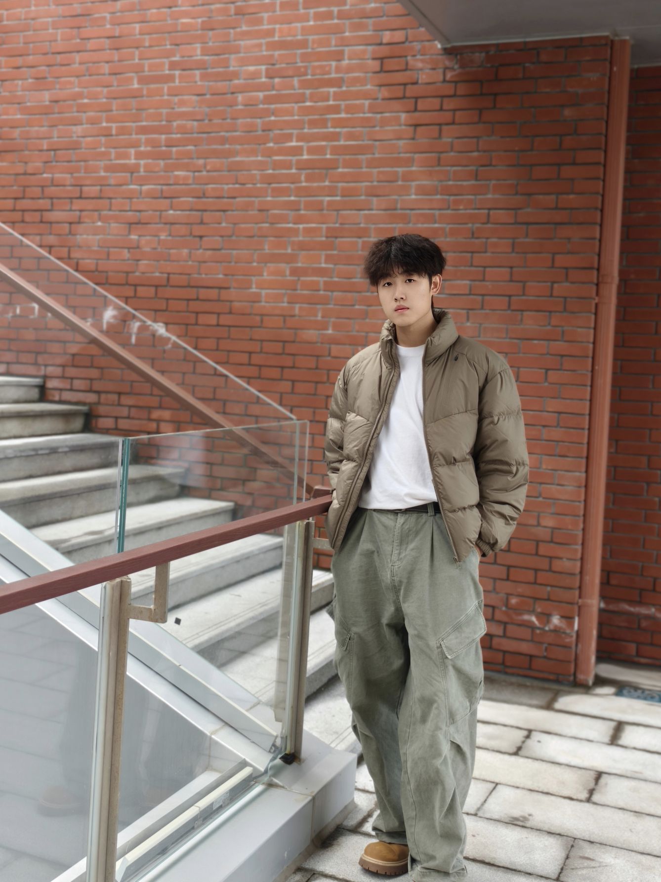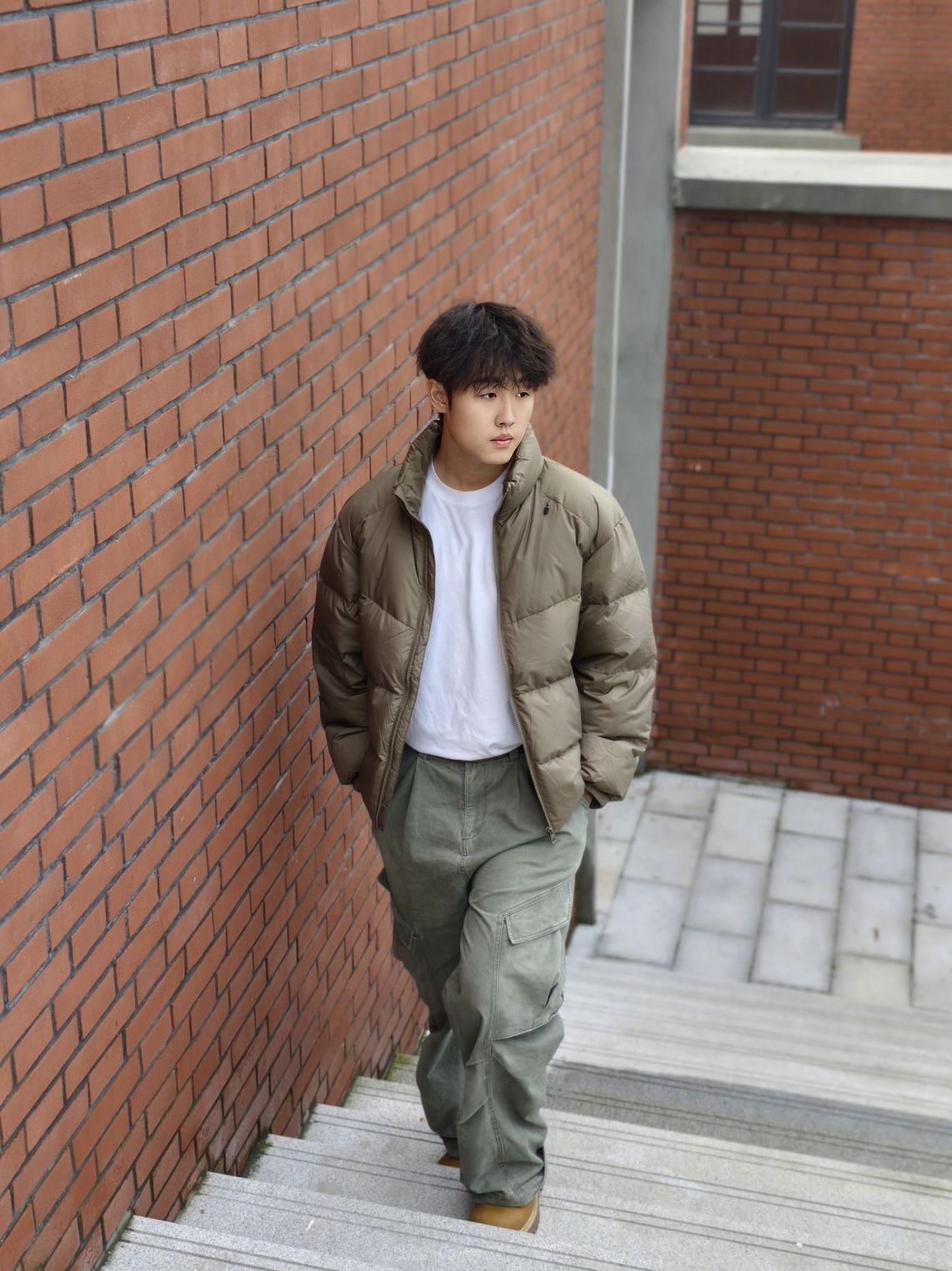 卡其色短款羽绒服+白色内搭+军绿色工装裤+大黄靴👢 我身高178,宽松度刚好,活动起来很自在。羽绒服很轻但保暖性不错,短款版型不压个子,对小个子也友好。军绿色工装裤口袋多,能装又显腿长,搭配起来休闲随性。 这种搭配日常出街、通勤都合适,卡其与军绿的色调很和谐,低调有质感。秋冬微凉的天气穿正合适,不会太厚重,也能应对早晚温差。