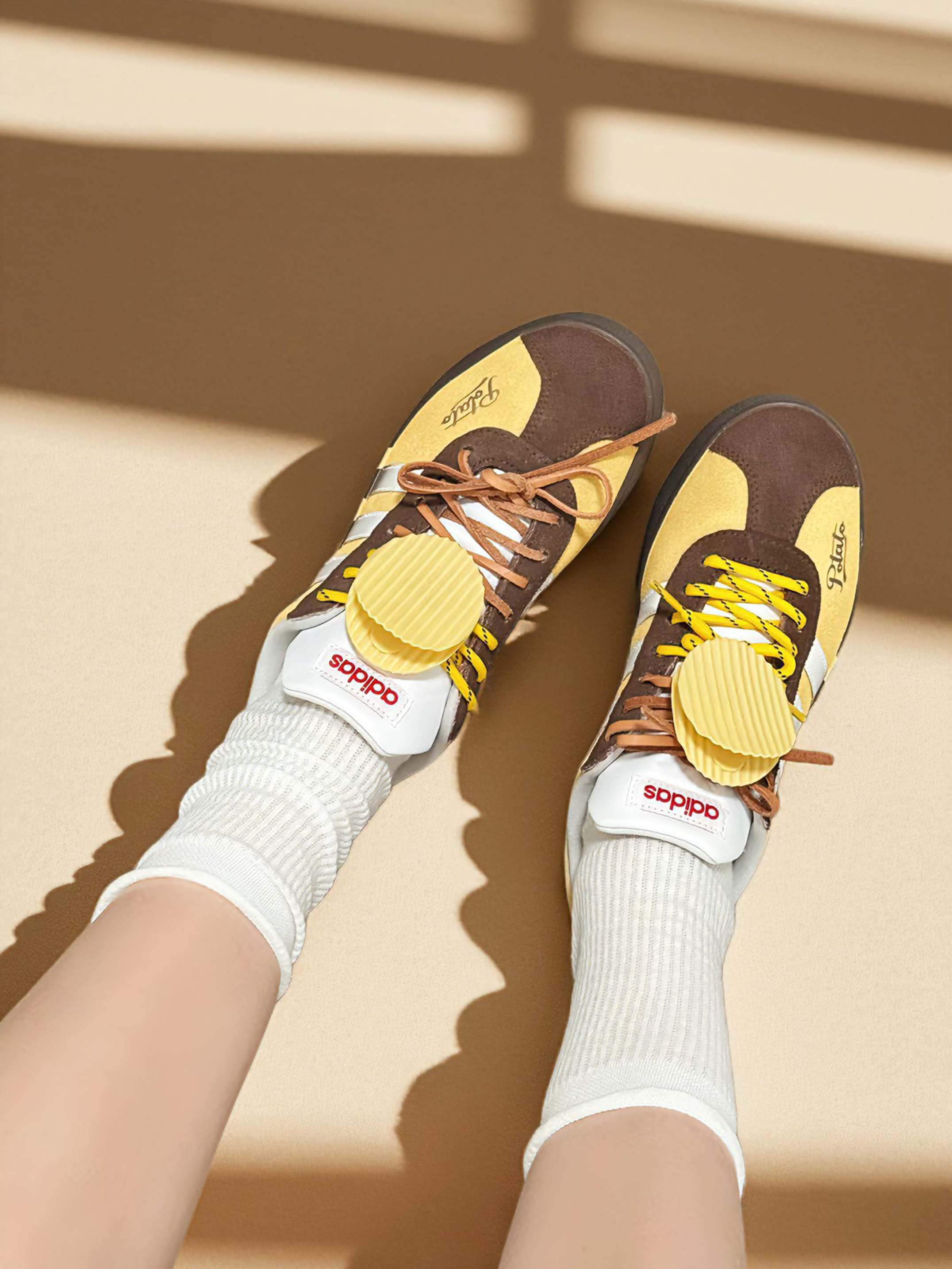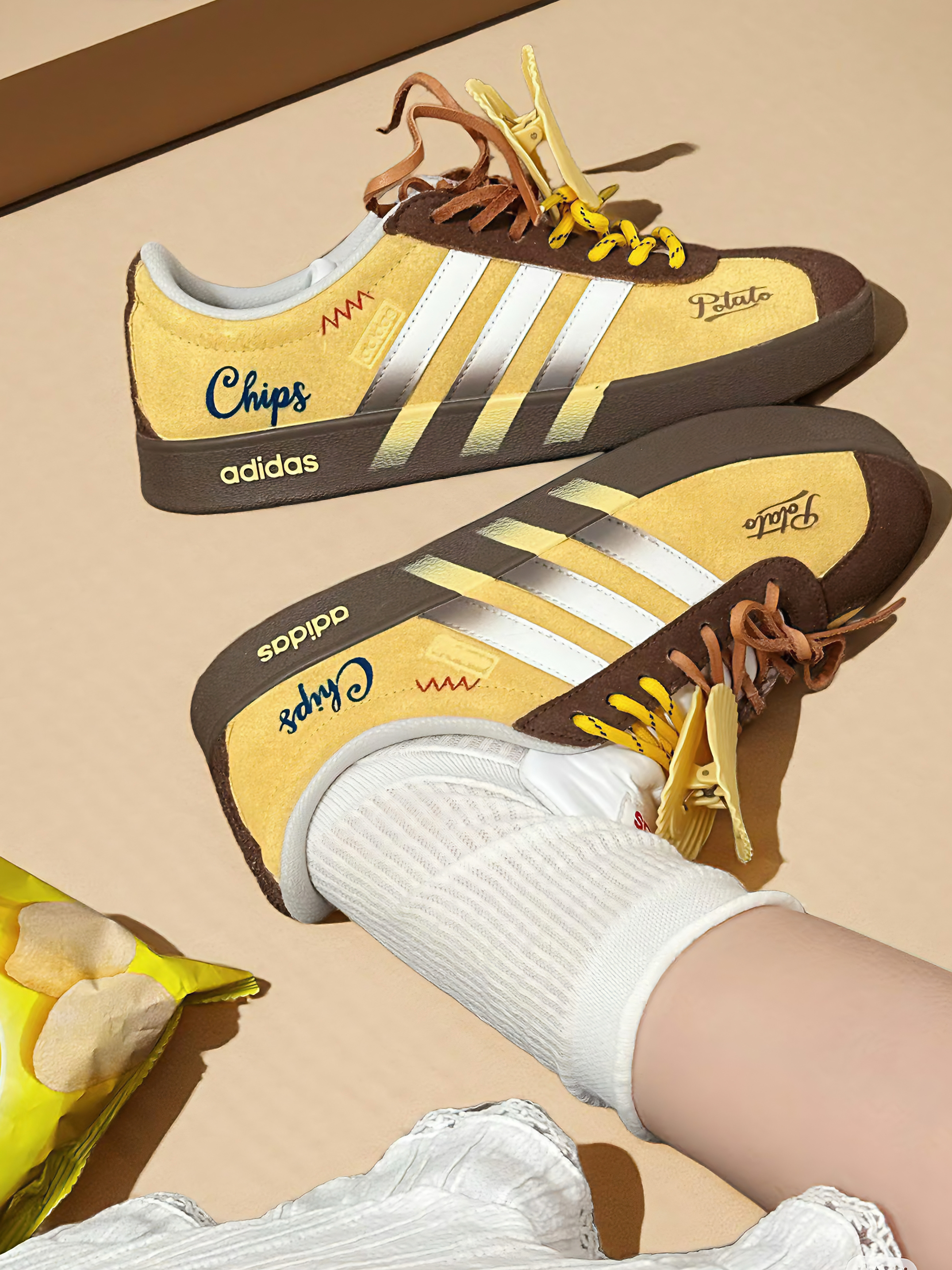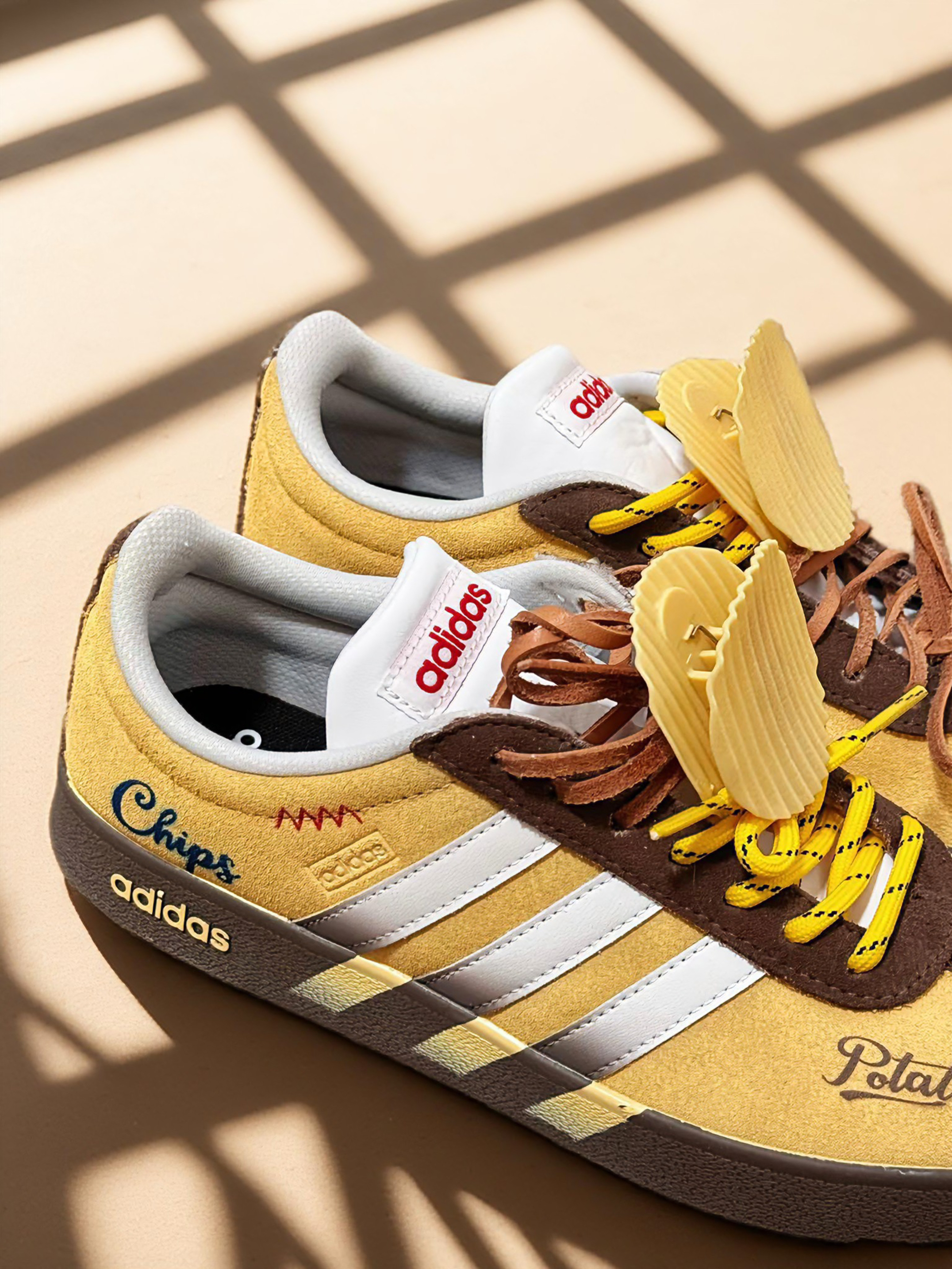 · 主题:黄棕配色与细节设计,高度还原薯片包装 · 细节:鞋身“Chips”字样,鞋带配有小夹子装饰 · 材质:麂皮鞋面,渐变三道杠,质感柔软 · 风格:复古玩趣,轻松搭配短裤、白袜等休闲服饰 一双设计有趣、适合日常穿着的主题鞋款。