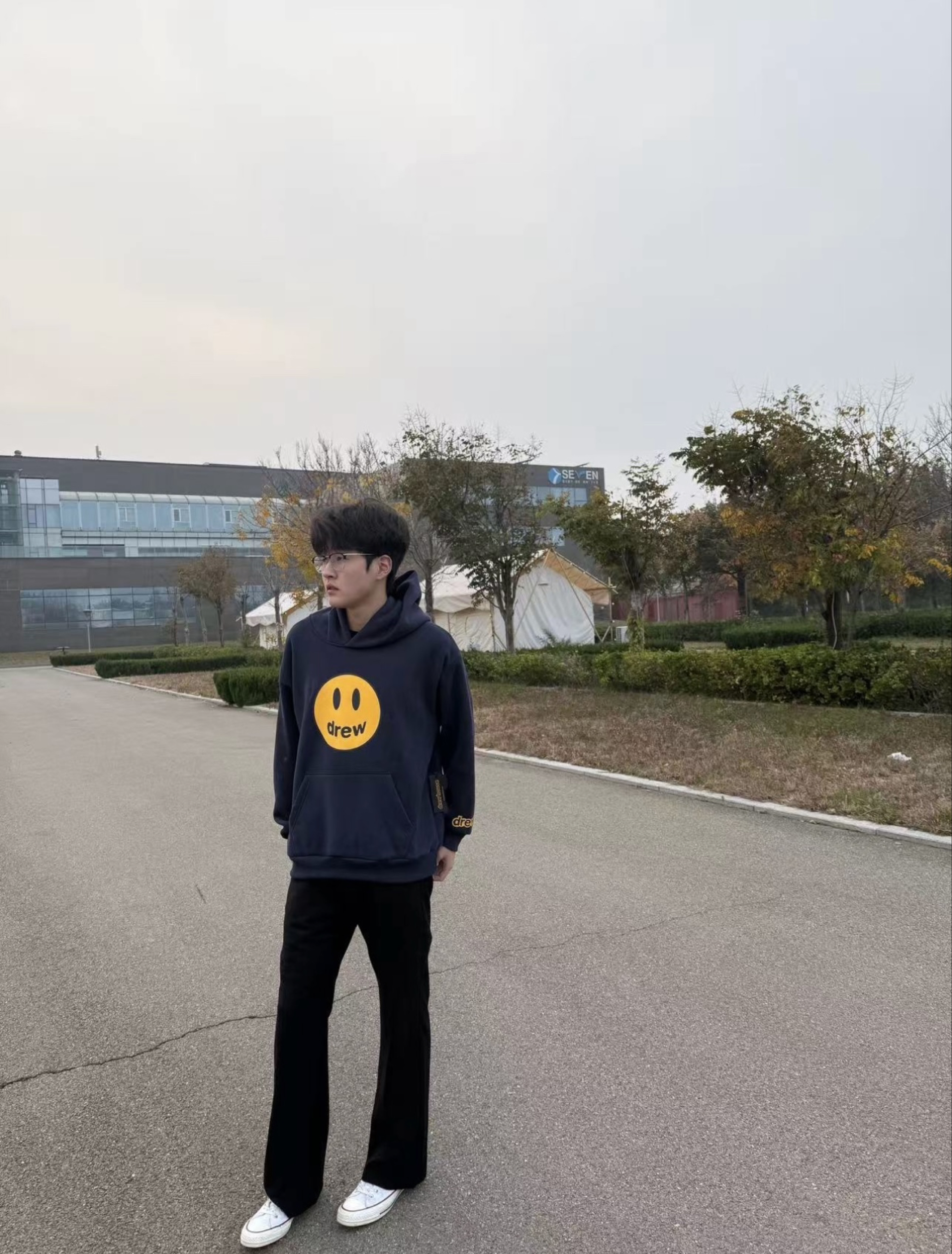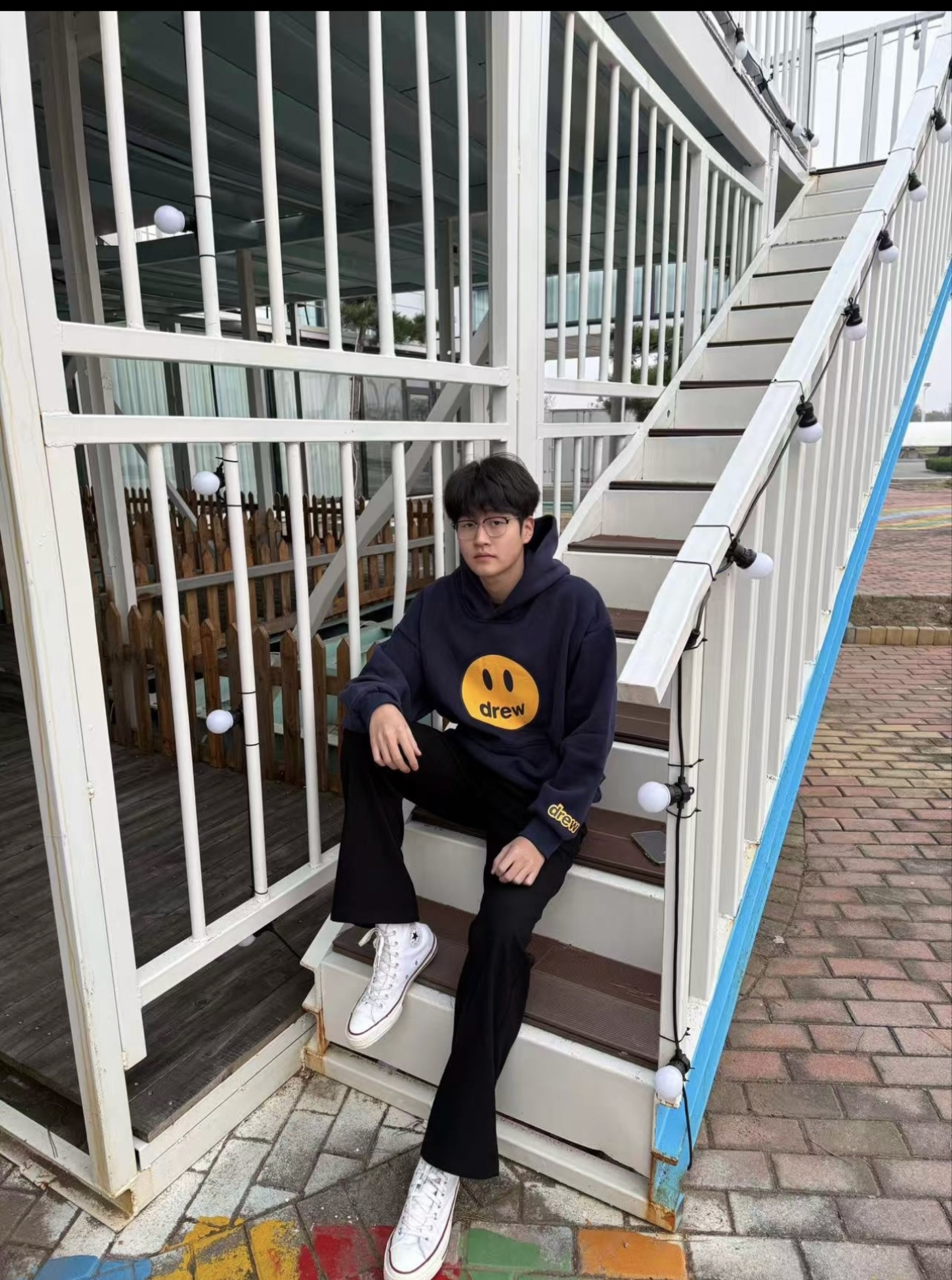 这套穿搭很适合户外休闲场景——卫衣的宽松版型活动无束缚,羽绒马甲既能抵御海风又不会显得笨重;Drew笑脸元素让基础款更有记忆点,黑灰配色低调又高级,拍照出片率很高。日常穿也很适配校园、逛街等场合,是“不用费脑但时髦度在线”的搭配,保暖性和休闲感平衡得刚好