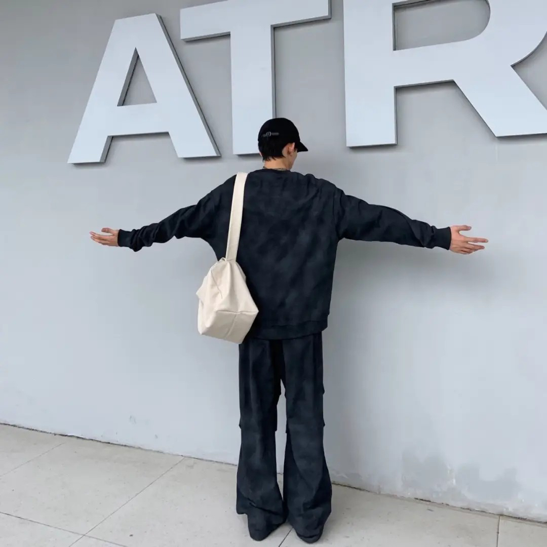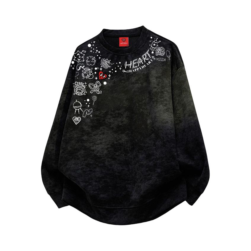 这件查尔斯桃心黑色复古脏脏扎染卫衣,直接把“街头复古风”焊在身上~ 不是死板的纯黑,是灰黑渐变的脏脏扎染,晕染边界像水墨一样自然,没有刻意的生硬感,自带做旧滤镜,潮酷感直接拉满
