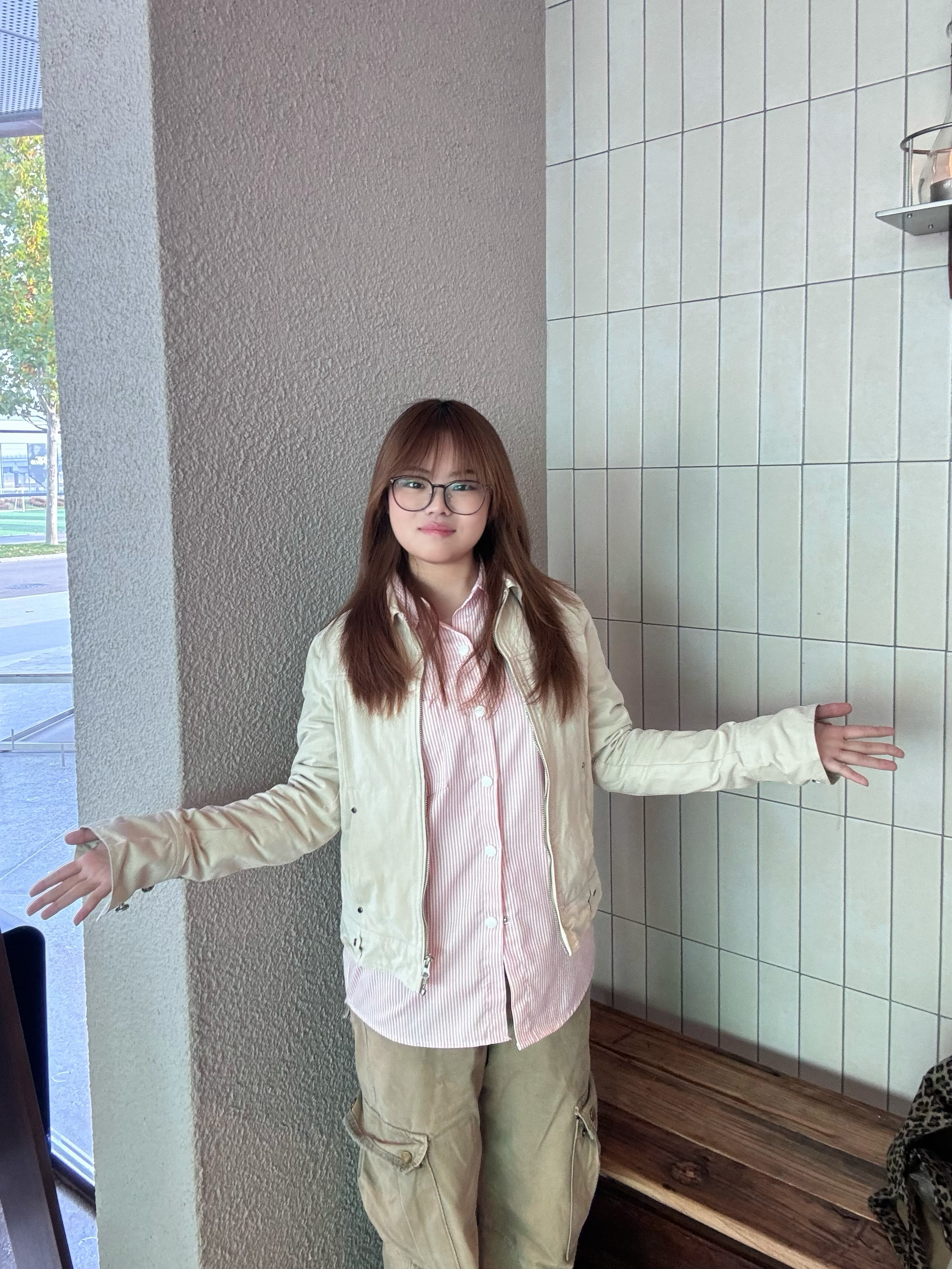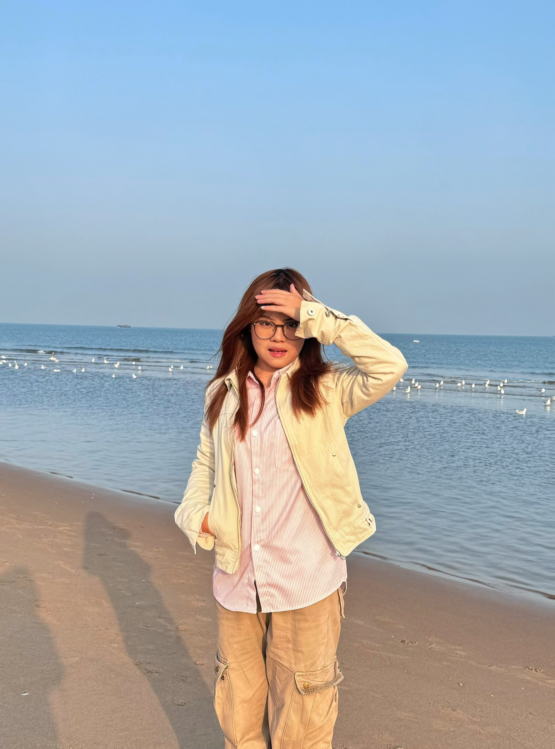 浅米色夹克+粉白条纹衬衫+卡其色工装裤,柔和色调自带春日氛围~🥰 ·夹克轻薄不臃肿,还显瘦。适合春天早晚微凉天气。 ·衬衫宽松透气,单穿/内搭都好看呢🤩 ·工装裤的口袋设计既实用又填了点酷酷的风格。