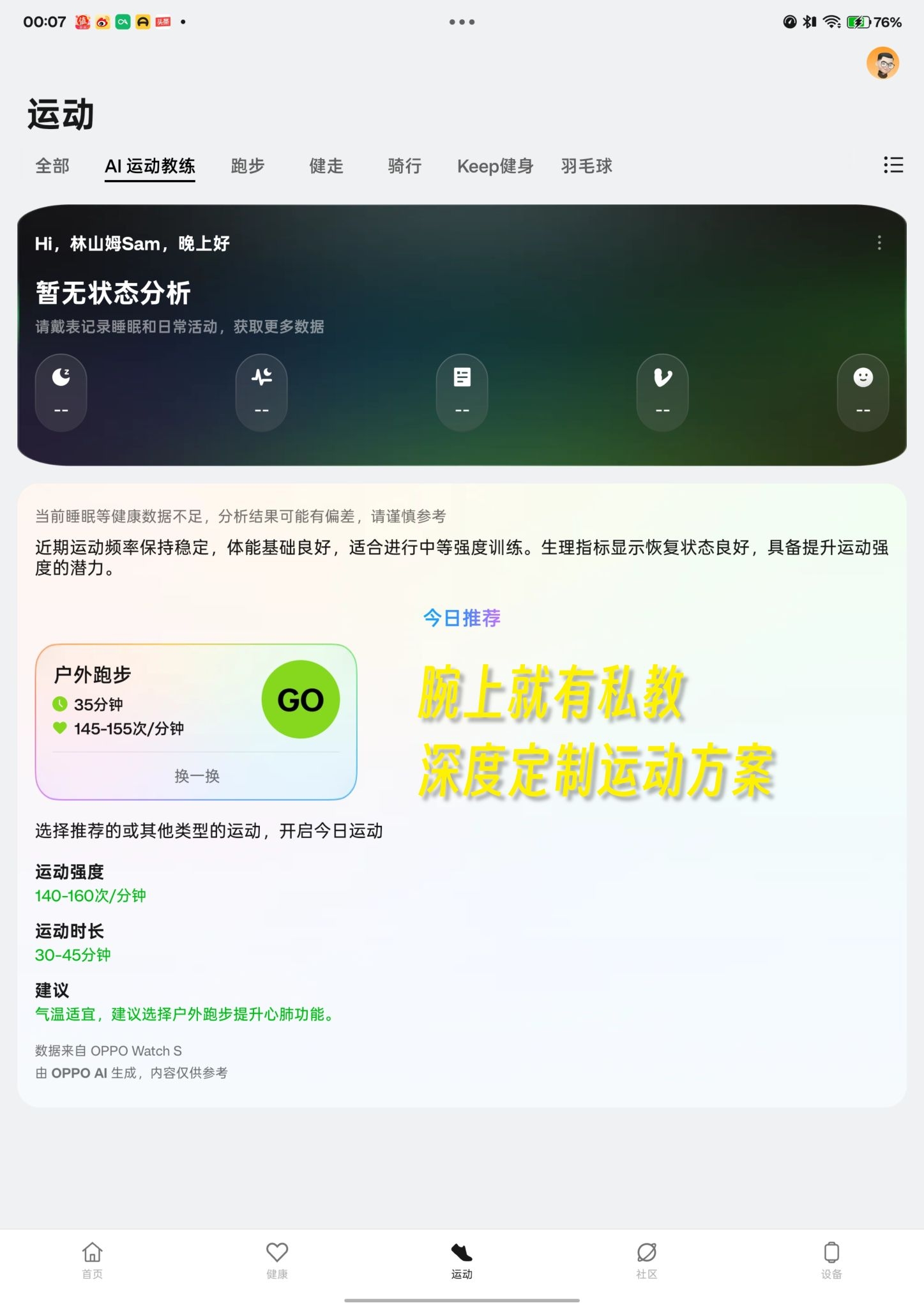 运动功能更是专业。AI运动教练能从五个维度评估身体状态,状态不好会主动劝你休息,状态好则自动安排训练计划。心率和配速自动测算,帮助科学提升成绩。双频GPS定位精准,即使在高楼林立的城市中跑步,配速误差也能控制在3秒以内。支持100多种运动模式,10多种专业模式,连爬楼梯都能精准记录。