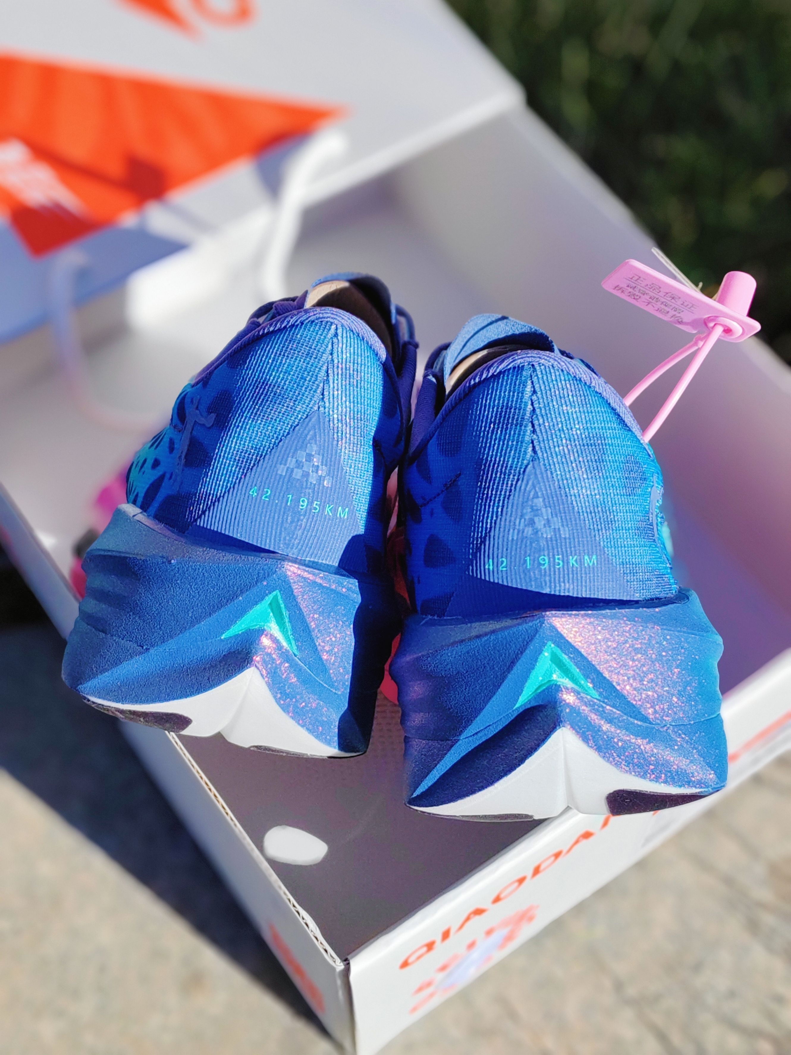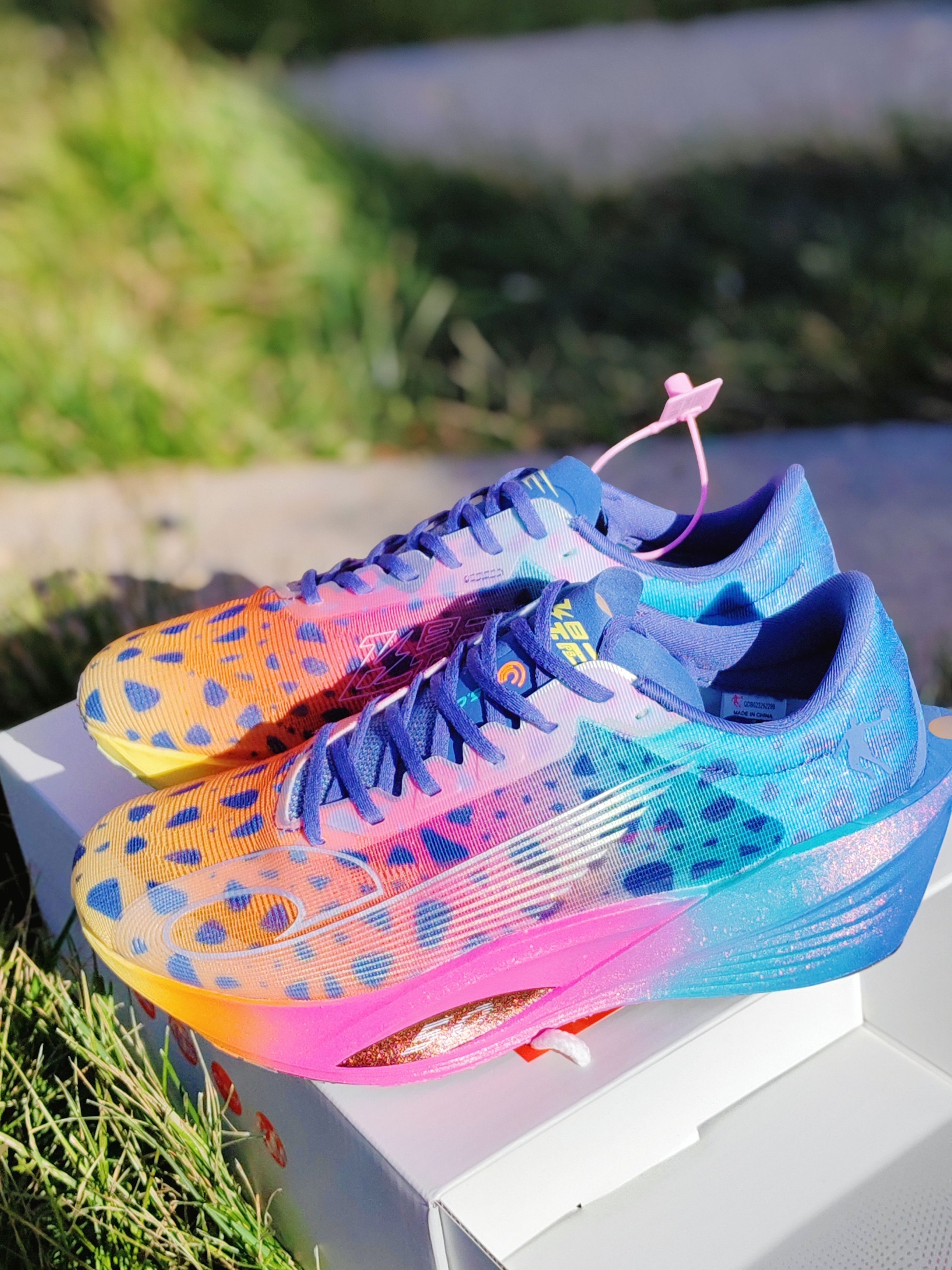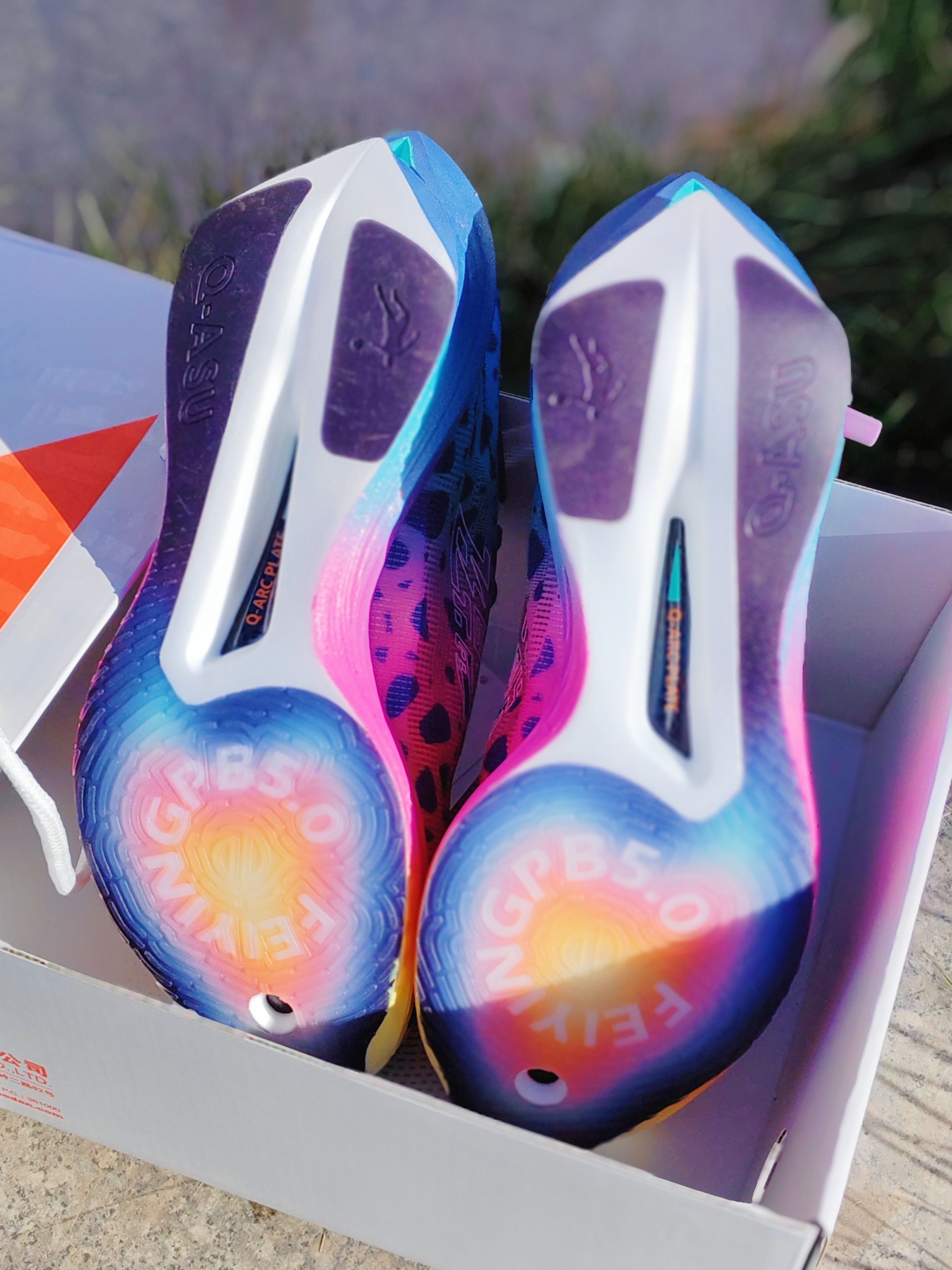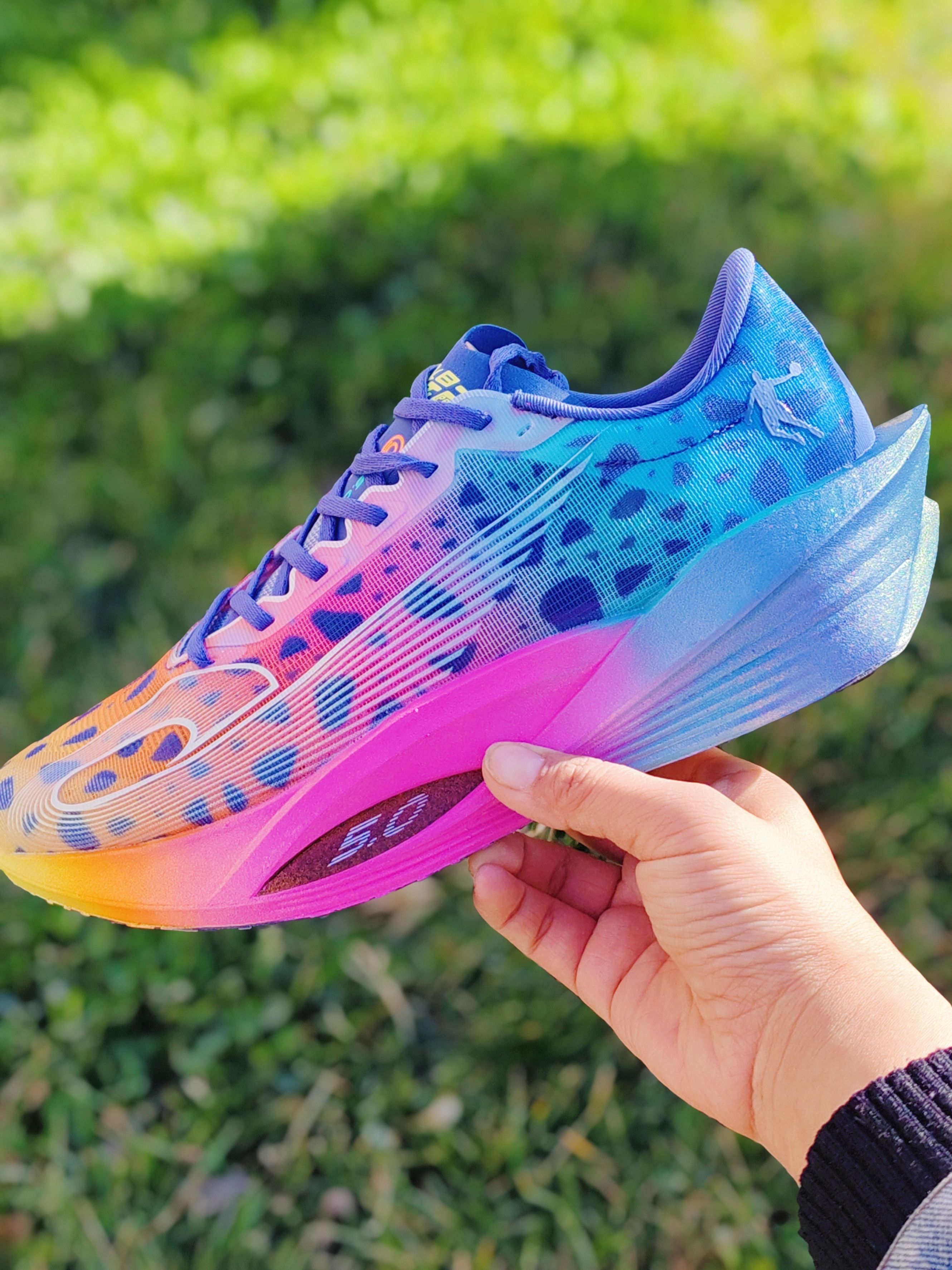 这双飞影PB5.0的黑洞配色像把银河揉进了鞋里——橙粉到蓝紫的渐变裹着星斑纹理,阳光下泛着细碎光泽,上脚自带“行走的霓虹”气场。 全掌巭PRO HP中底+铲型碳板,蹬地时的助推感像踩在弹簧上,190g超轻鞋身裹着透气巭丝鞋面,不管是竞速跑还是日常出街,潮酷与速度都能一起拿捏。