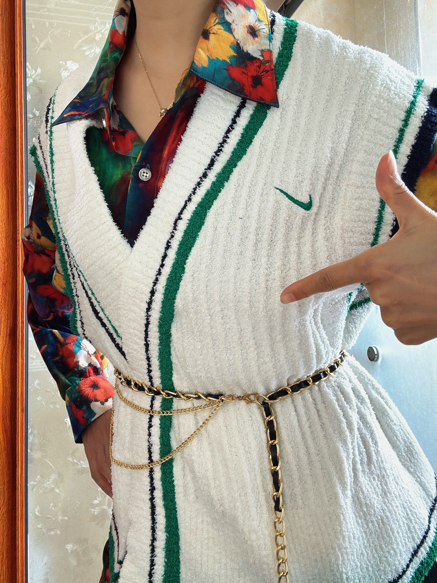 这款白绿色春秋款Nike拼色宽松针织背心,衬衫外搭,室内户外出行都很适合,内里可以随便搭配一件衬衫,看起来就特别显高级,下身搭配短裙或短裤,再配一双马丁靴,简直不要太好看!关键是现在价格也香,性价比高,喜欢这样超酷酷女孩穿搭的,都赶紧入手吧。💕#宝藏针织开衫分享 #今日份穿搭氛围感披肩