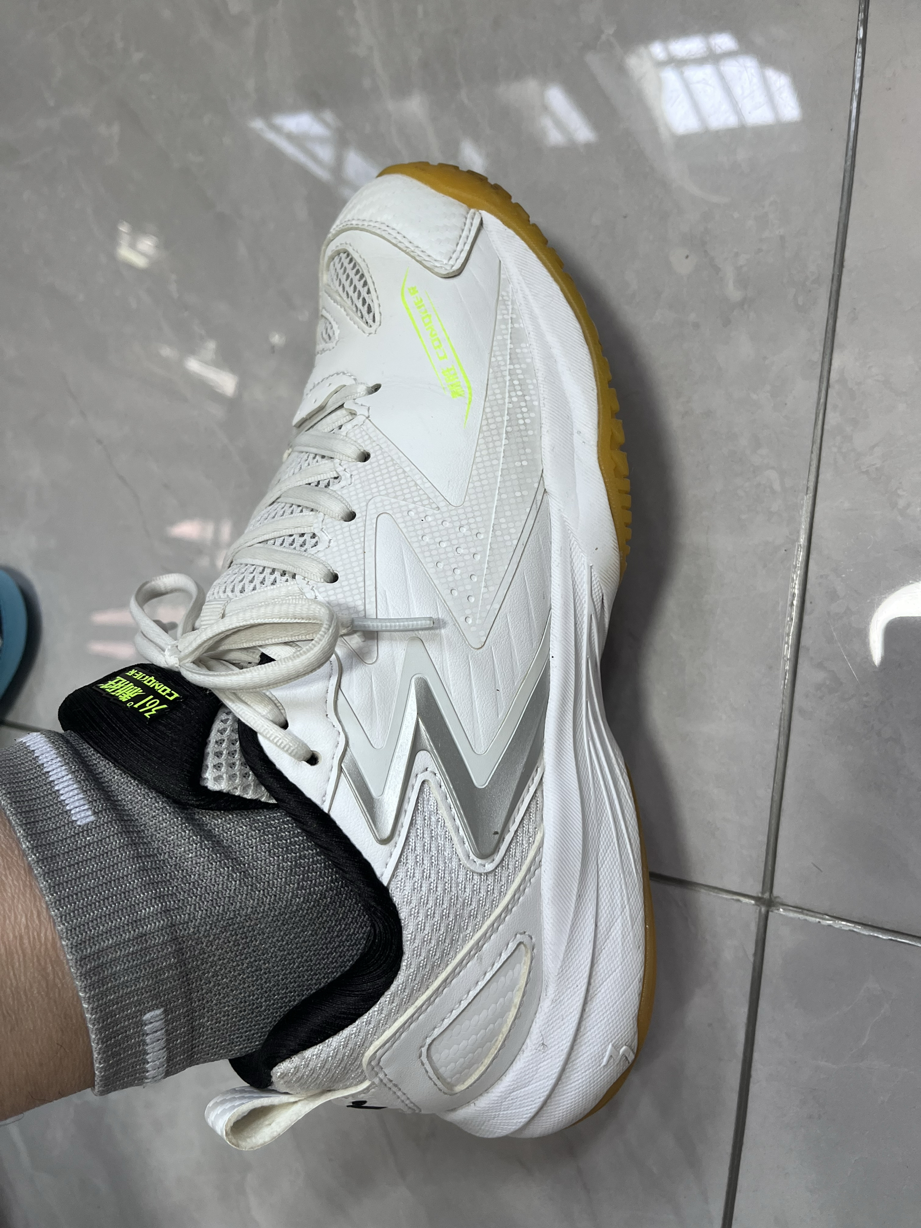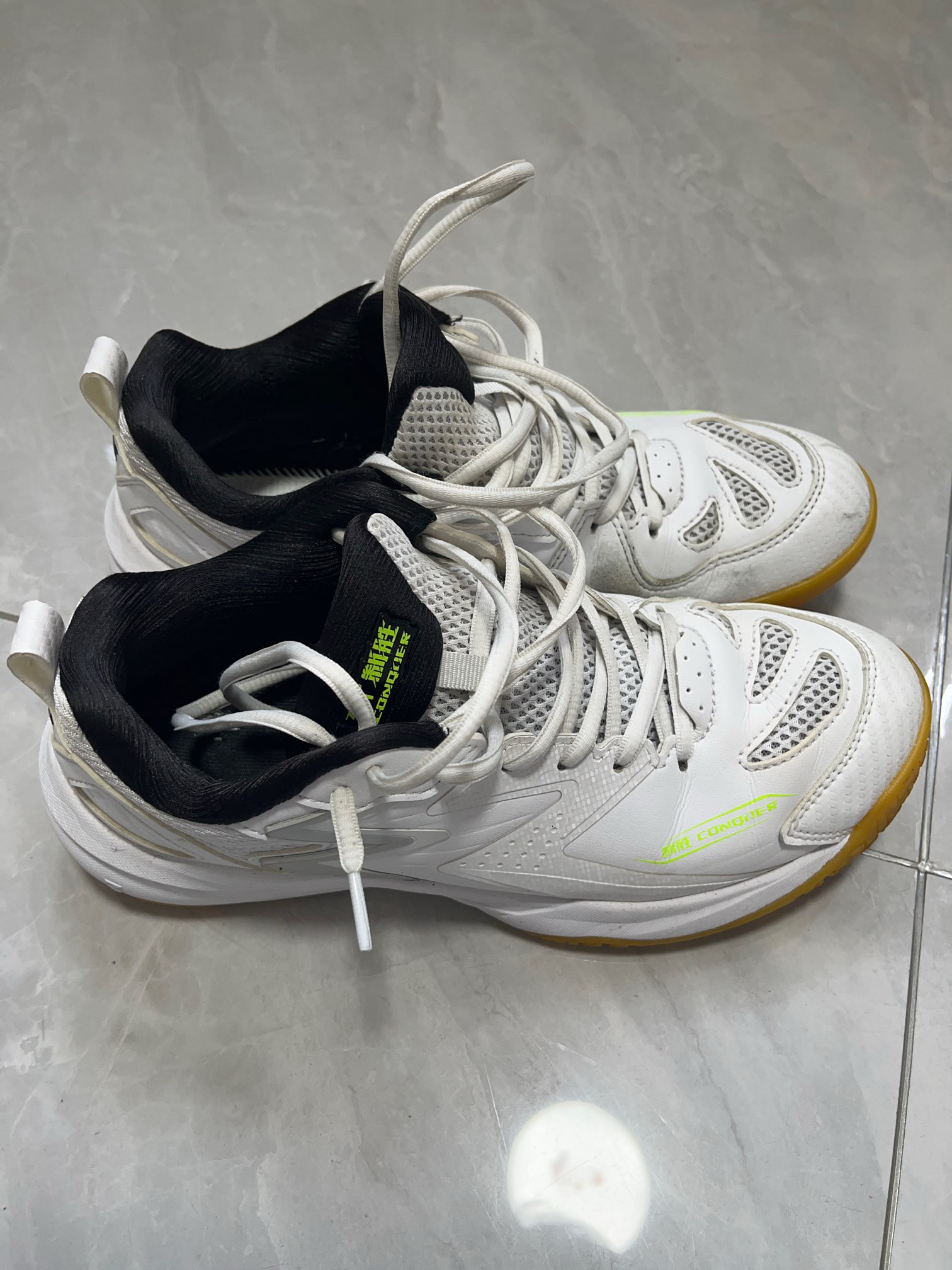 🌟 颜值暴击!白黑绿配色美到失语 第一眼就被戳中!纯净白鞋身+黑色鞋舌/鞋口,侧边点缀荧光绿线条,像给鞋子戴了条“运动项链”~ 鞋舌上“361°制胜 CONQUER”的黑绿字母超吸睛,低调又有态度! 🔥 性能封神!脚感/实用度双拉满 别以为它只是样子货!从里到外全是小心机: ✅ 透气网眼鞋面:脚面是蜂窝状透气网布,夏天穿不闷汗!我上周打2小时球,脱鞋居然没“蒸桑拿”感~ ✅ 防滑大底+定...