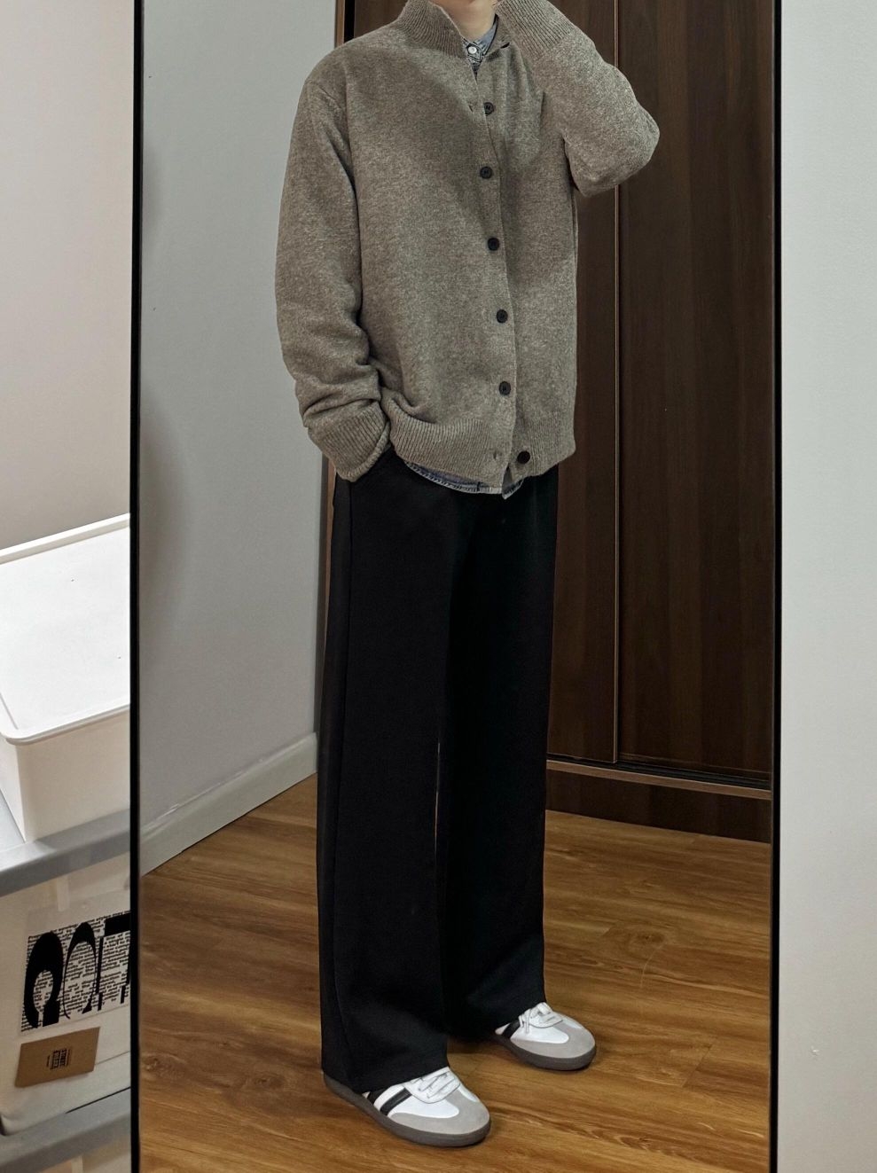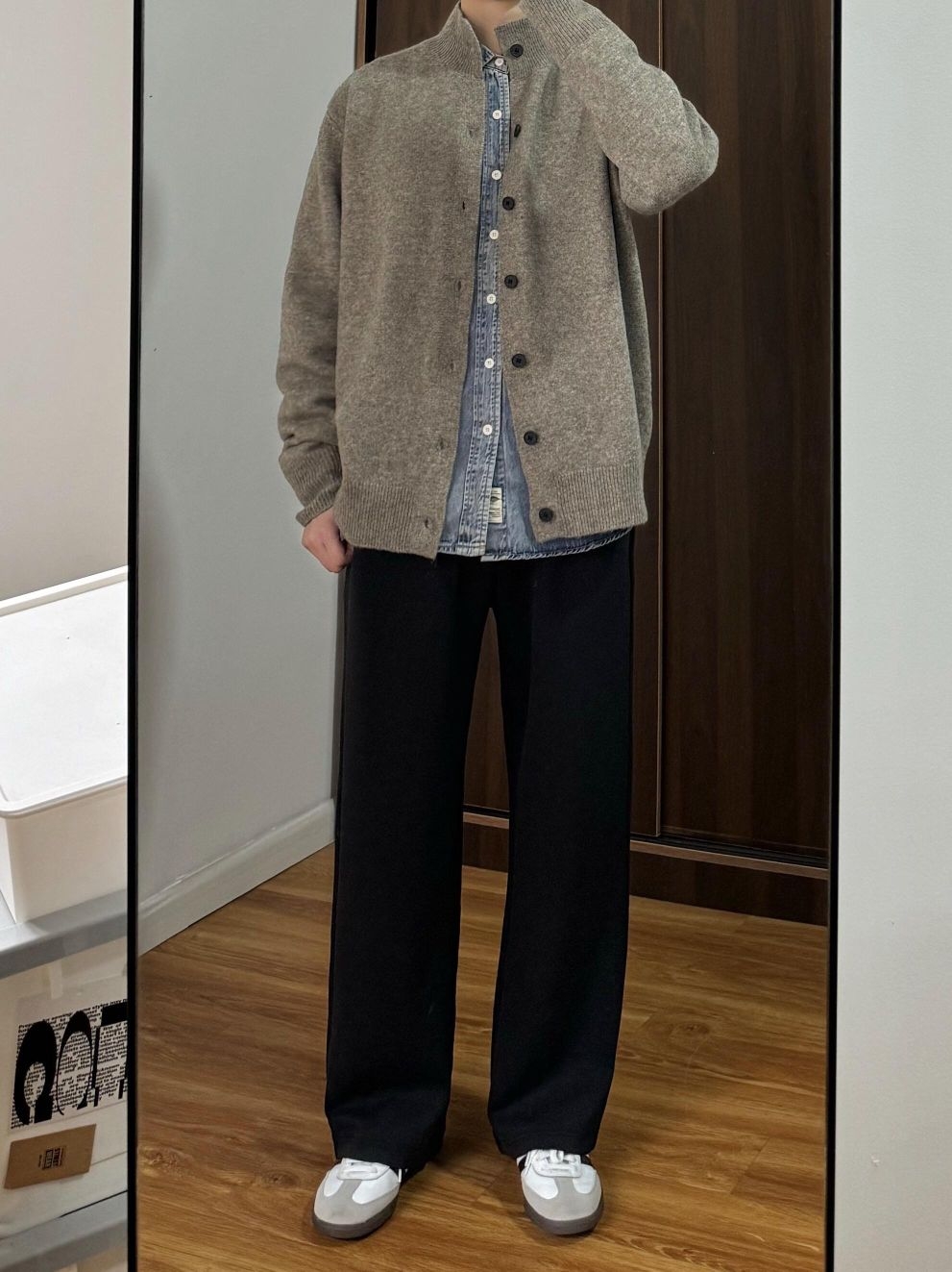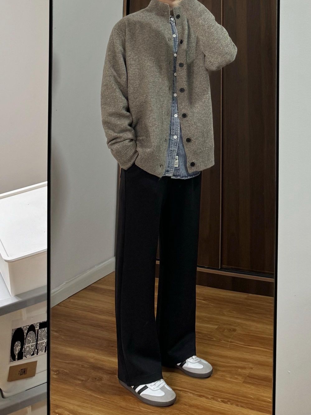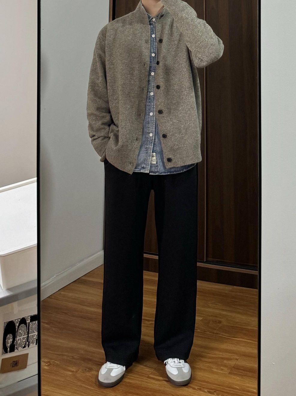 灰色开衫的松弛感,牛仔衬衫的复古调,再配上一条走路带风的阔腿裤——这套OOTD把舒适和时髦都写在身上了。 不用力,却足够有型;不刻意,但细节满分。无论是宅家放松还是出门小聚,这一身都能轻松接住各种场合。 ✨ 穿搭亮点: - 浅灰开衫 + 牛仔衬衫,层次感瞬间拉满 - 黑色阔腿裤修饰腿型,慵懒又有范儿 - 灰白运动鞋点亮整体,走路舒适不累脚 适合喜欢简约休闲风的你,轻松穿出“随便搭都好看”的...