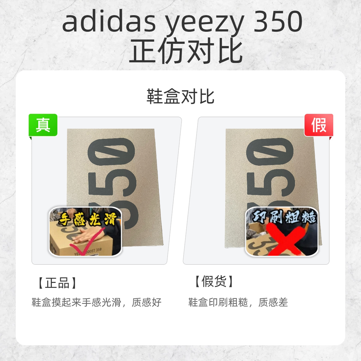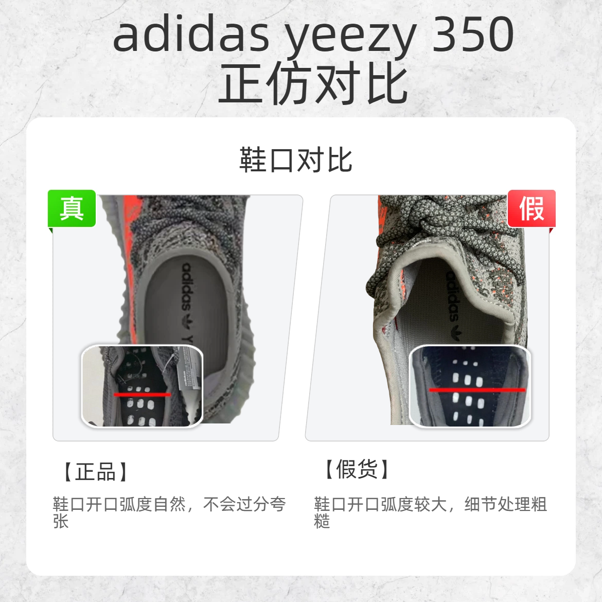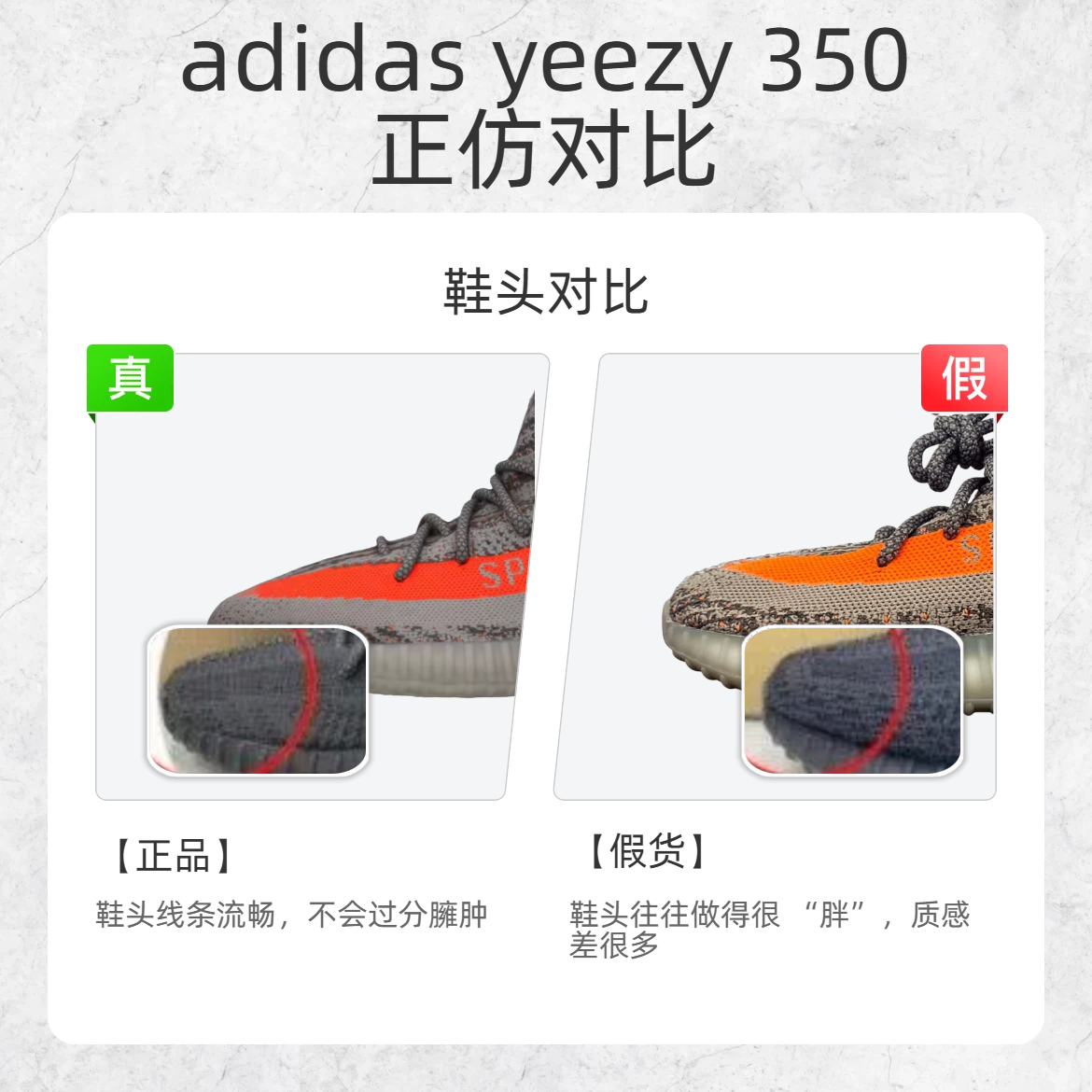 买 Adidas Yeezy 350 怕踩雷?教你几招快速辨别真假,轻松避坑! 🔍一、看鞋头 - 鞋头:正品鞋头线条流畅,不会过分臃肿;仿品鞋头往往做得很 “胖”,质感差很多。 🔍二、看鞋口 - 鞋口开口:正品鞋口开口的弧度自然,不会过于夸张;仿品鞋口开口的弧度生硬,细节处理粗糙。 📦三、看鞋盒 - 正品鞋盒手感光滑,印刷清晰有质感;仿品鞋盒印刷粗糙,摸起来质感差,有的甚至会有 “三无” 字...