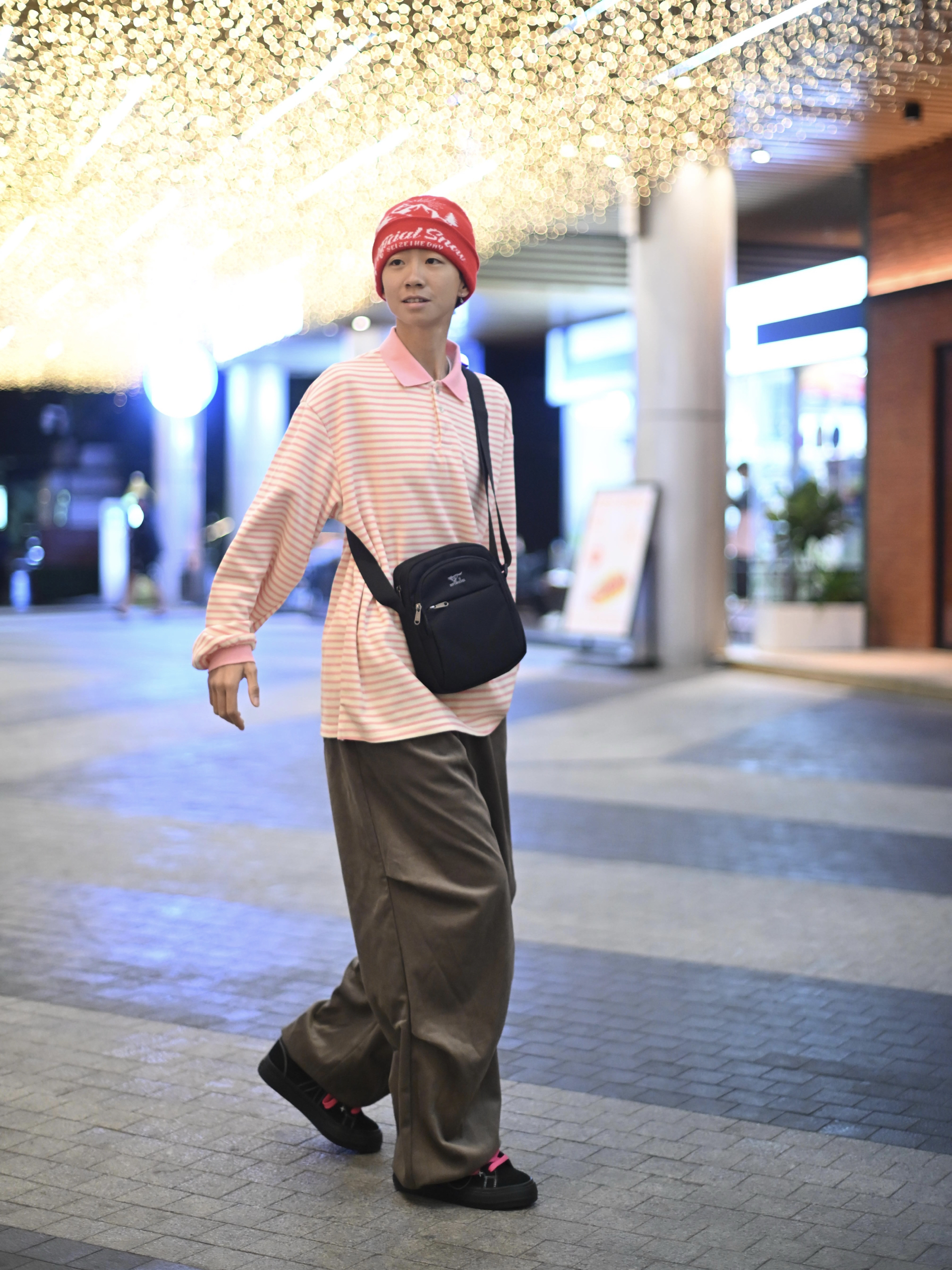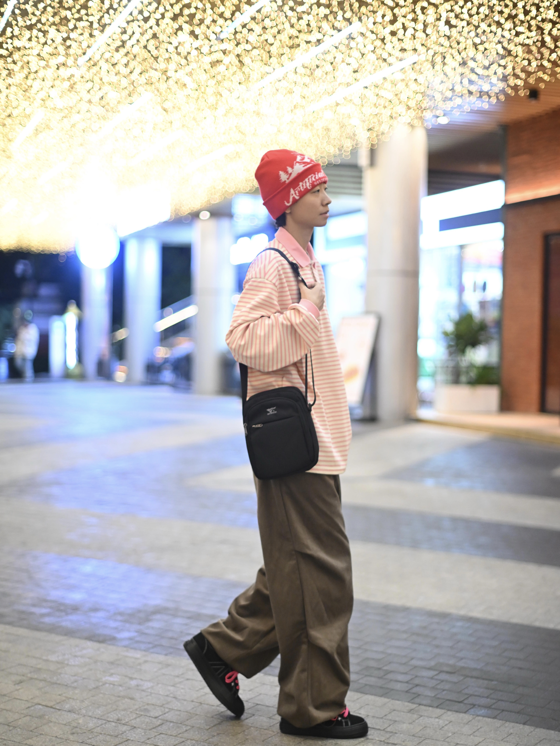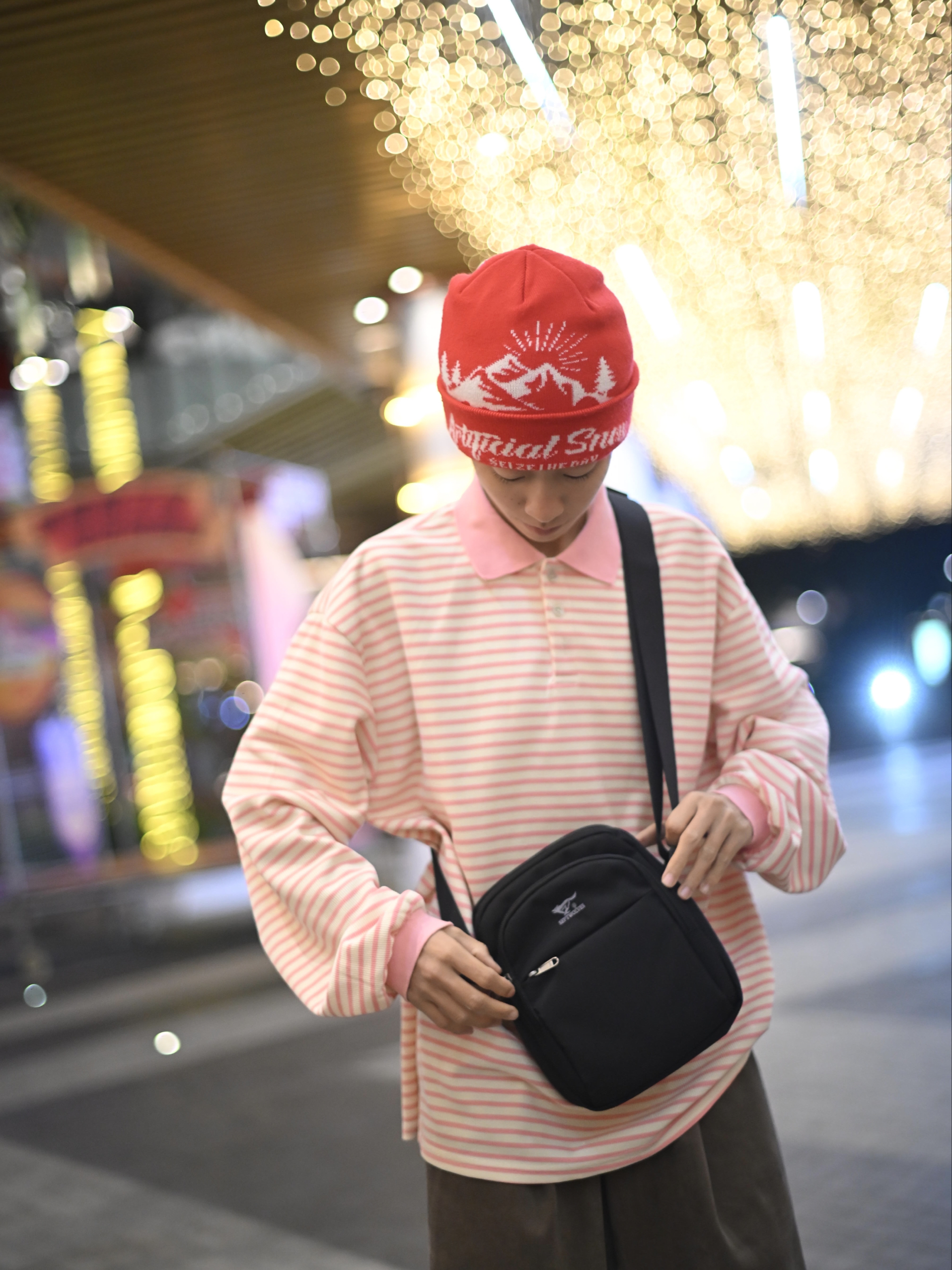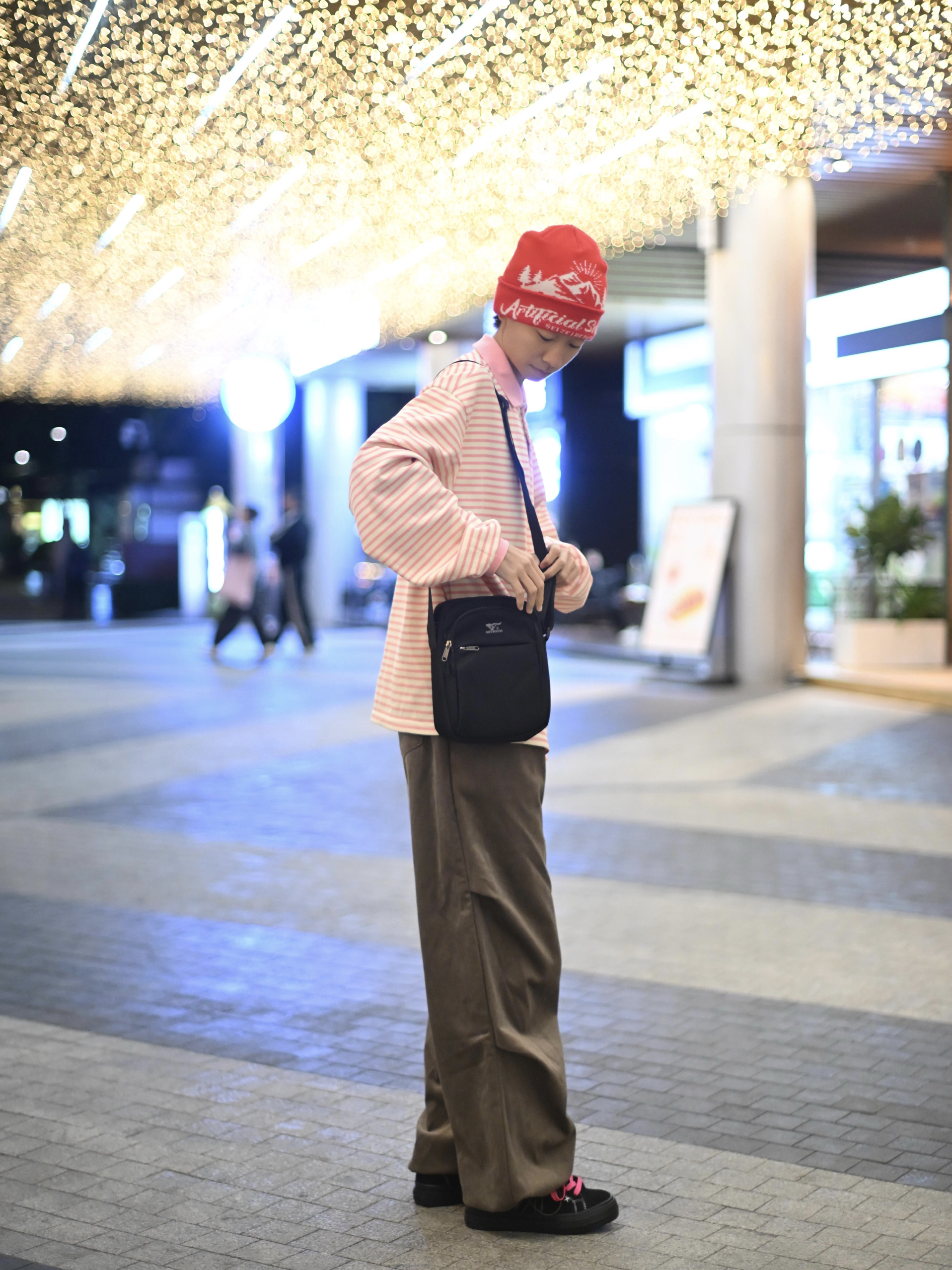 172CM|55KG 👔:m👖:m|👟:39码 滴滴滴,秋冬穿搭的质感往往藏在细节里 这次用一件粉白条纹上衣搭配卡其色阔腿裤 红色针织帽为灰调季节注入一抹暖意。 背上俺的七匹狼黑色斜挎包——轻巧能装的设计悄悄融入造型!