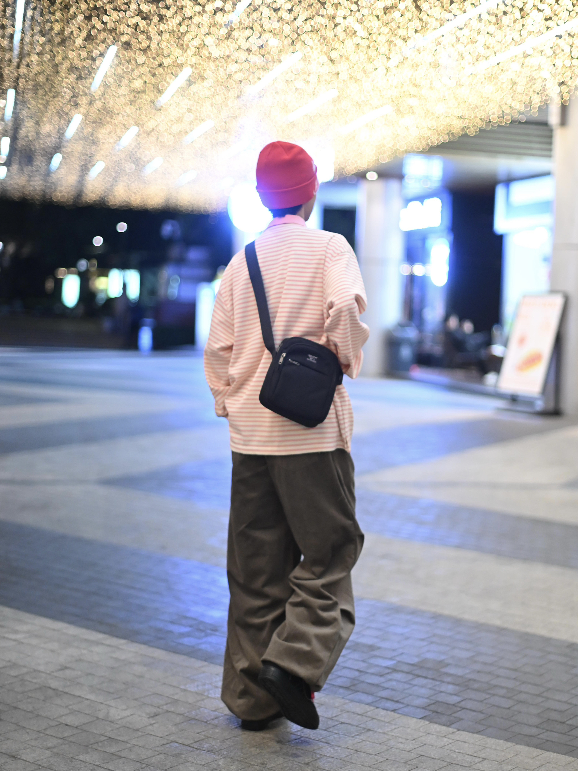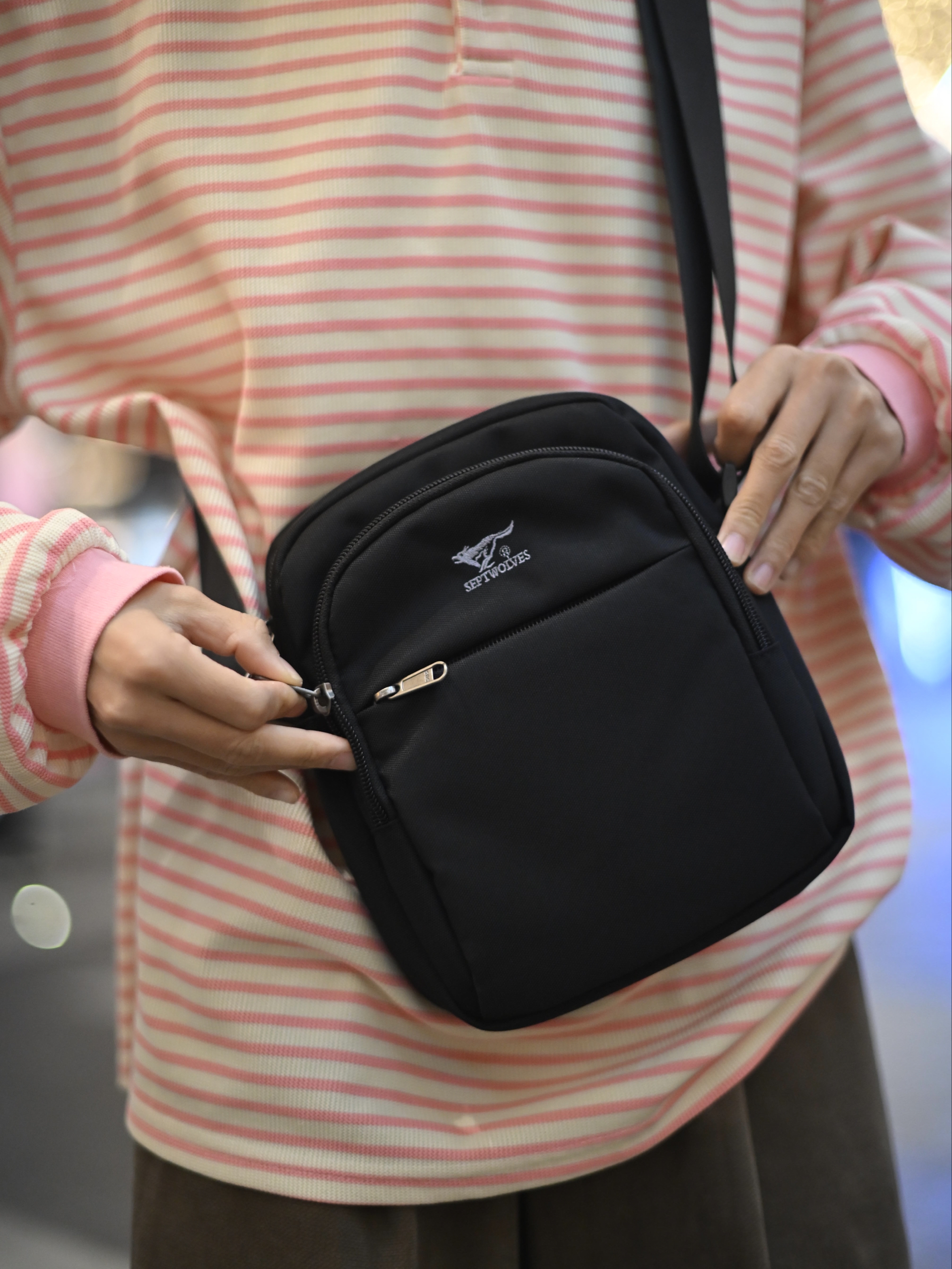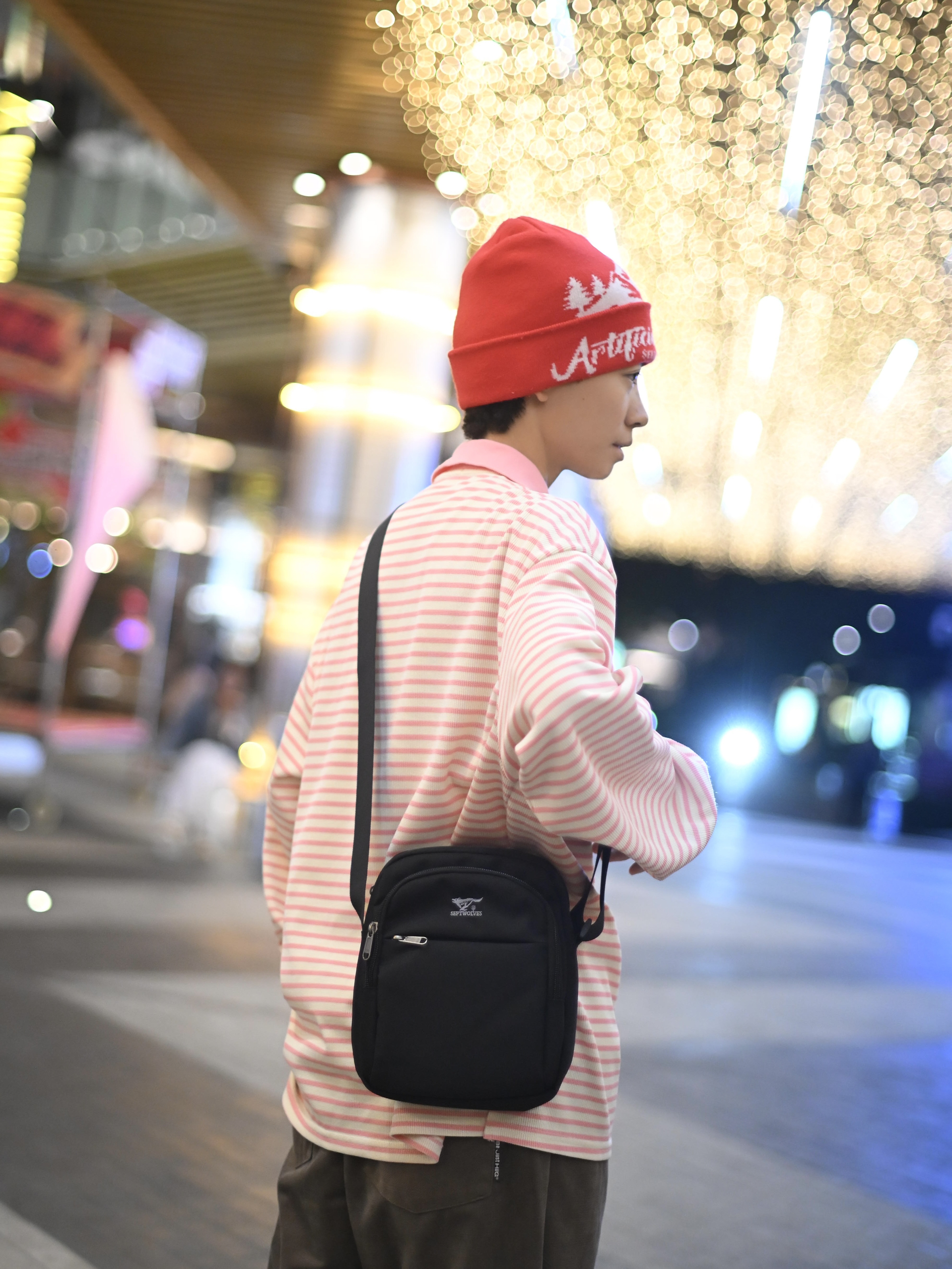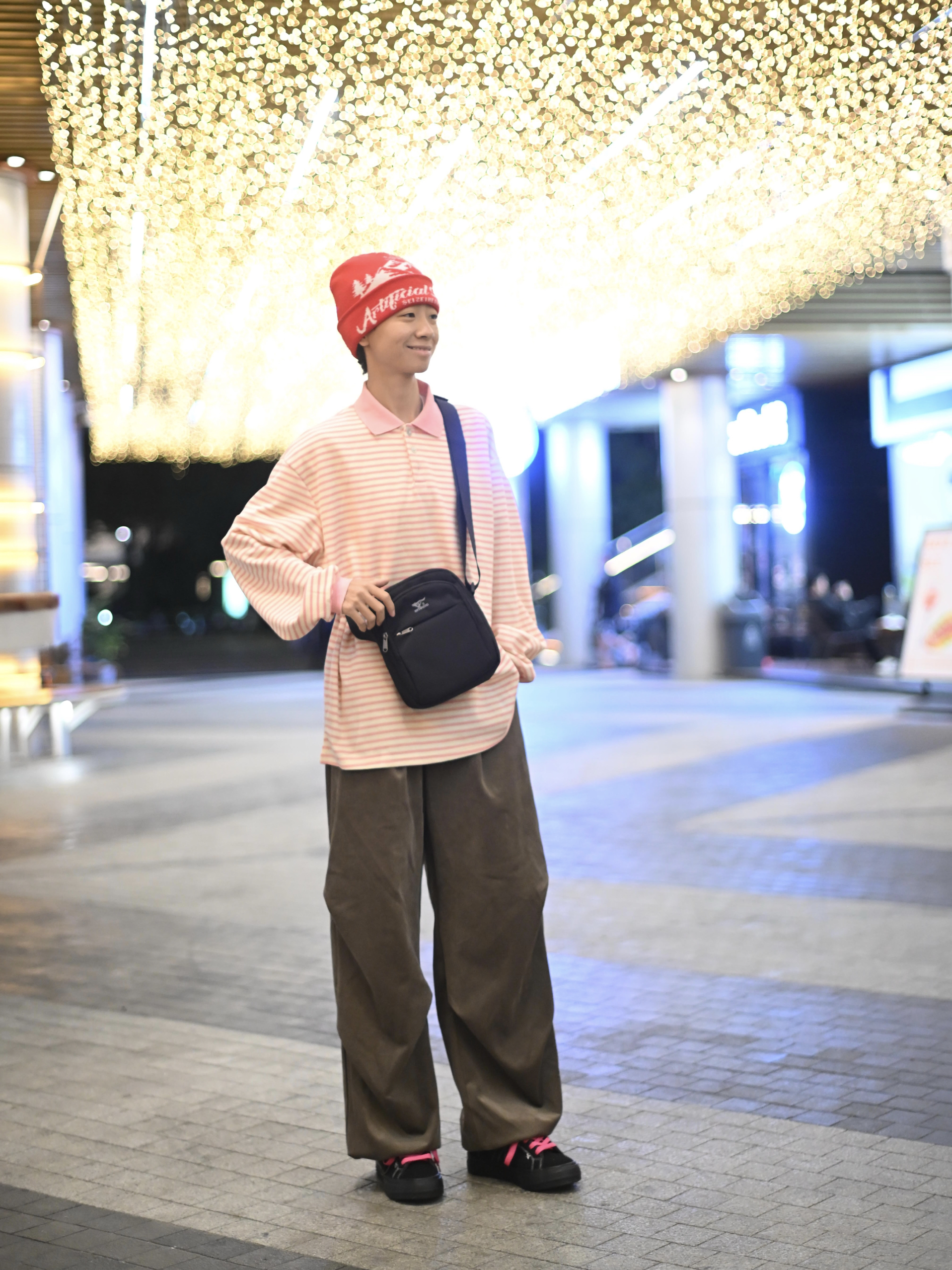 172CM|55KG 👔:m👖:m|👟:39码 滴滴滴,秋冬穿搭的质感往往藏在细节里 这次用一件粉白条纹上衣搭配卡其色阔腿裤 红色针织帽为灰调季节注入一抹暖意。 背上俺的七匹狼黑色斜挎包——轻巧能装的设计悄悄融入造型!