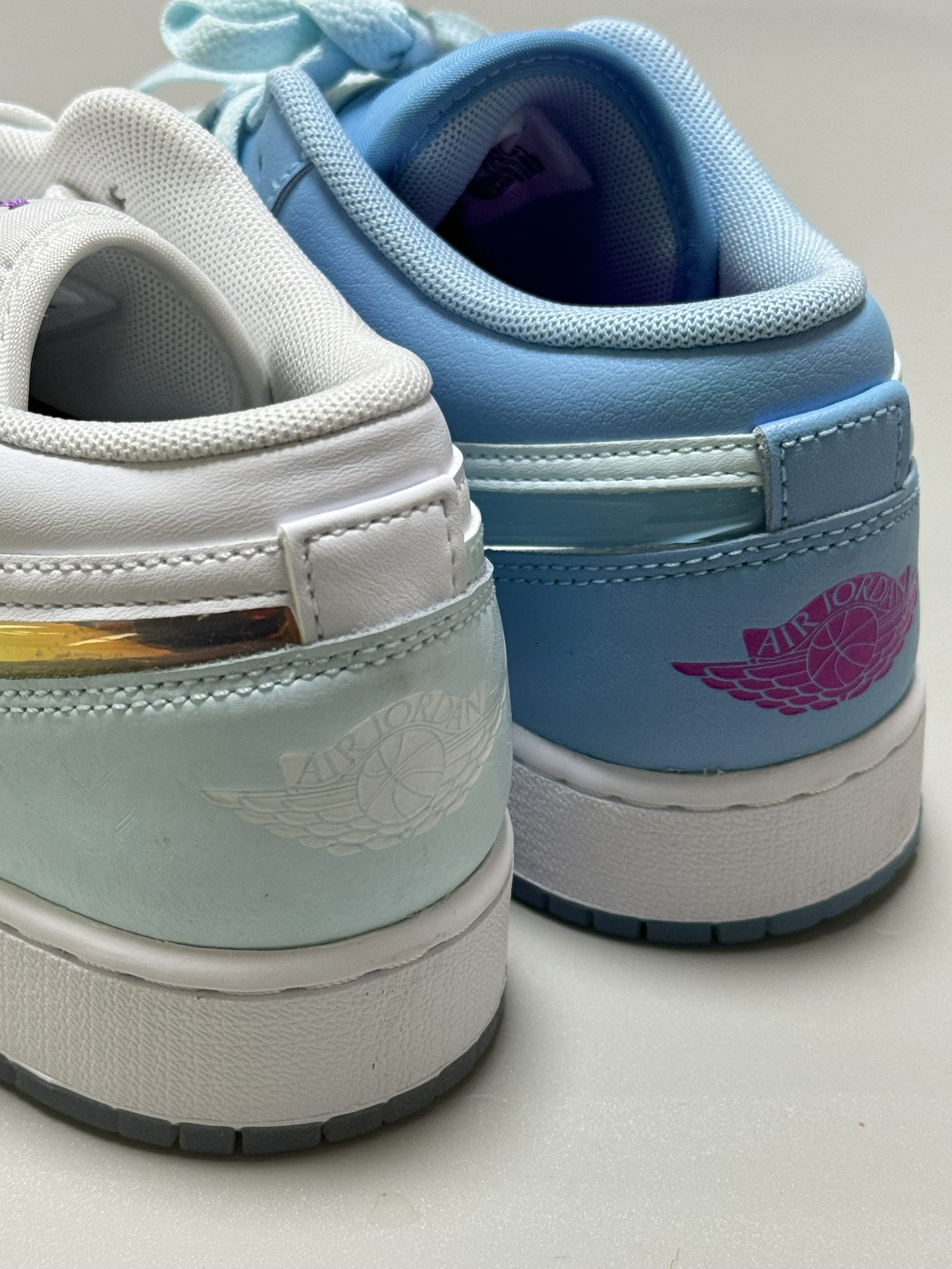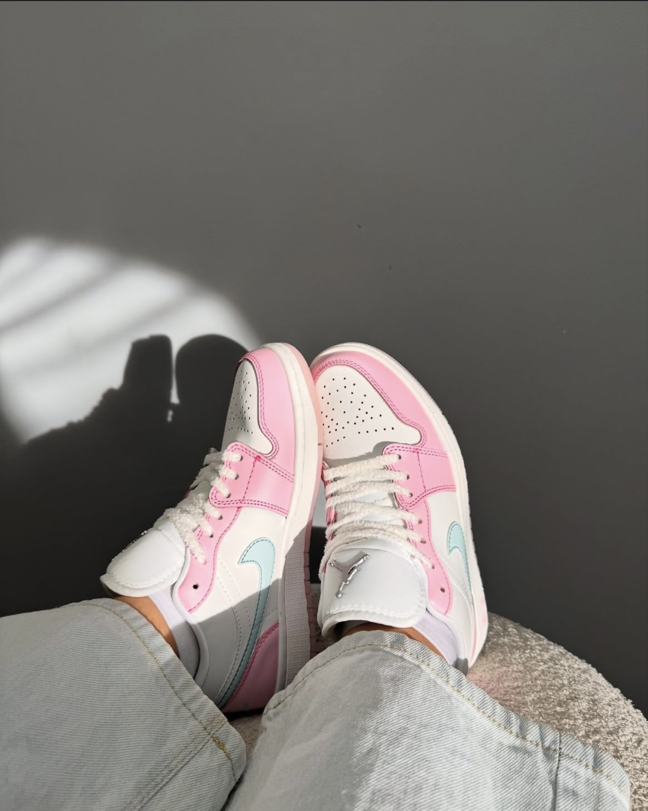 谁懂啊!刚上脚这双AJ1 Low就被闺蜜追着要链接——粉白打底裹着奶蓝勾边,像把春日樱花和薄荷糖揉进了鞋里🌸 鞋头的透气孔是细腻的圆点排列,衬得粉白拼接更软乎乎;鞋舌的飞人标是银灰色金属质感,甜里还藏着点酷劲儿~ 最戳我的是自己换的毛绒鞋带!奶白色绒圈裹着鞋身,踩在阳光里连影子都泛着软fufu的甜,配浅蓝牛仔裤刚好中和了甜腻感,随便拍都像韩系博主的日常ootd📸