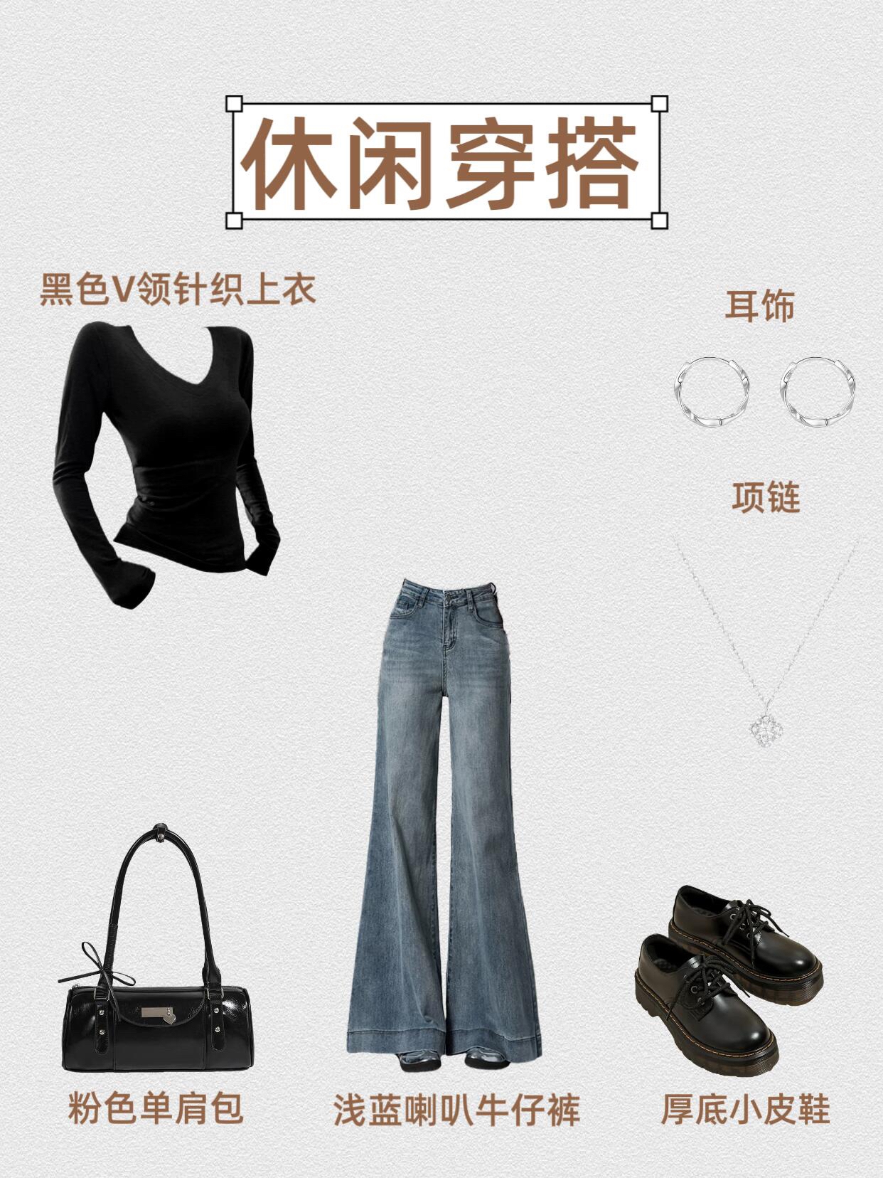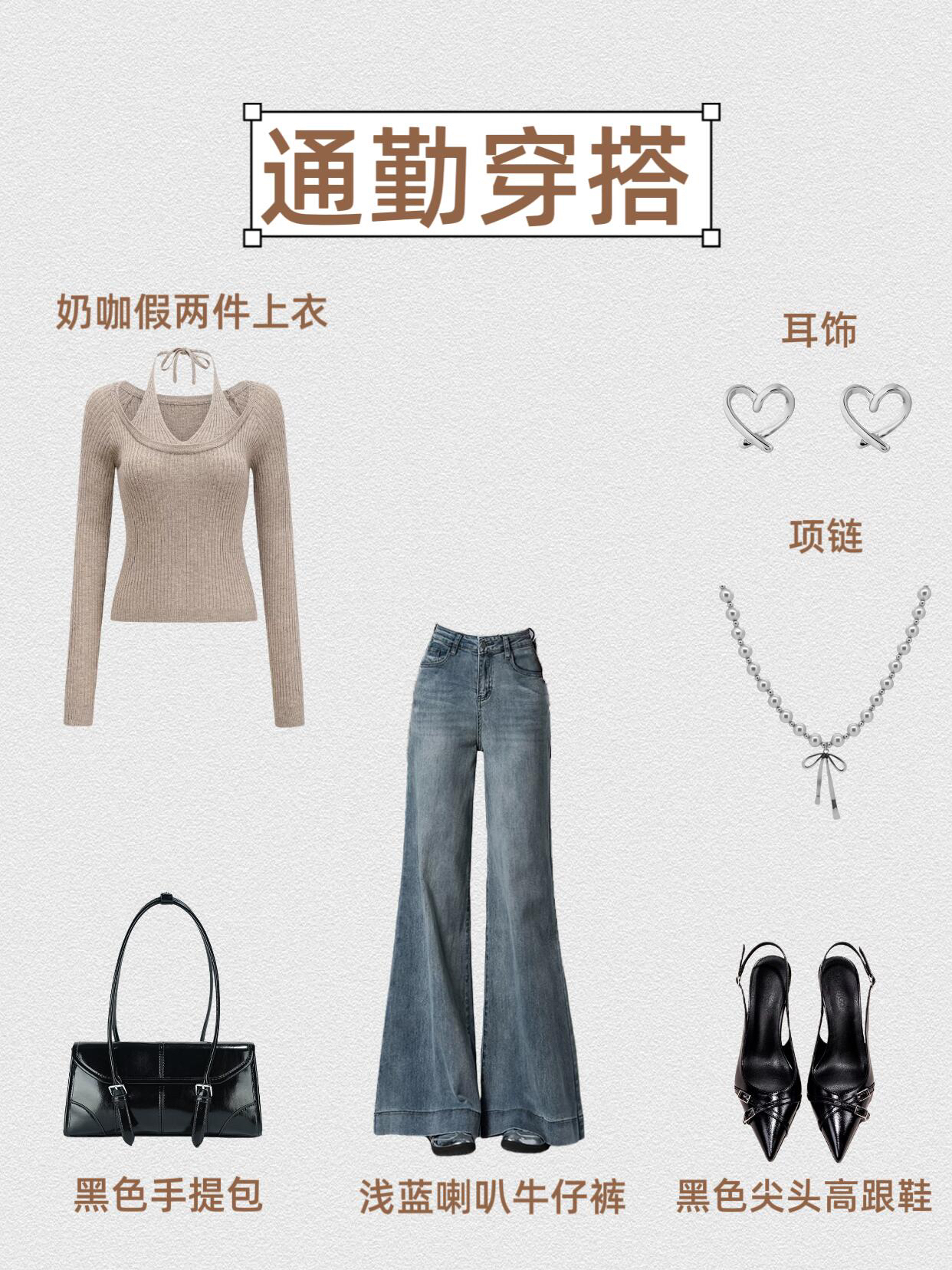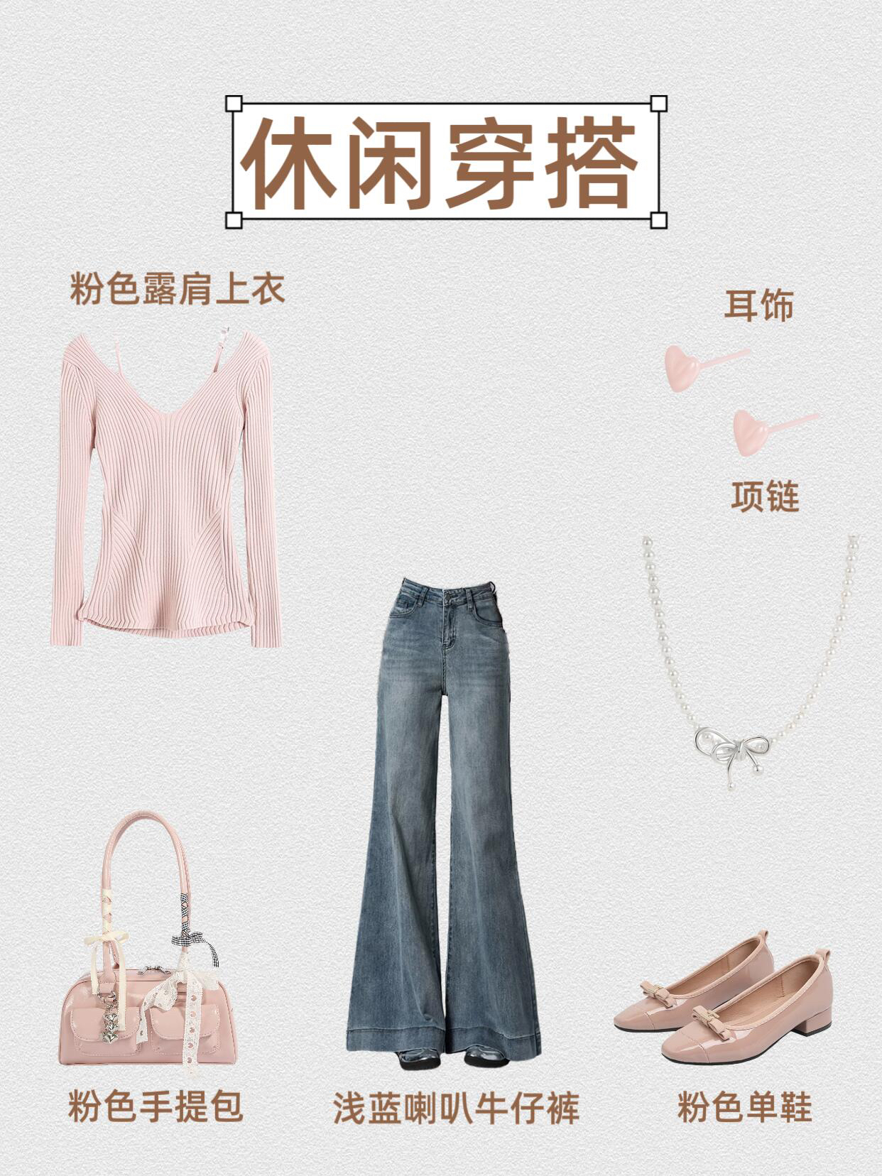 第1⃣套:干练通勤风 V领白衬衫+浅蓝喇叭牛仔裤+黑色高跟凉鞋+黑色腋下包+银色耳饰+环形项链 第2⃣套:甜酷休闲风 黑色V领针织上衣+浅蓝喇叭牛仔裤+厚底小皮鞋+粉色单肩包+银色耳饰+花朵项链 第3⃣套:温柔休闲风 粉色露肩上衣+浅蓝喇叭牛仔裤+粉色单鞋+粉色手提包+粉色耳饰+珍珠项链 第4⃣套:复古通勤风 奶咖假两件上衣+浅蓝喇叭牛仔裤+黑色尖头高跟鞋+黑色手提包+心形耳饰...
