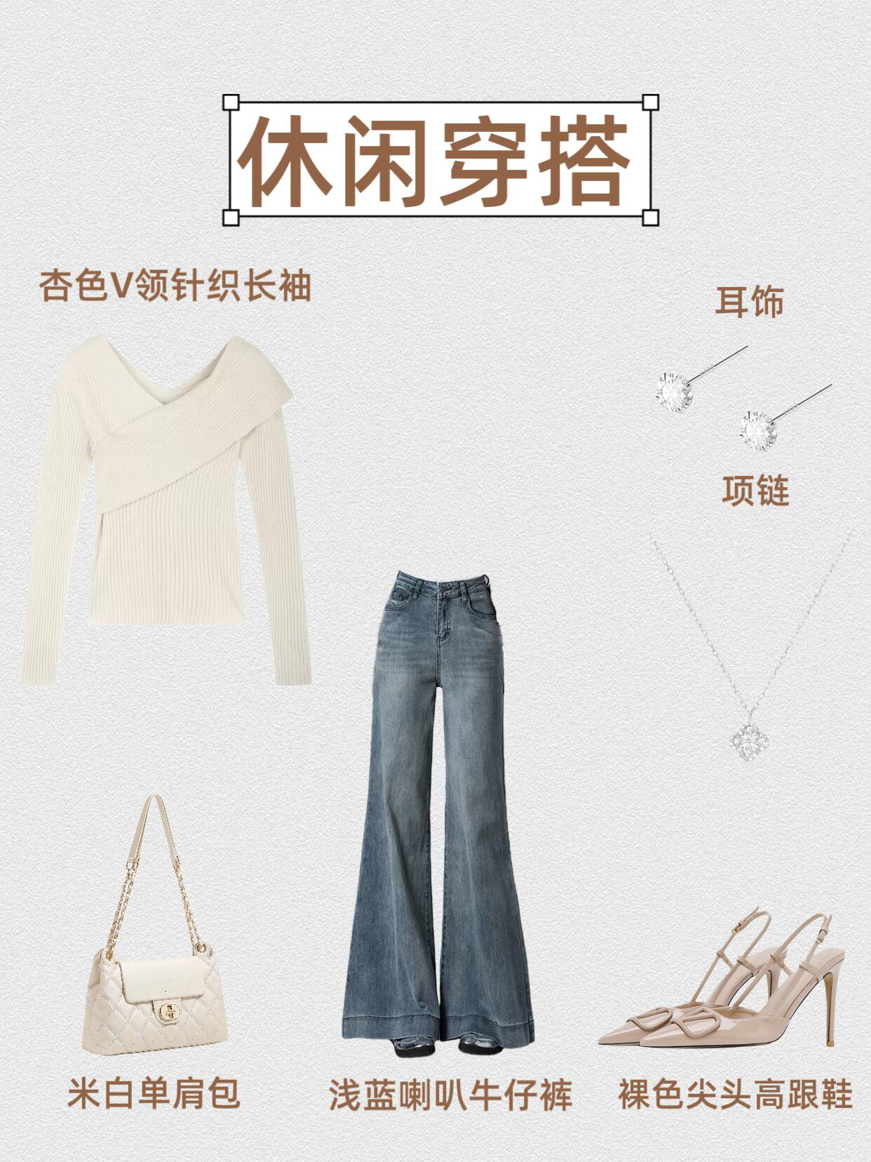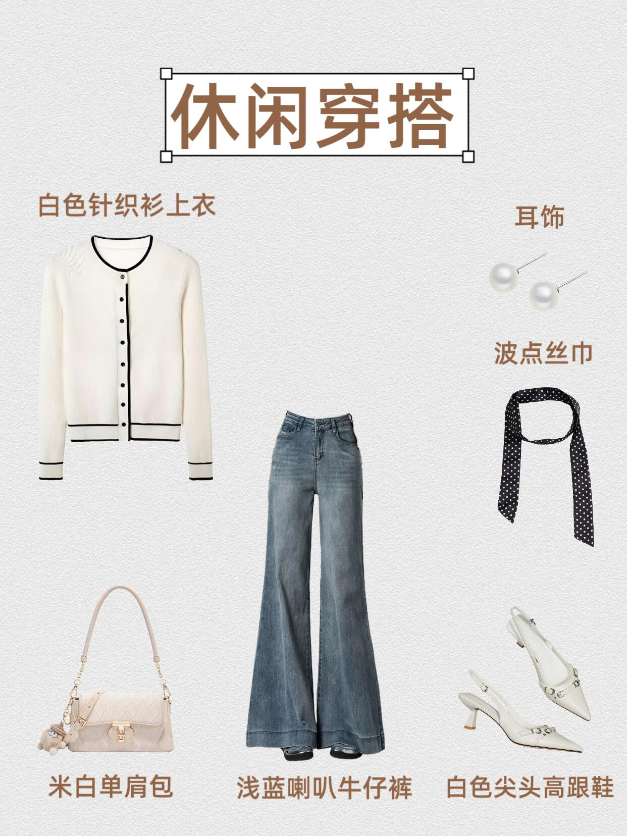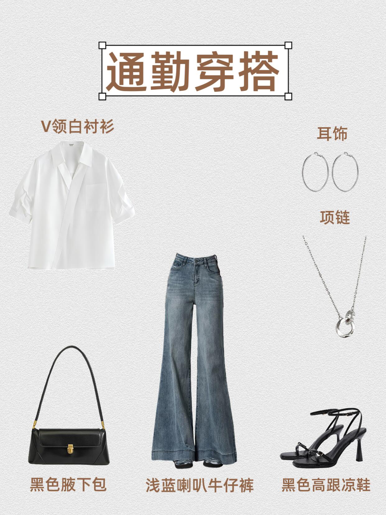 第1⃣套:干练通勤风 V领白衬衫+浅蓝喇叭牛仔裤+黑色高跟凉鞋+黑色腋下包+银色耳饰+环形项链 第2⃣套:甜酷休闲风 黑色V领针织上衣+浅蓝喇叭牛仔裤+厚底小皮鞋+粉色单肩包+银色耳饰+花朵项链 第3⃣套:温柔休闲风 粉色露肩上衣+浅蓝喇叭牛仔裤+粉色单鞋+粉色手提包+粉色耳饰+珍珠项链 第4⃣套:复古通勤风 奶咖假两件上衣+浅蓝喇叭牛仔裤+黑色尖头高跟鞋+黑色手提包+心形耳饰...