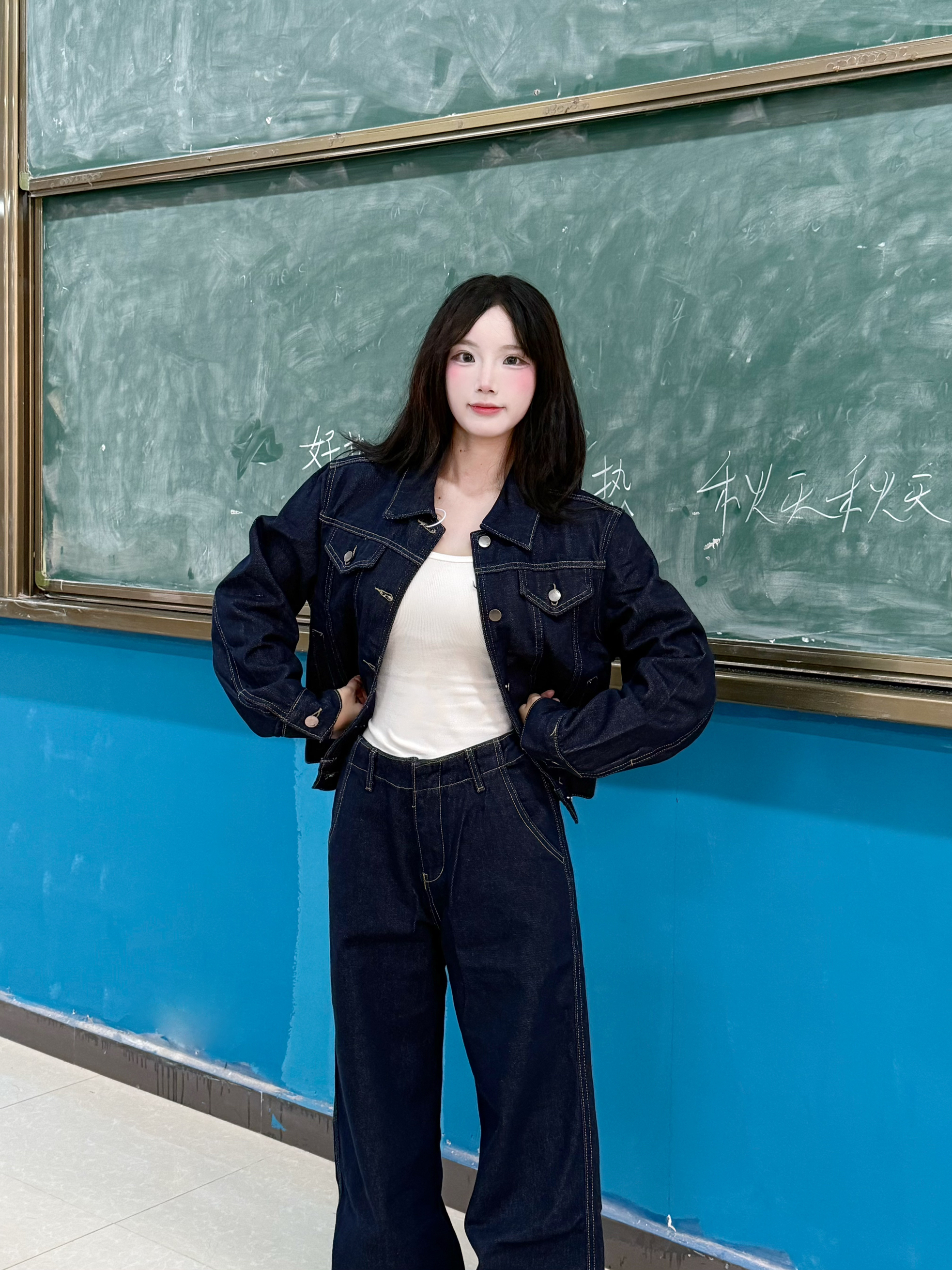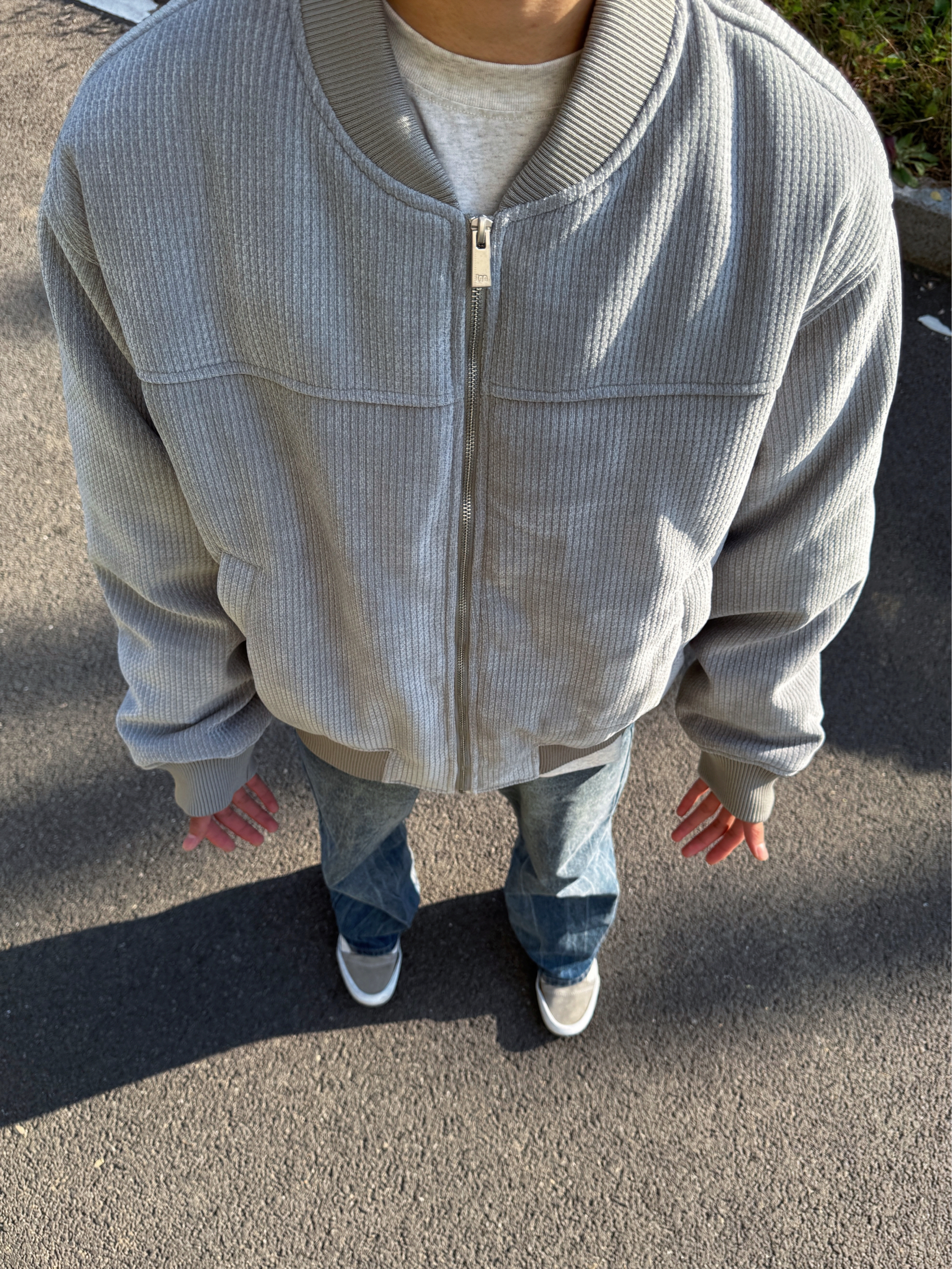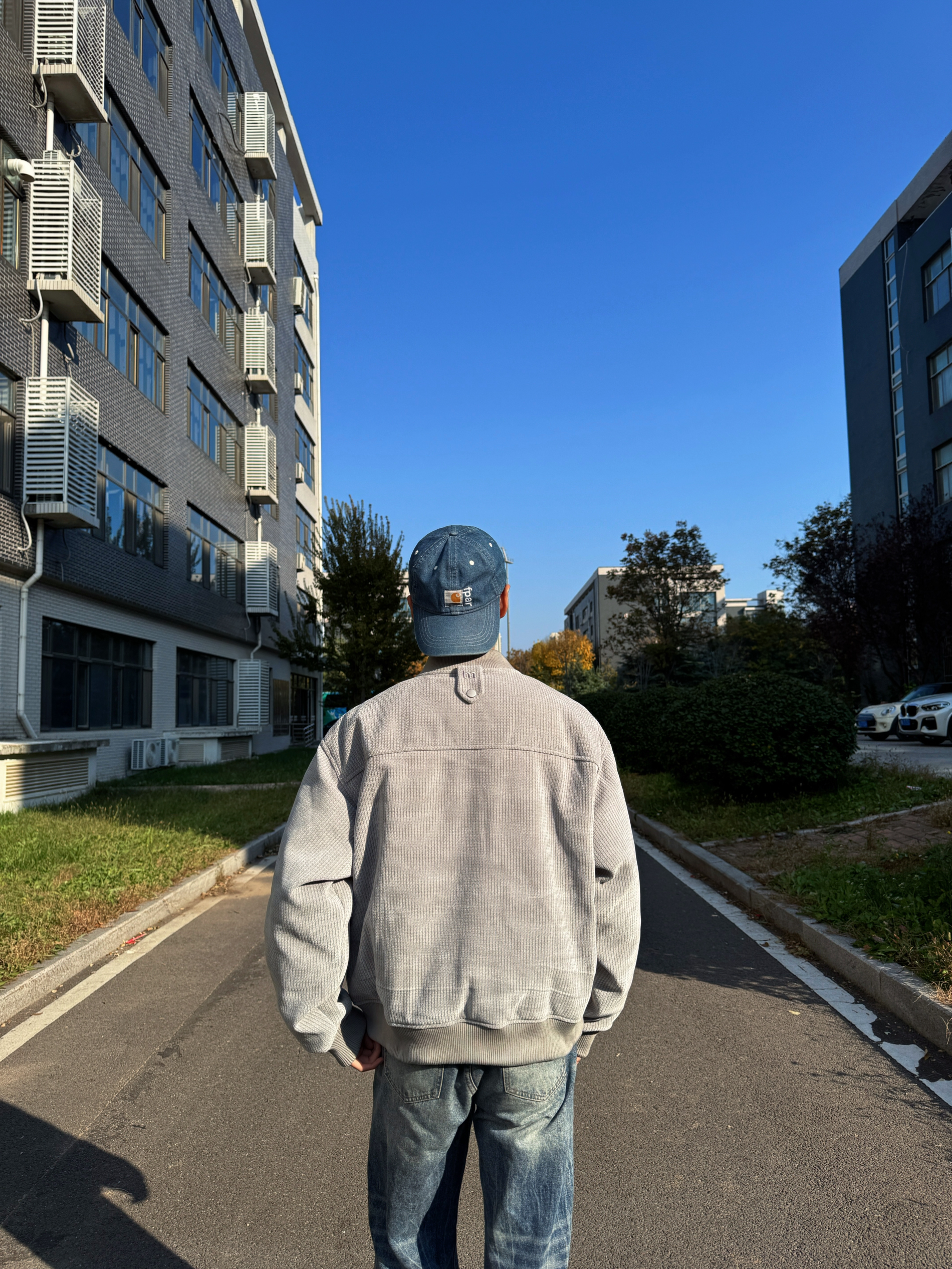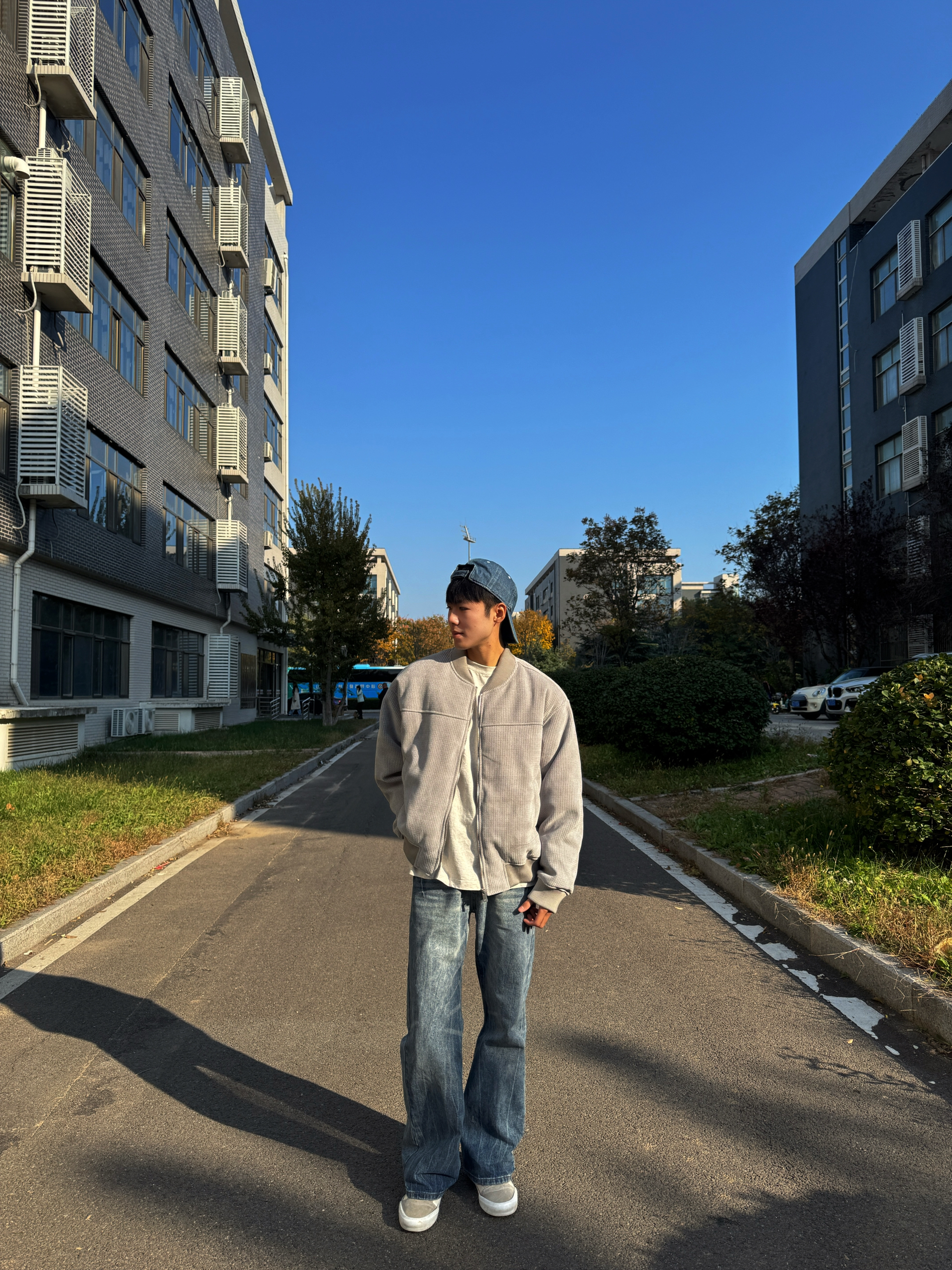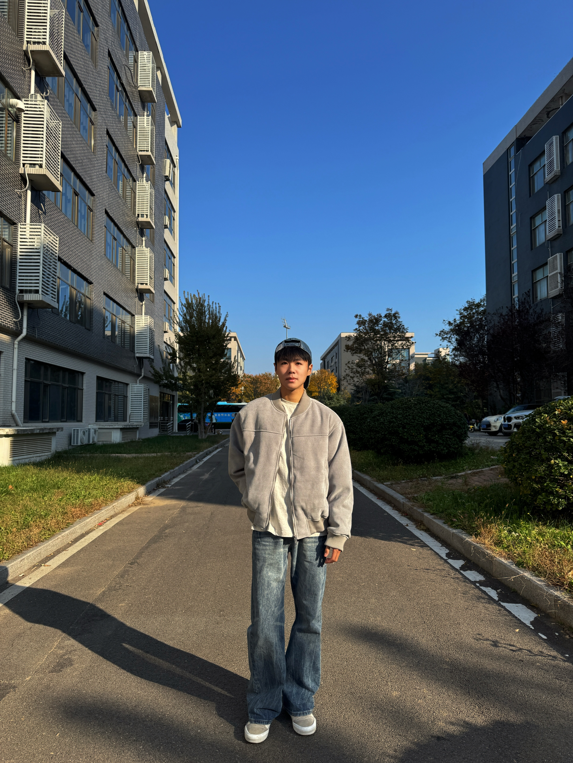 这穿搭看着也太舒服了吧! 浅灰色灯芯绒夹克+宽松牛仔裤的组合,松弛感直接拉满,配色清爽又日常,很有校园里那种随性的少年感~背景的蓝天和建筑也很干净,整体氛围特别舒服自然
