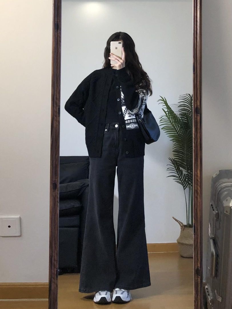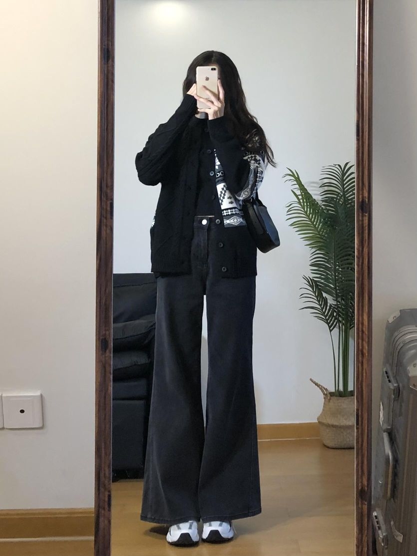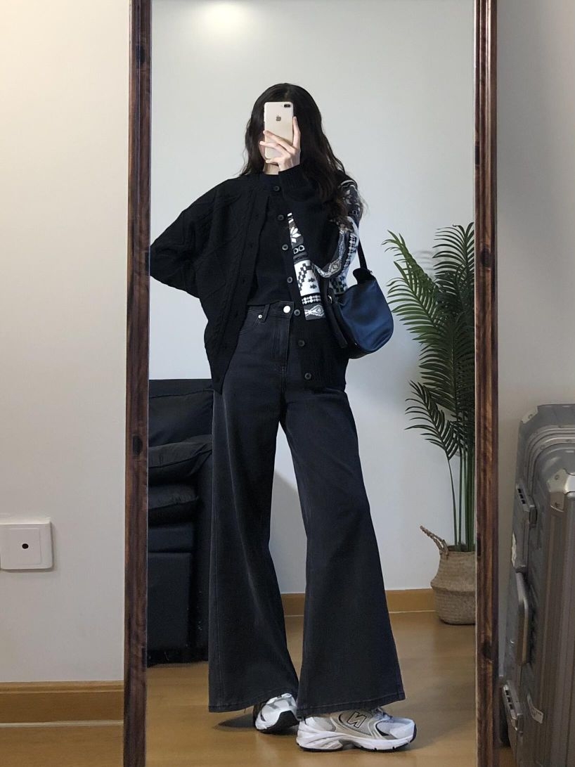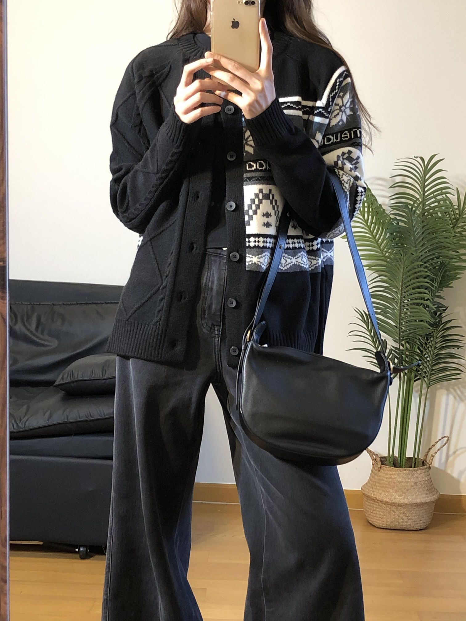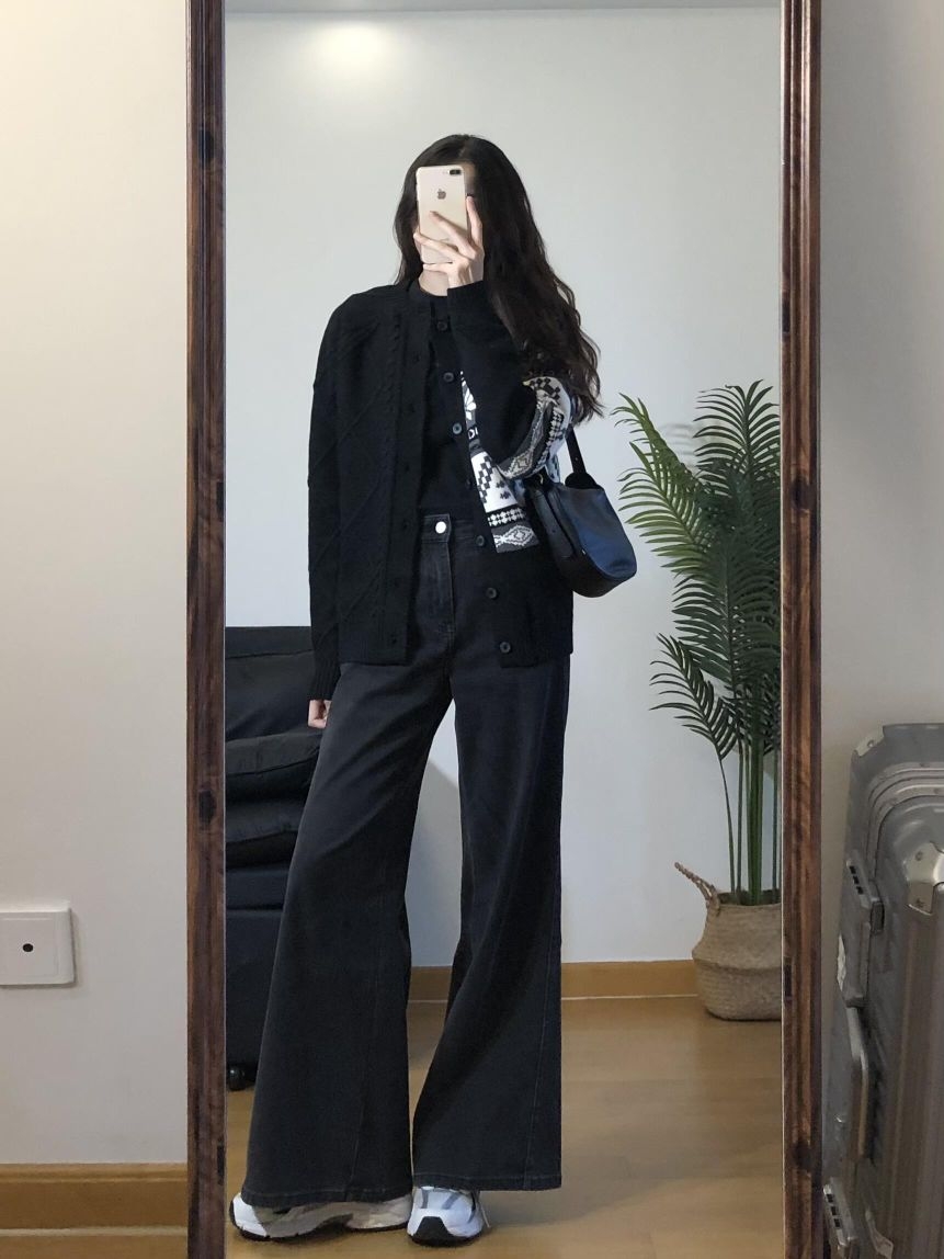 挖到宝了!这件黑色针织开衫也太万能了吧!连穿一周解锁了N种搭配:内搭黑白花纹毛衣营造层次感,单穿配阔腿牛仔裤慵懒又显瘦。最爱的是它和任何下装都能组CP——搭深灰牛仔裤是休闲感,配黑色阔腿裤直接变身纸片人! 实测亮点: 1. 针织面料软糯不扎皮肤,20℃天气穿刚好 2. 几何纽扣设计超有心机,灯光下会有细闪 3. 阔腿裤的垂坠感绝了,走路带风还不显胯宽 小心机在于用白色运动鞋打破沉闷,斜挎包选...