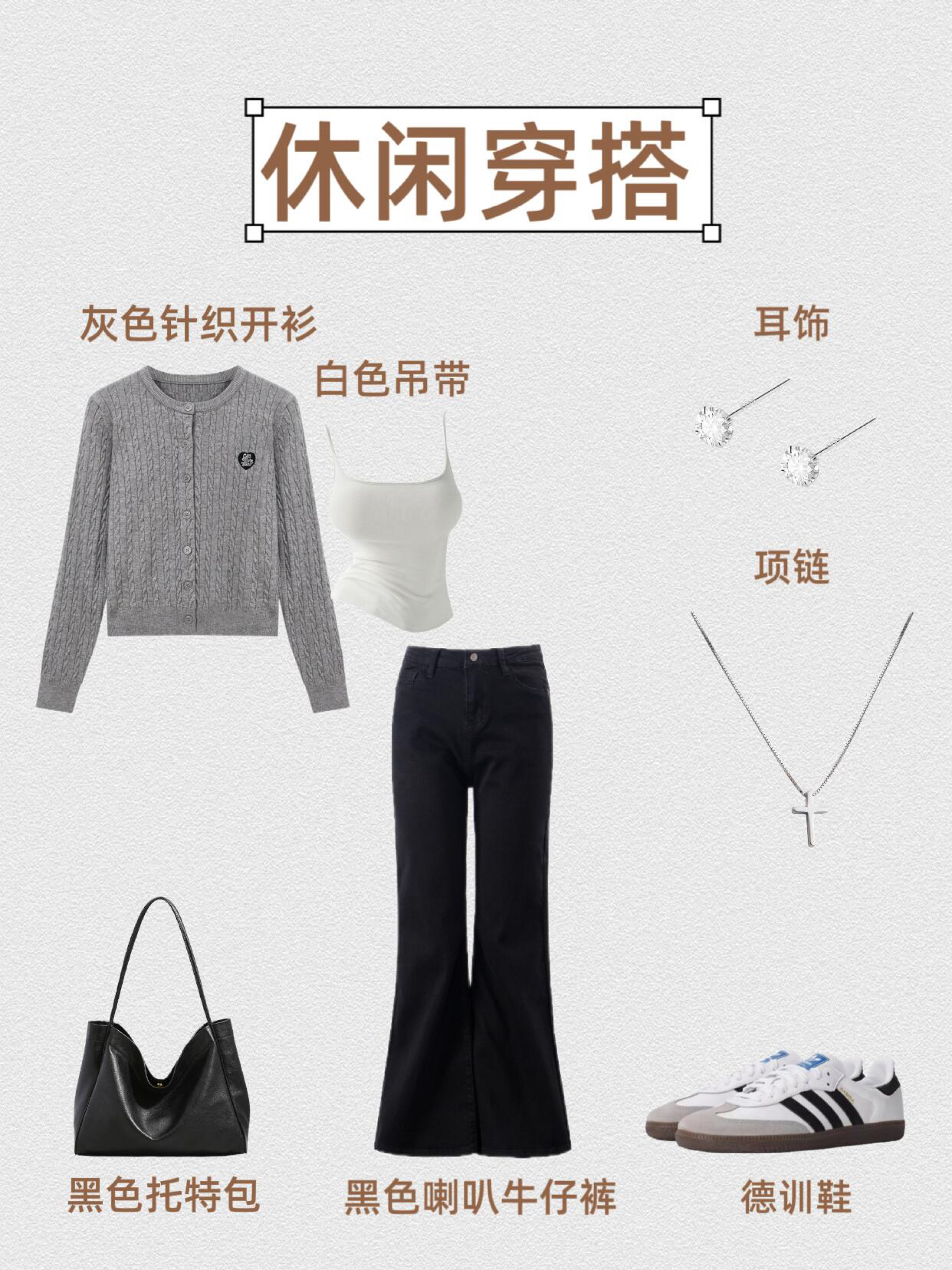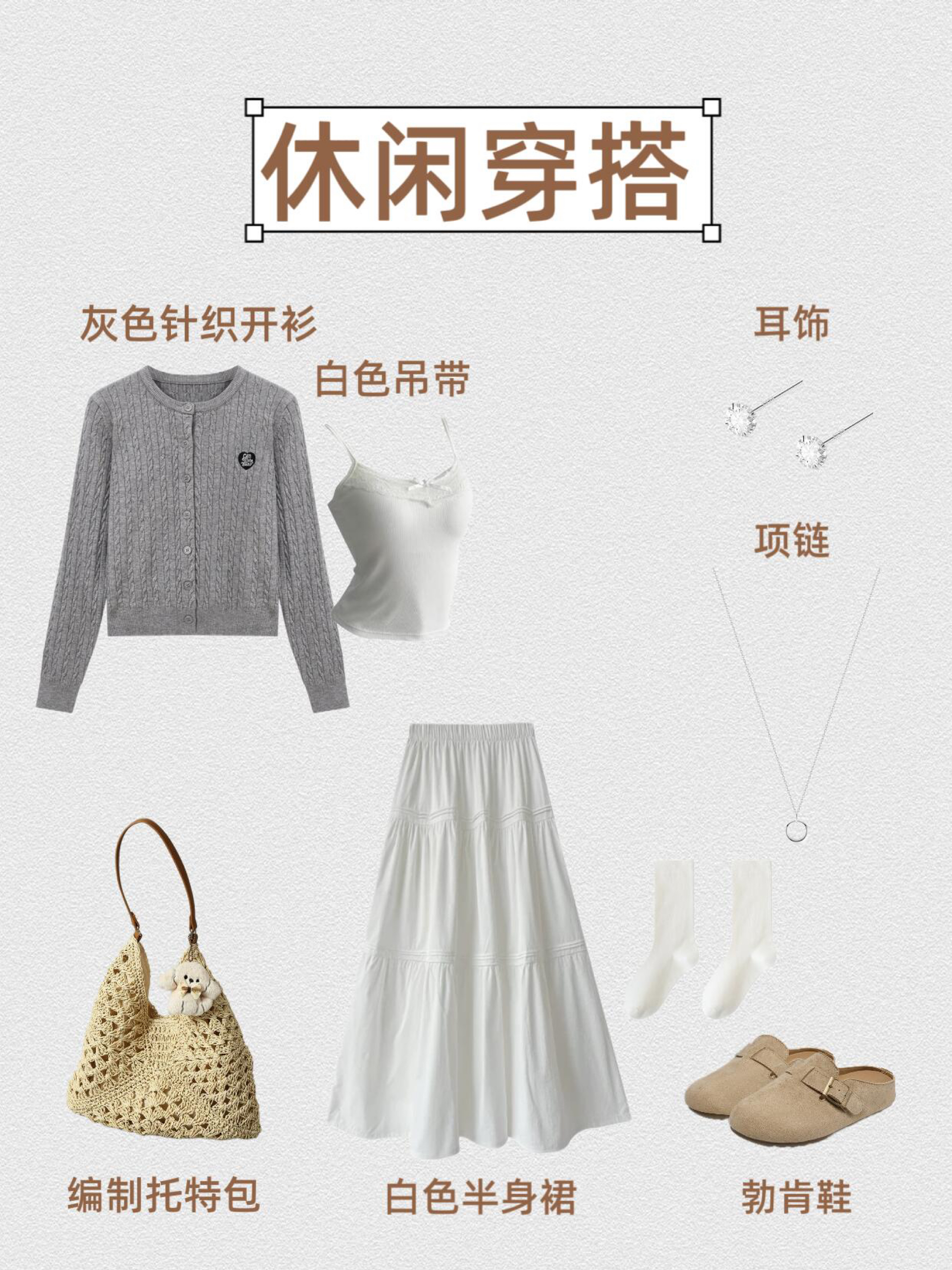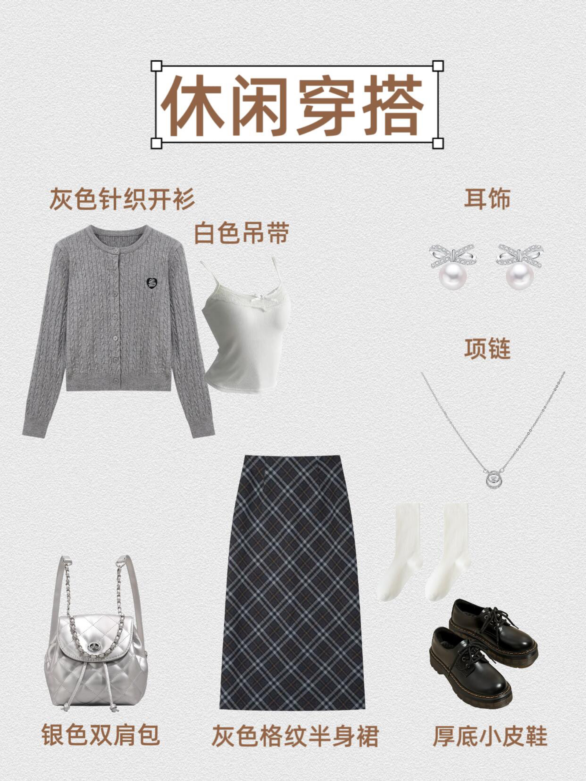 第1⃣套:复古休闲风 灰色针织开衫+白色吊带+黑色喇叭牛仔裤+德训鞋+黑色托特包+钻石耳饰+十字项链 第2⃣套:学院休闲风 灰色针织开衫+白色吊带+灰色格纹半身裙+厚底小皮鞋+银色双肩包+珍珠蝴蝶结耳饰+钻石项链 第3⃣套:温柔休闲风 灰色针织开衫+白色吊带+白色半身裙+勃肯鞋+编制托特包+钻石耳饰+圆形项链 第4⃣套:甜酷学院风 灰色针织开衫+修身白T+灰色百褶裙短裙+厚底小皮鞋...