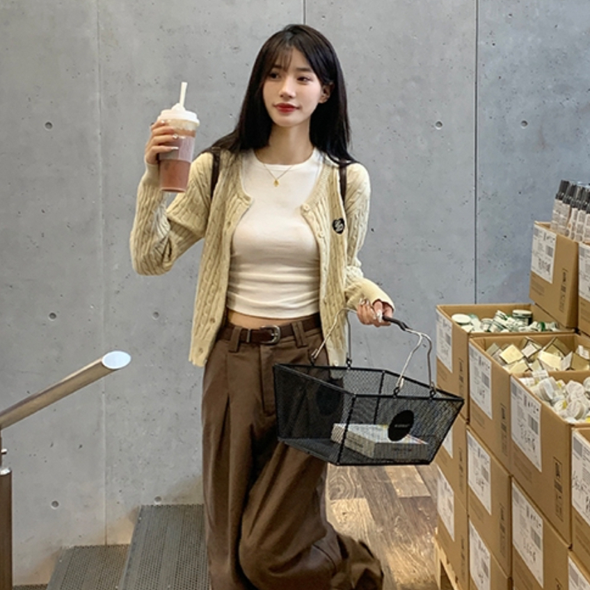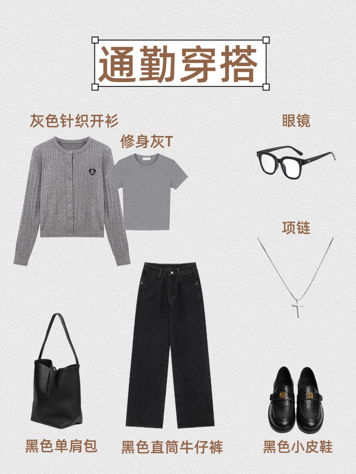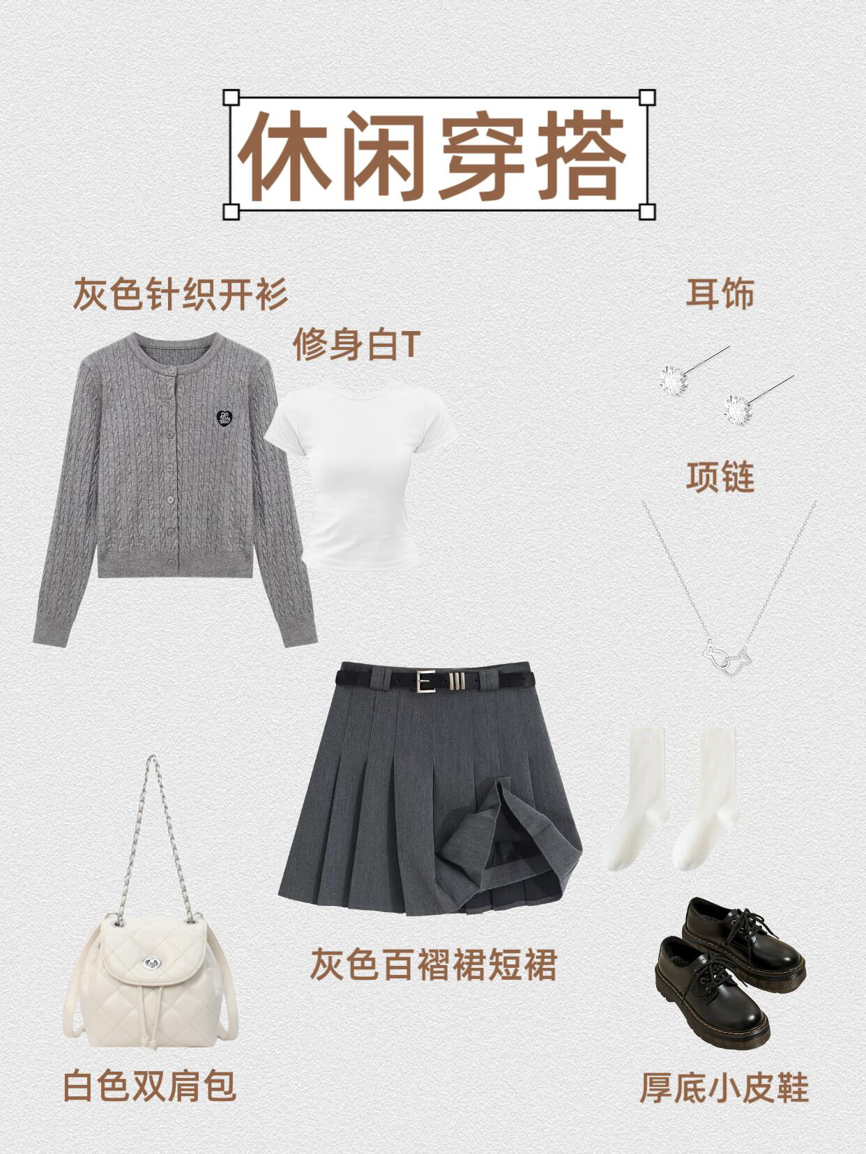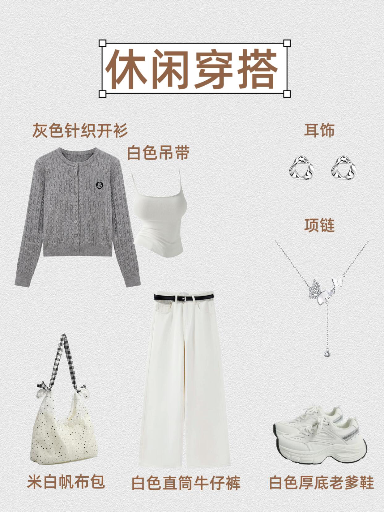 第1⃣套:复古休闲风 灰色针织开衫+白色吊带+黑色喇叭牛仔裤+德训鞋+黑色托特包+钻石耳饰+十字项链 第2⃣套:学院休闲风 灰色针织开衫+白色吊带+灰色格纹半身裙+厚底小皮鞋+银色双肩包+珍珠蝴蝶结耳饰+钻石项链 第3⃣套:温柔休闲风 灰色针织开衫+白色吊带+白色半身裙+勃肯鞋+编制托特包+钻石耳饰+圆形项链 第4⃣套:甜酷学院风 灰色针织开衫+修身白T+灰色百褶裙短裙+厚底小皮鞋...