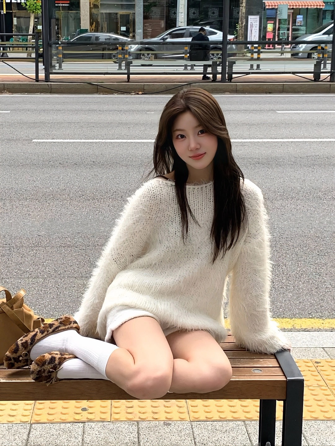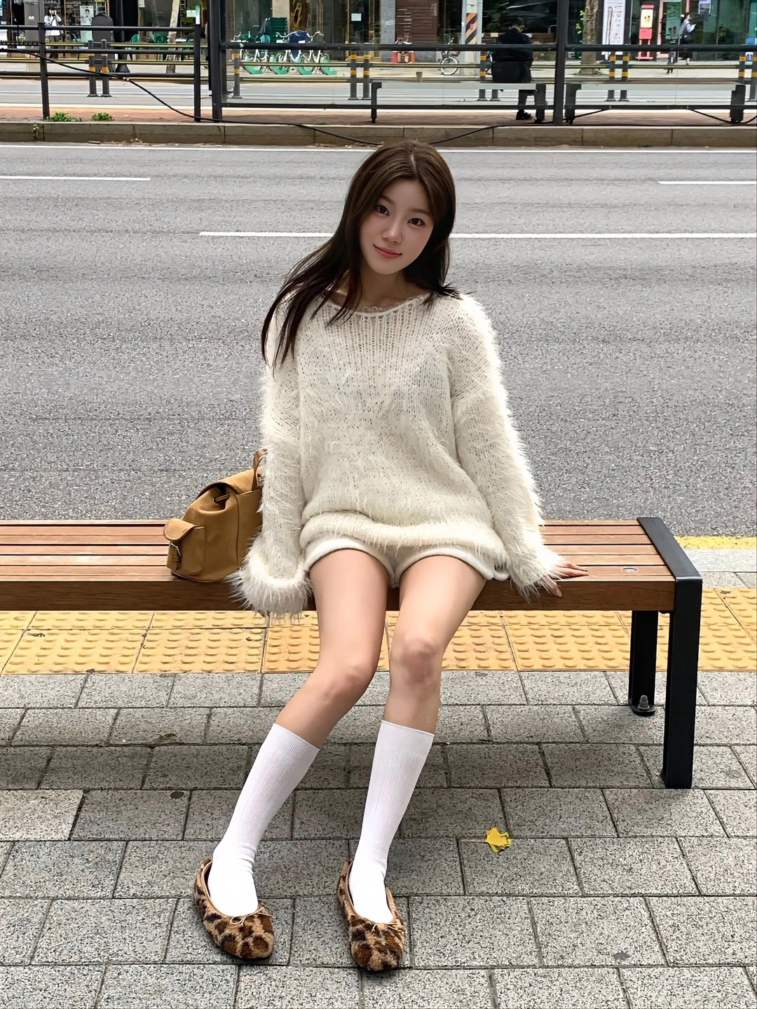 这套米白毛绒毛衣真的太绝了!软乎乎的材质上身体感超舒服,搭配白色短裤和长袜,再踩一双豹纹小单鞋、挎个棕色包包,在街头随便拍都满是氛围感。 温柔中带着点小性感的风格,秋冬约会或逛街穿都超合适,穿上这套真的会忍不住夸自己——也太会搭了吧!