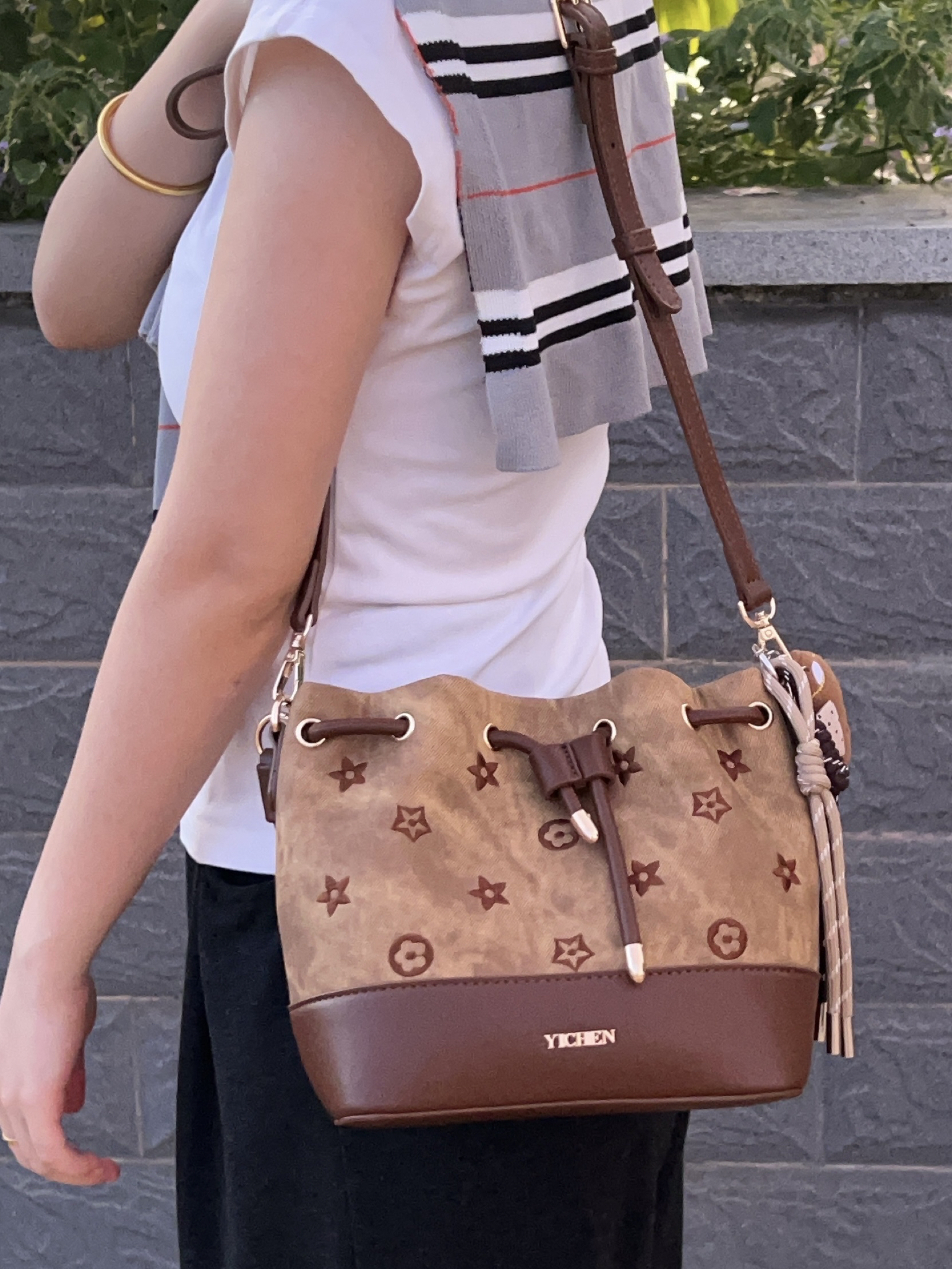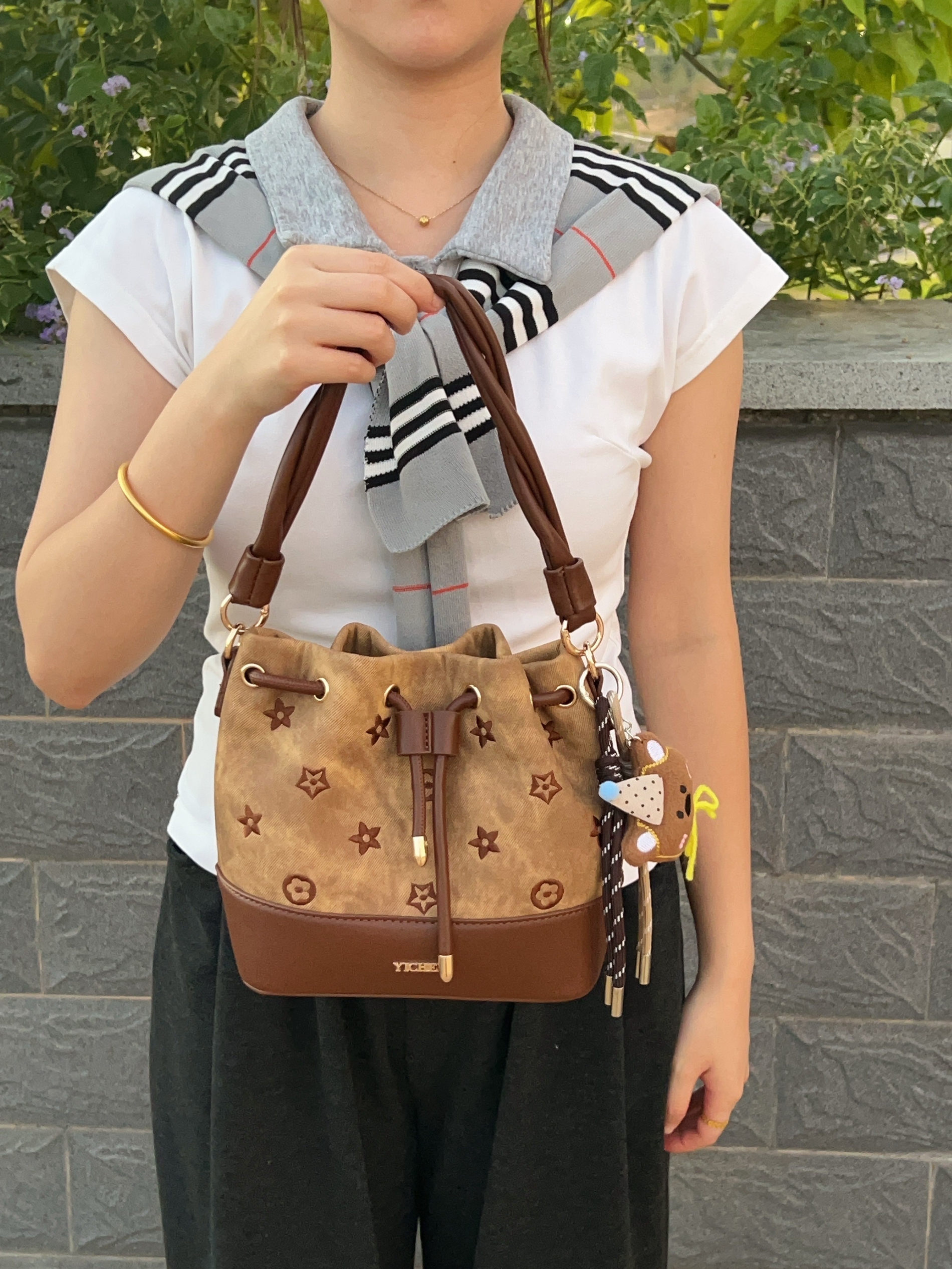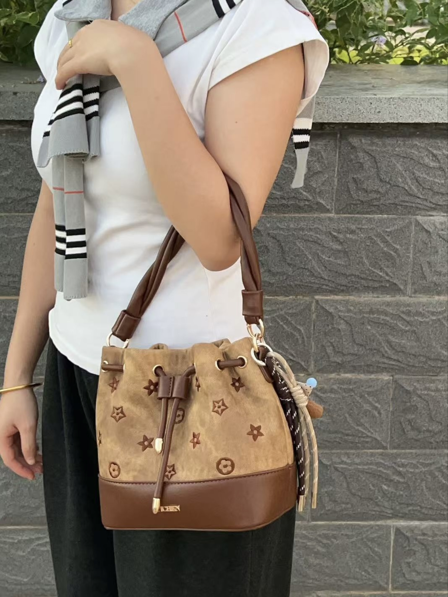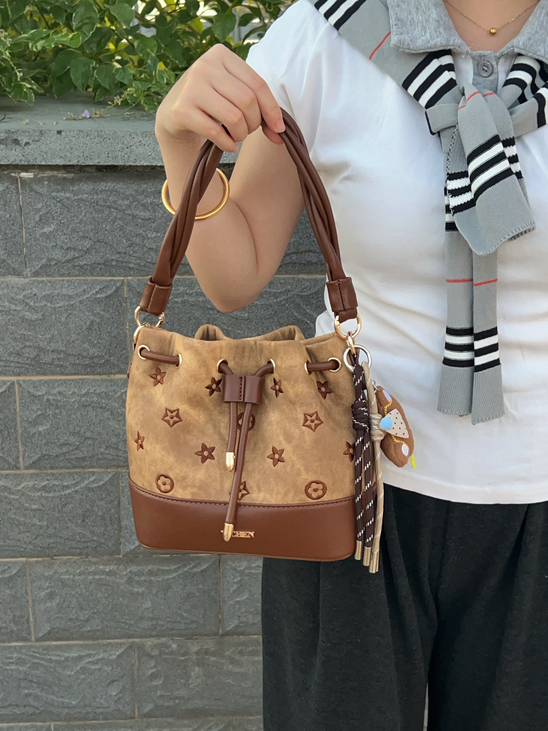 入冬啦天气比较冷 刚好又是双十一期间 我给自己安排了新的包包 这款水桶包配色好看的 可以手拎也可以单肩斜挎 而是容量我觉得还不错 够放我日常的一些东西 平时搭配秋冬的衣服也好看