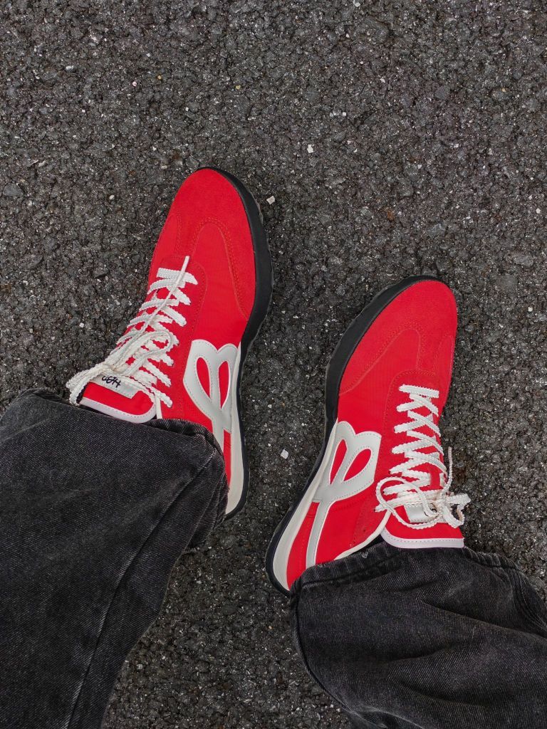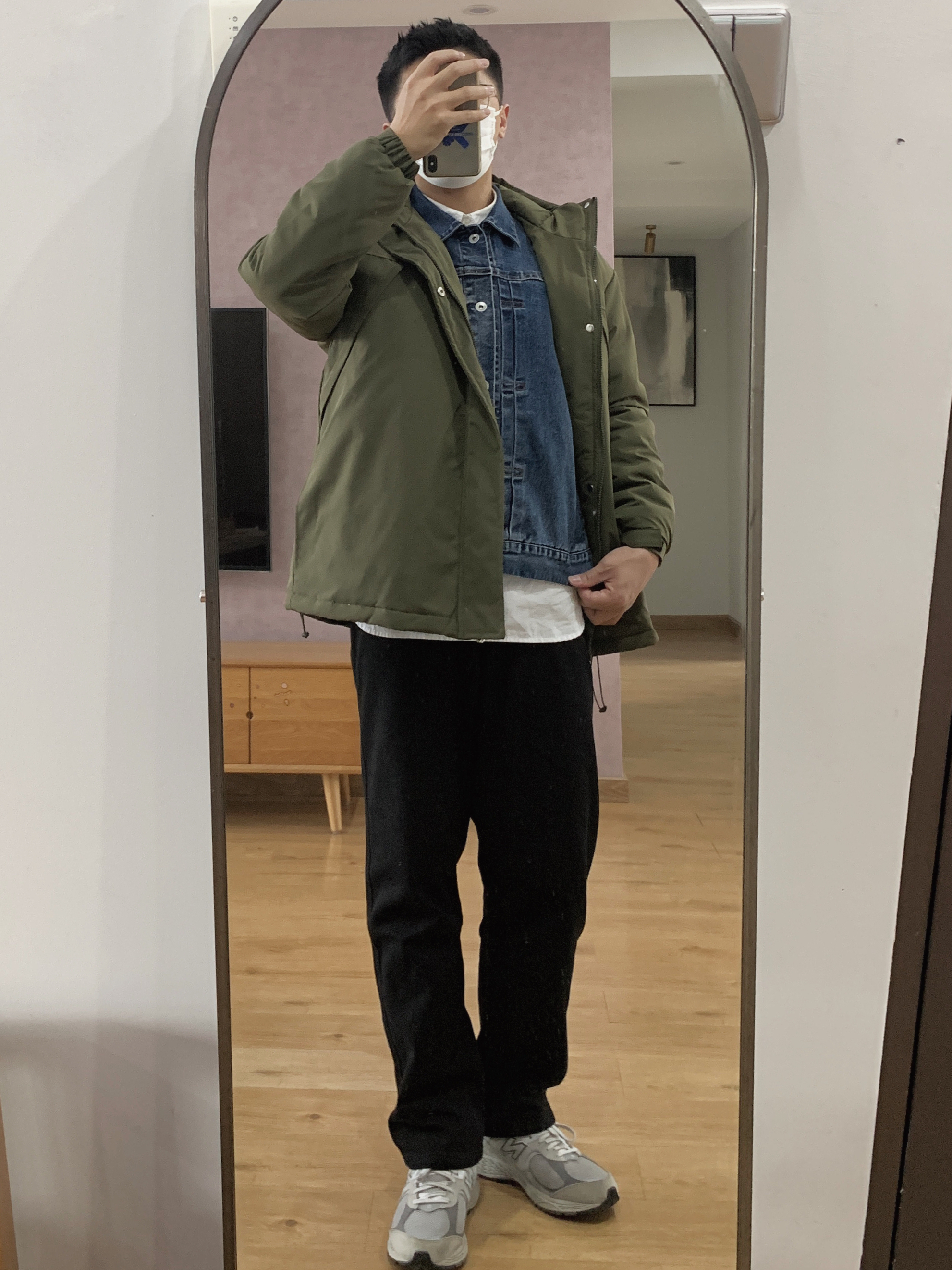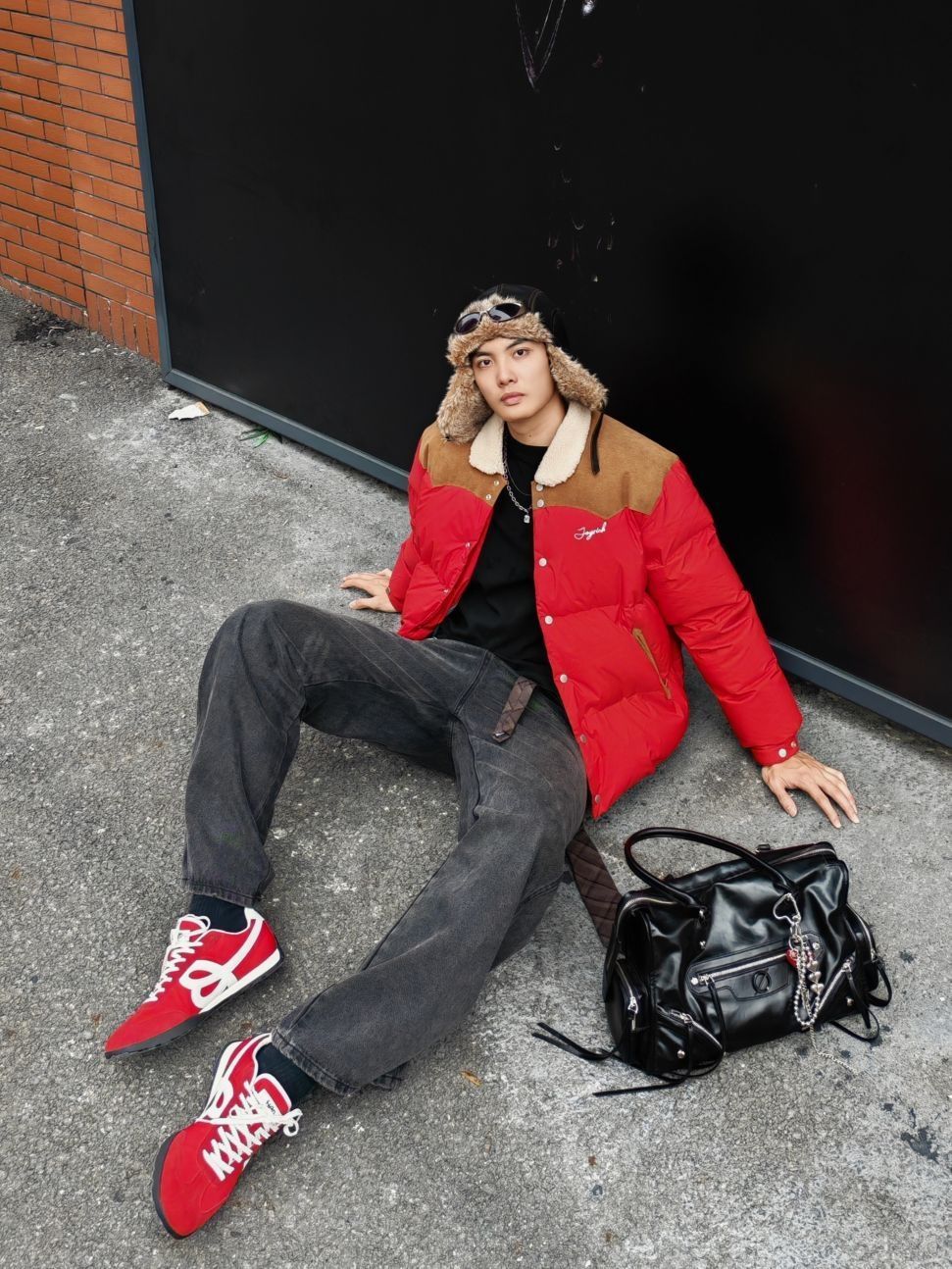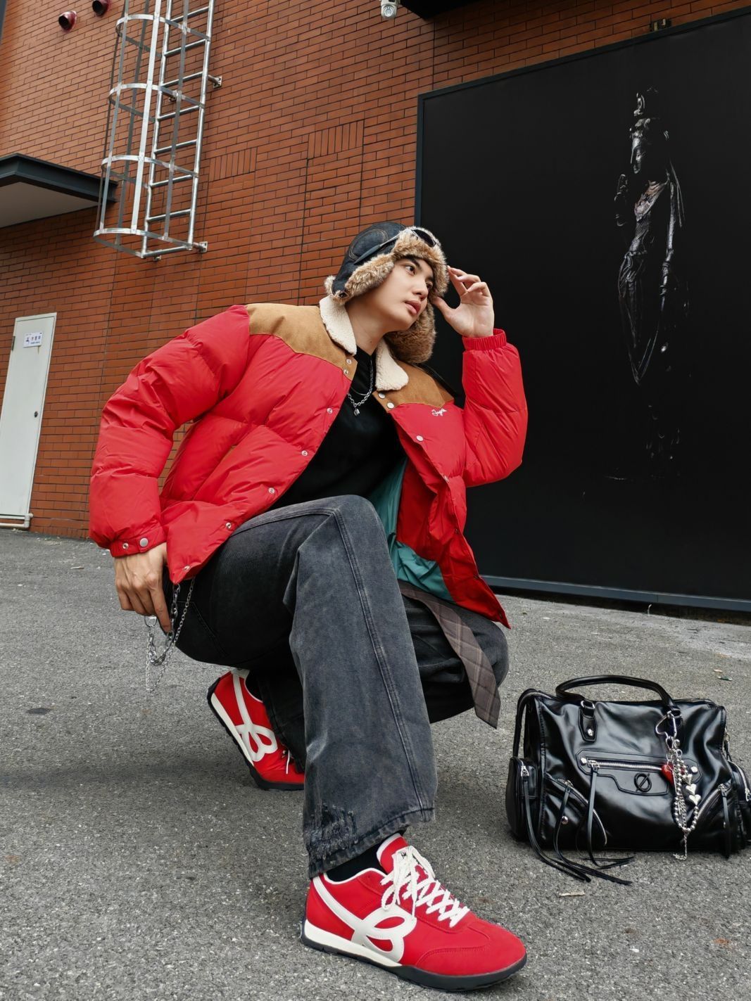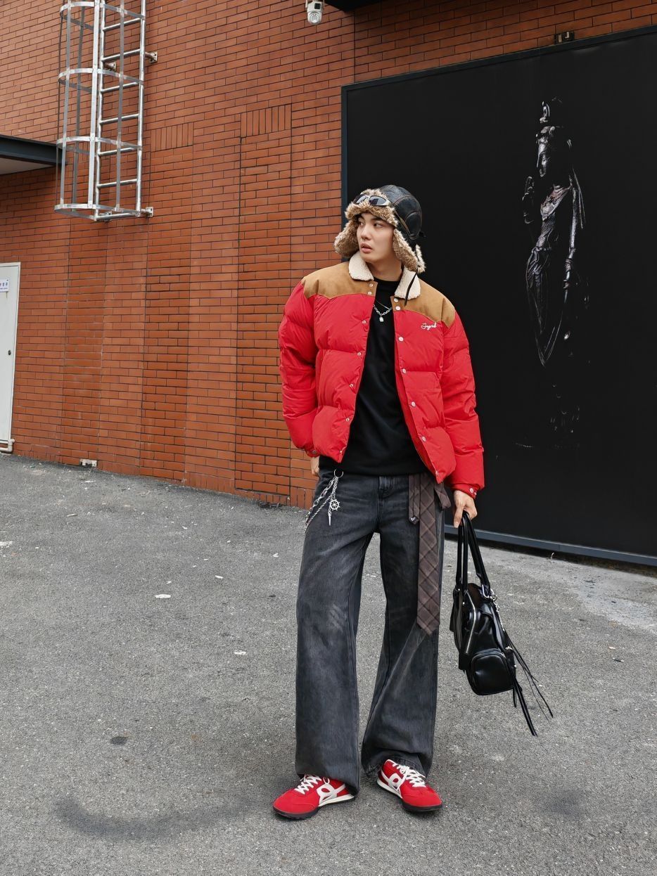 hi。这里是镭子的秋冬氛围感穿搭分享 红棕拼接羽绒夹克,复古有型,内搭黑色卫衣。 深灰阔腿牛仔裤,金属链装饰,配棕色腰带点缀。 HAPPY BIRDS DAY 红白薄底慢跑鞋呼应上衣,复古德训造型经典又百搭,飞行员帽增添街头感。 黑色手提包实用又时髦,整体色调协调,复古与街头风格结合,适合秋冬日常出街。