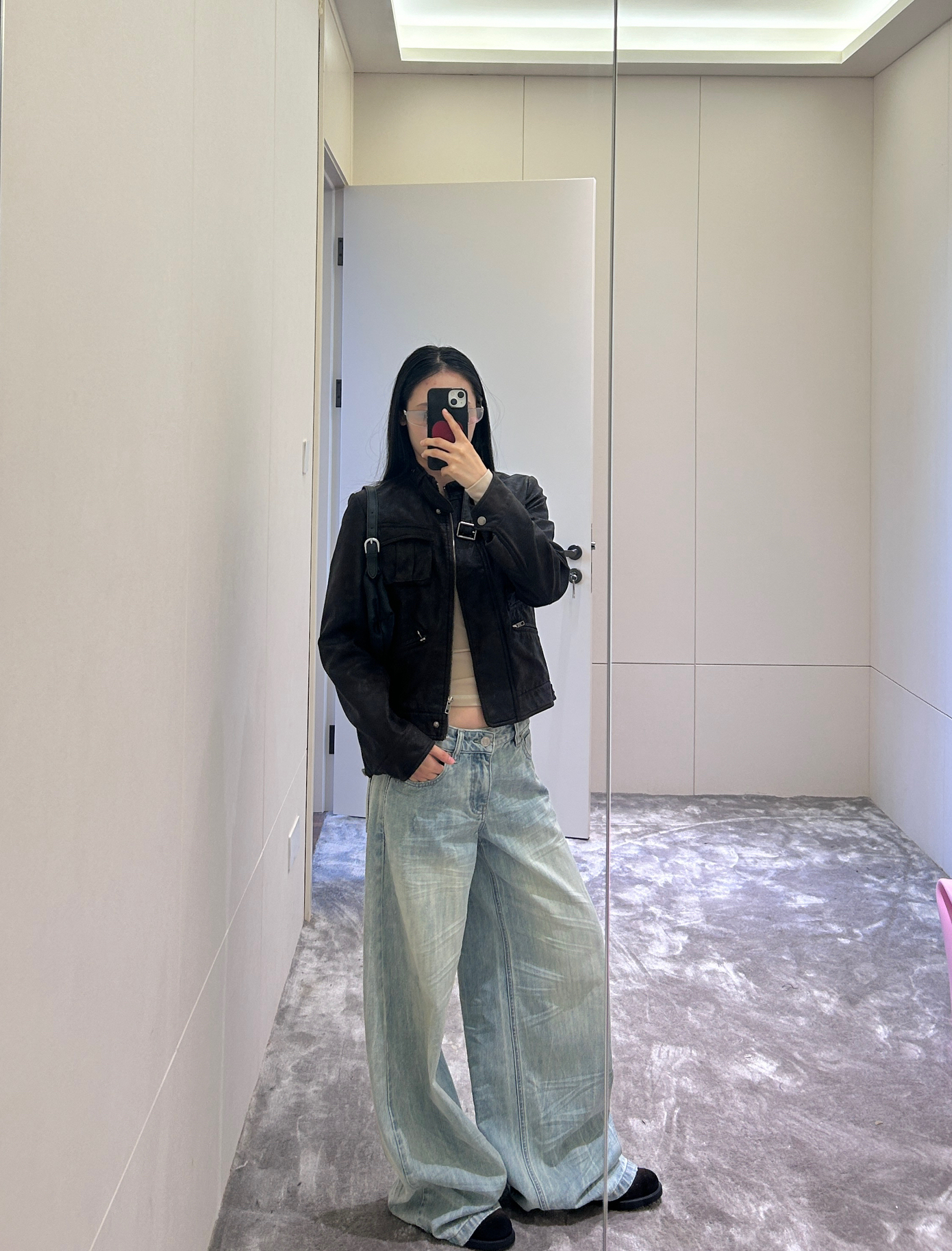 哑光黑夹克自带复古硬核滤镜,金属扣细节戳中酷感审美;内搭浅棕小吊带露点腰,悄悄中和了深色的厚重~ 浅蓝阔腿裤坠出慵懒轮廓,黑包+黑鞋压稳风格,随手一穿就是“随性但有腔调”的秋日模板~ 看似漫不经心,实则把“酷而不锐”的平衡感捏得刚好~