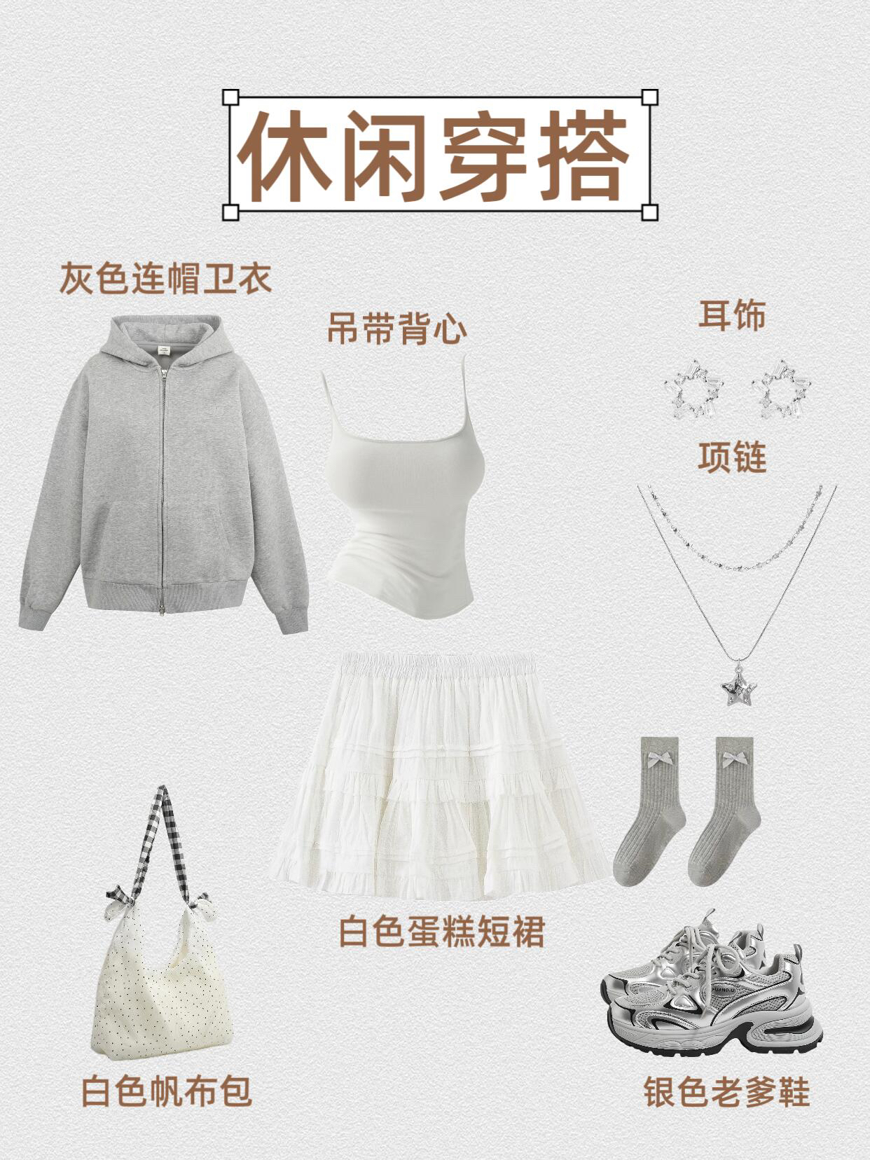第1⃣套:美式复古风 灰色连帽卫衣+麻灰修身T恤+黑灰微喇牛仔裤+厚底小皮鞋+黑色单肩包+银色耳饰+环形项链 第2⃣套:运动休闲风 灰色连帽卫衣+短款白T+藏青垂感卫裤+白色德训鞋+红色帆布包+银色耳饰+十字项链 第3⃣套:甜酷街头风 灰色连帽卫衣+白色吊带背心+白色蛋糕短裙+银色老爹鞋+白色帆布包+钻石耳饰+星星项链 第4⃣套:复古运动风 灰色连帽卫衣+深咖吊带背心+灰色运动短裙...
