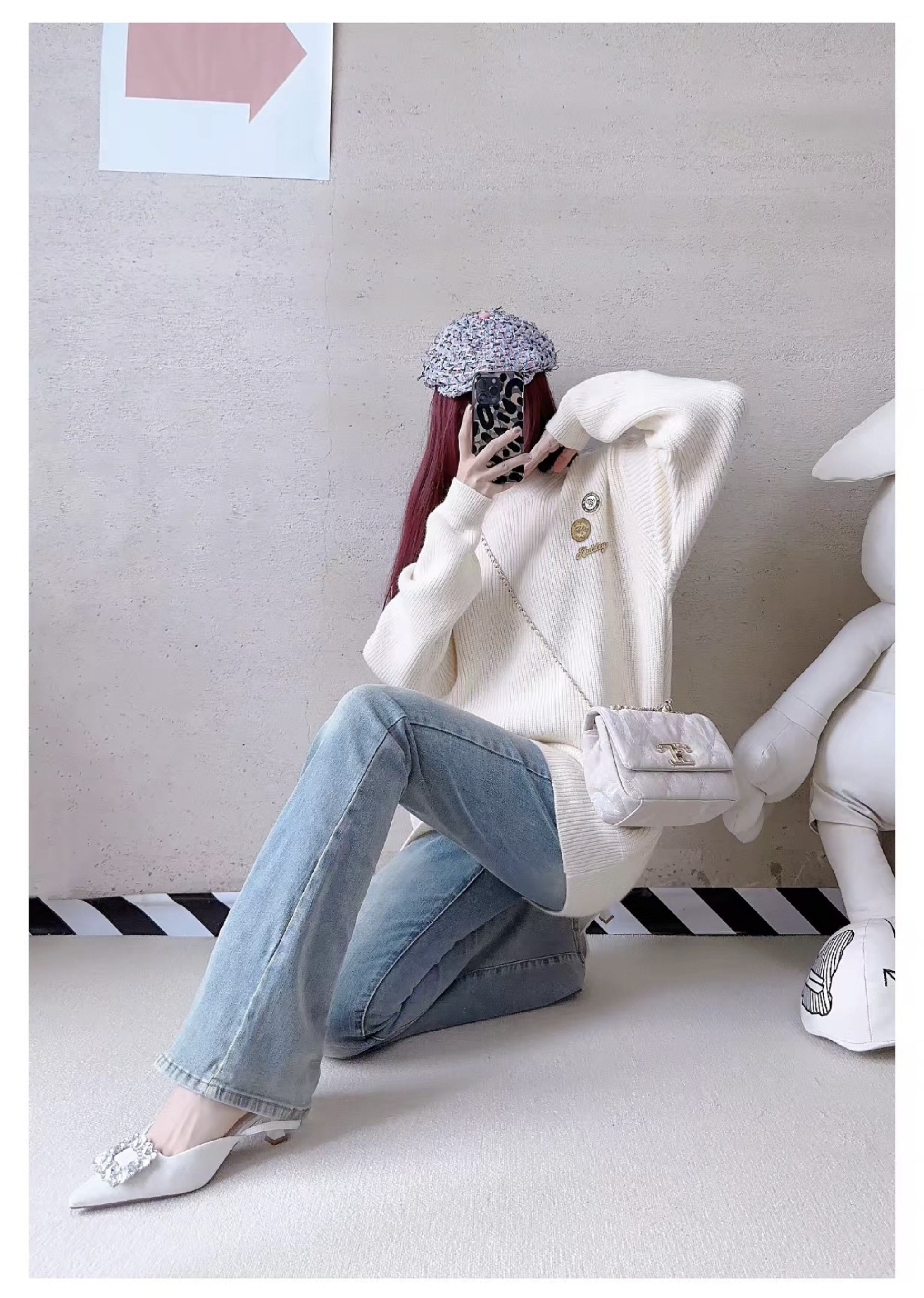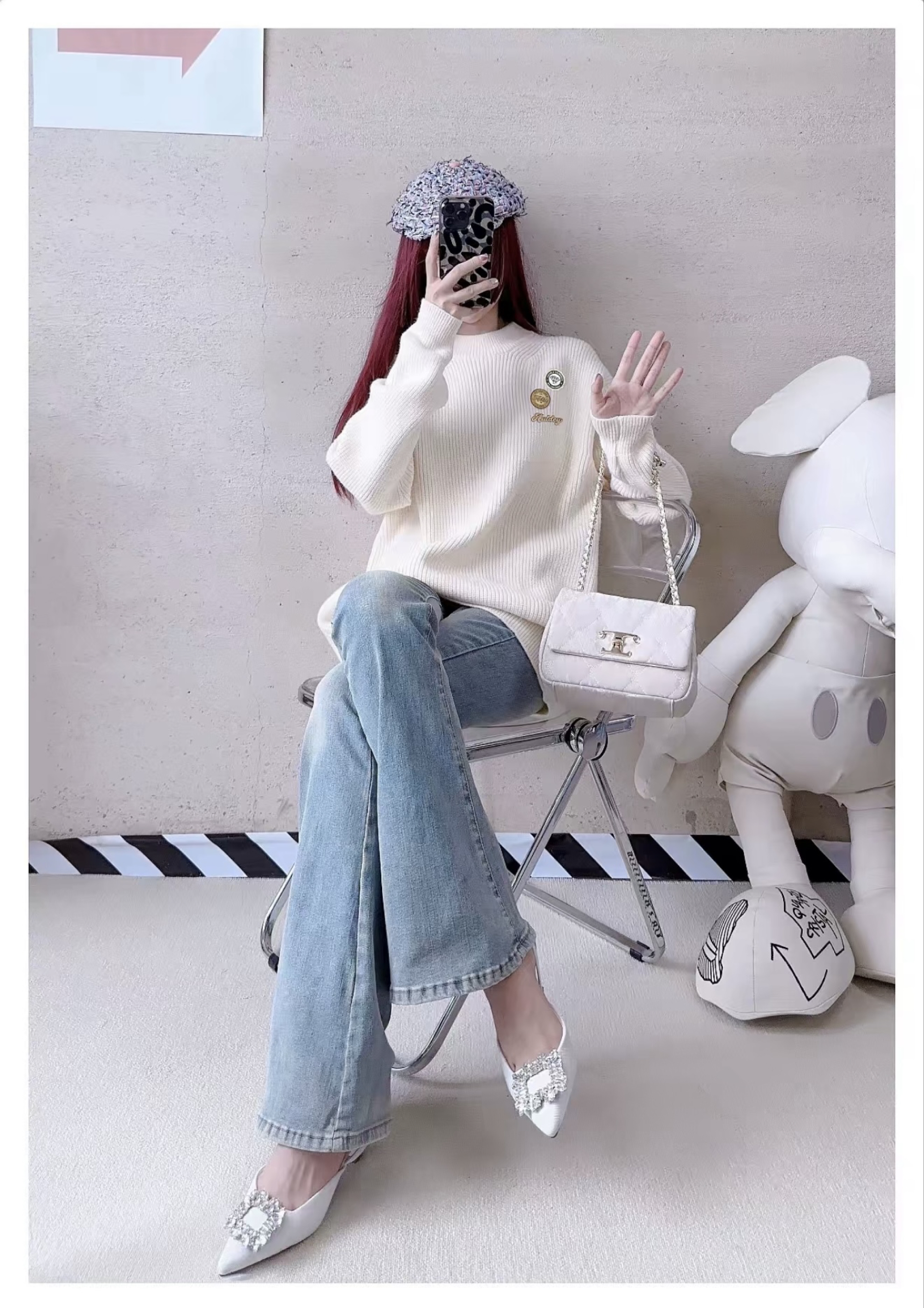 米白坑条毛衣自带软糯氛围感,搭配浅蓝微喇牛仔裤,既藏肉又拉长腿型,脚踩带钻高跟鞋。甜酷感直接拉满💫 小香风贝雷帽+同色系链条包,细节里都是精致小心机,慵懒又不失气质,日常出街或约会都适配!