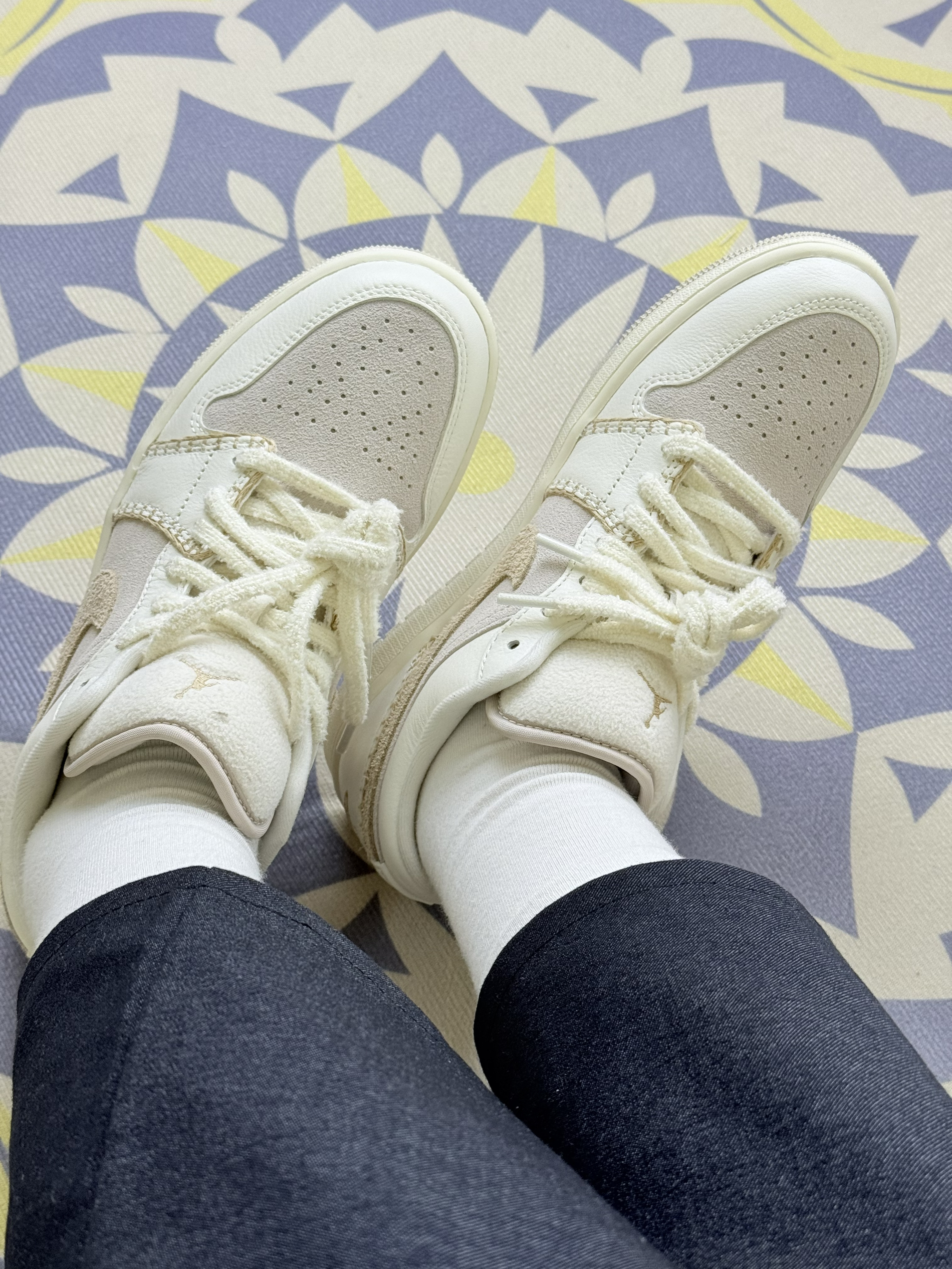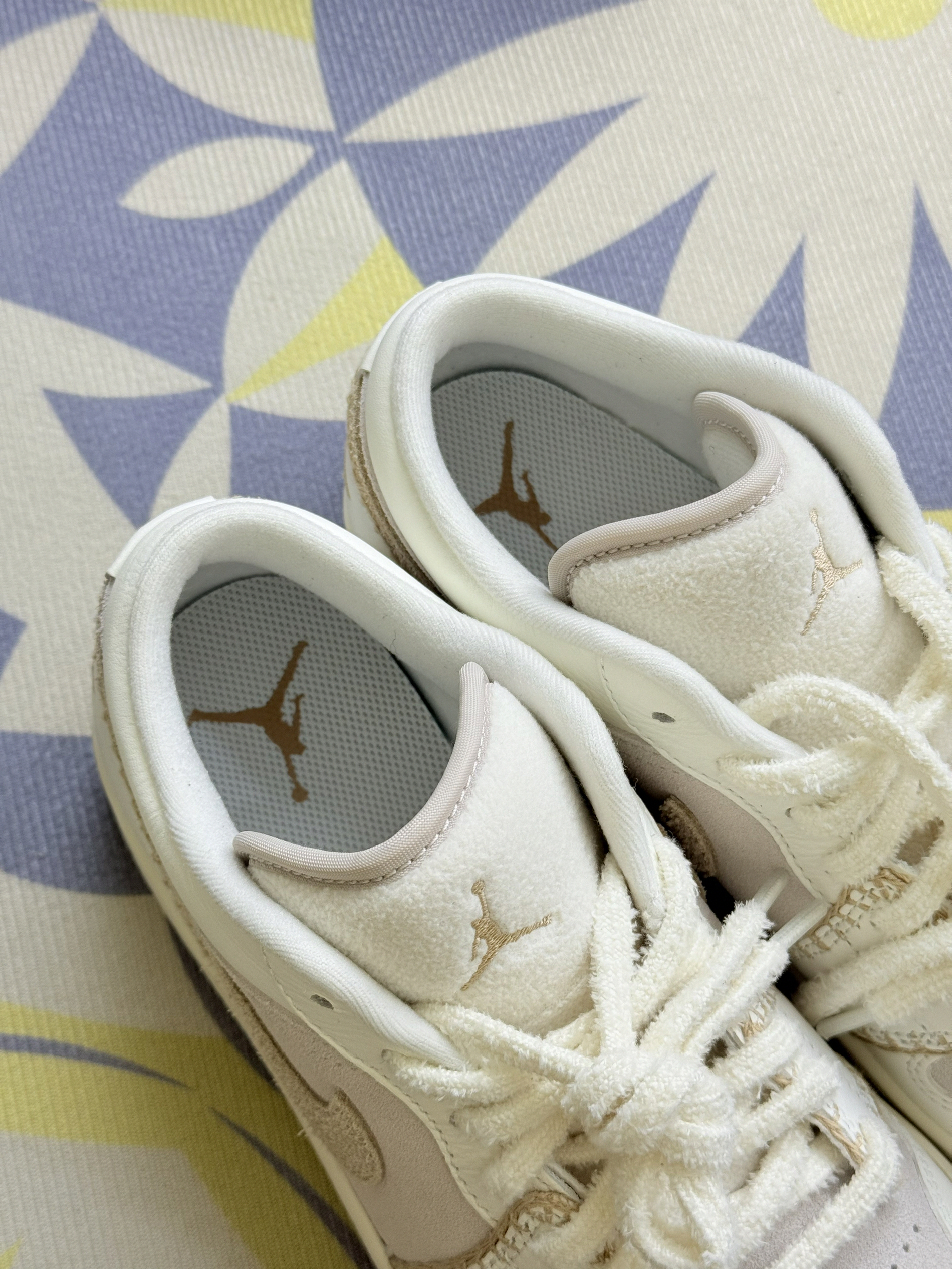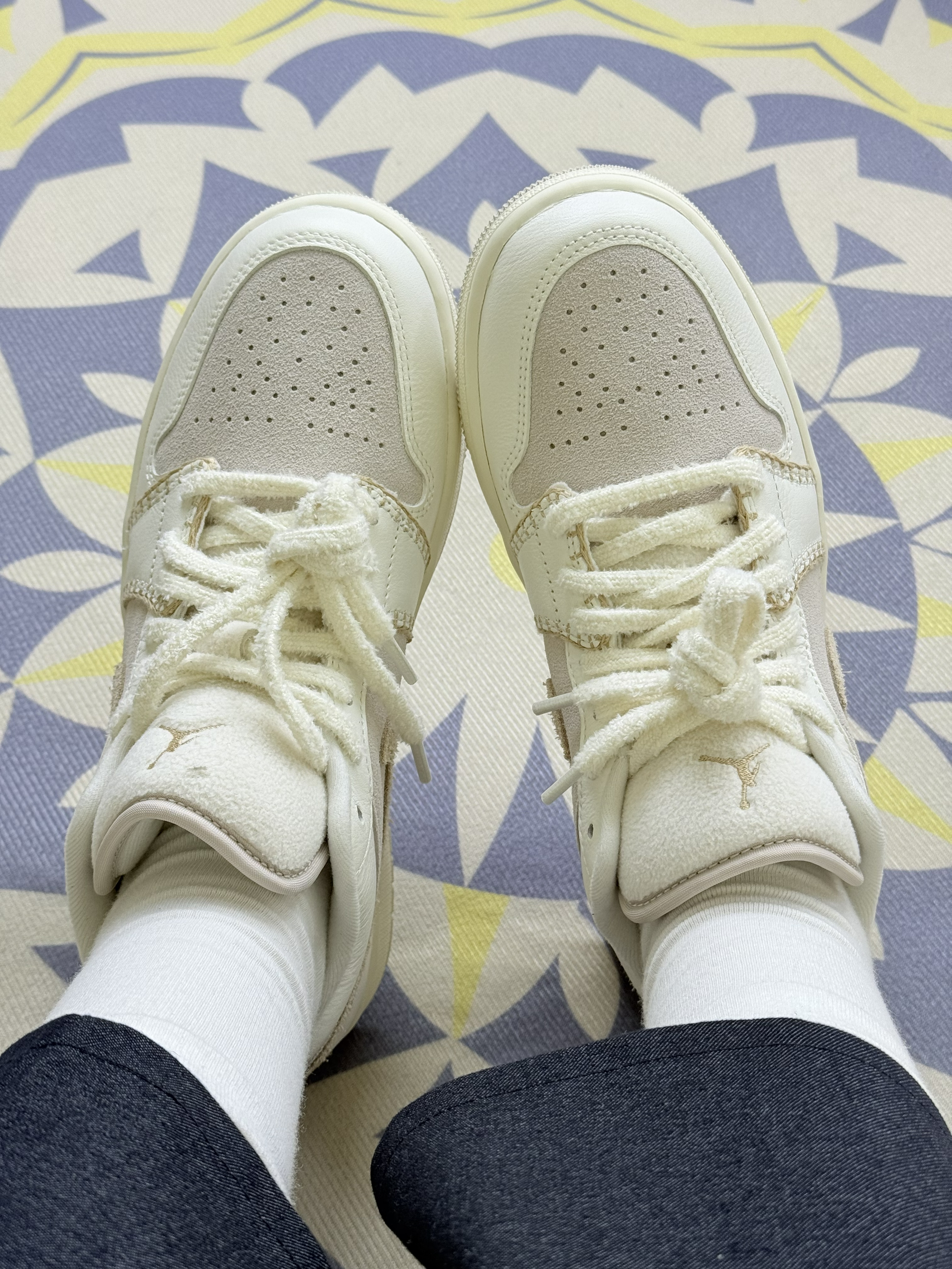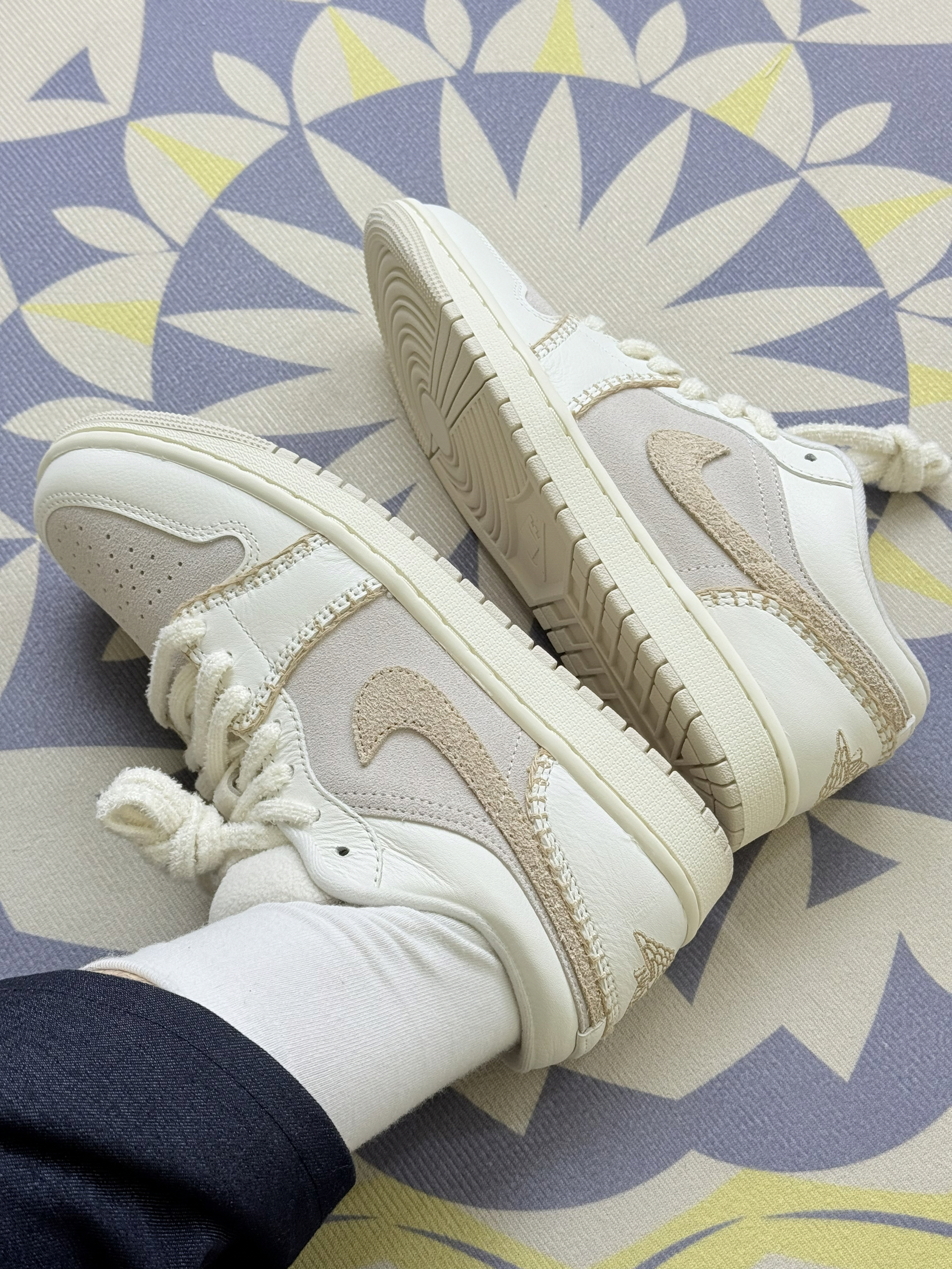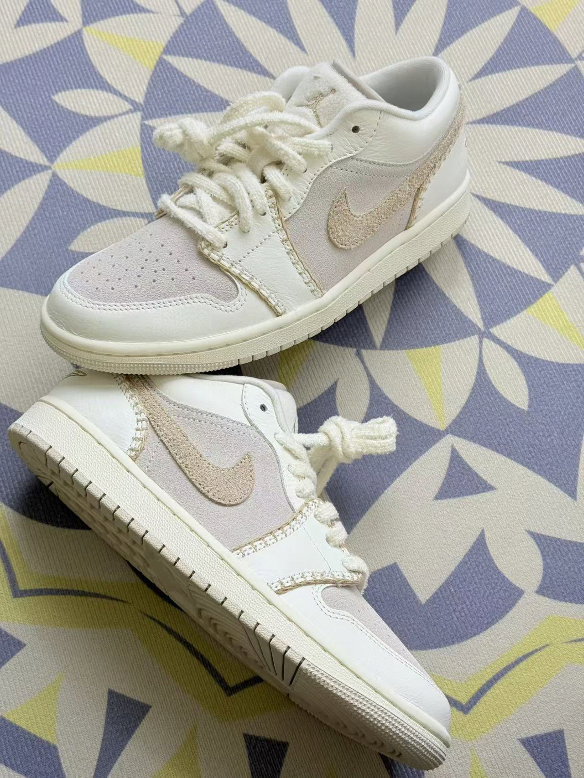 这双鞋NIKE的AJ1 Low SE系列低帮休闲板鞋,整体以米白色为主色调,鞋身采用皮革与网眼拼接材质,搭配浅卡其色的Nike Swoosh标志,鞋带为同色系粗绳设计,呈现出复古质感与潮流风格。作为AJ1系列的低帮款式,它兼具休闲与运动属性,适合日常穿搭,也可作为情侣款搭配。 Air Jordan 1(AJ1)女款以经典设计与潮流配色为核心,融合运动与时尚属性,适合多种风格穿搭。真正随处可见的...