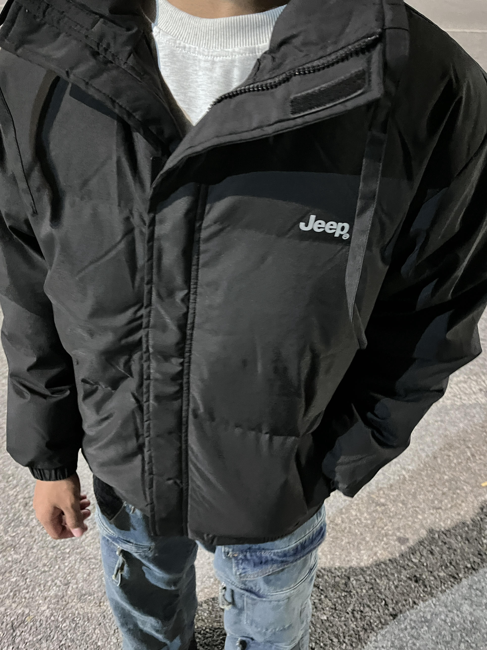 这件黑色Jeep 羽绒服,颜值爆表 告别冬日沉闷,Jeep户外羽绒服,无论是日常出行还是户外探险,你都是那个最靓的仔 采用高科技防风面料,前面是魔术贴的设计,有效抵御寒风侵袭,穿脱也更加方便,让你在凛冽的冬日也能享受温暖如春的感觉。650+的白鸭绒,意味着更细腻的保暖体验,轻盈不压身,仿佛穿着云朵散步。 户外探险,无惧挑战Jeep品牌血统,专为户外而生。无论是登山、徒步还是露营,这款羽绒服都...