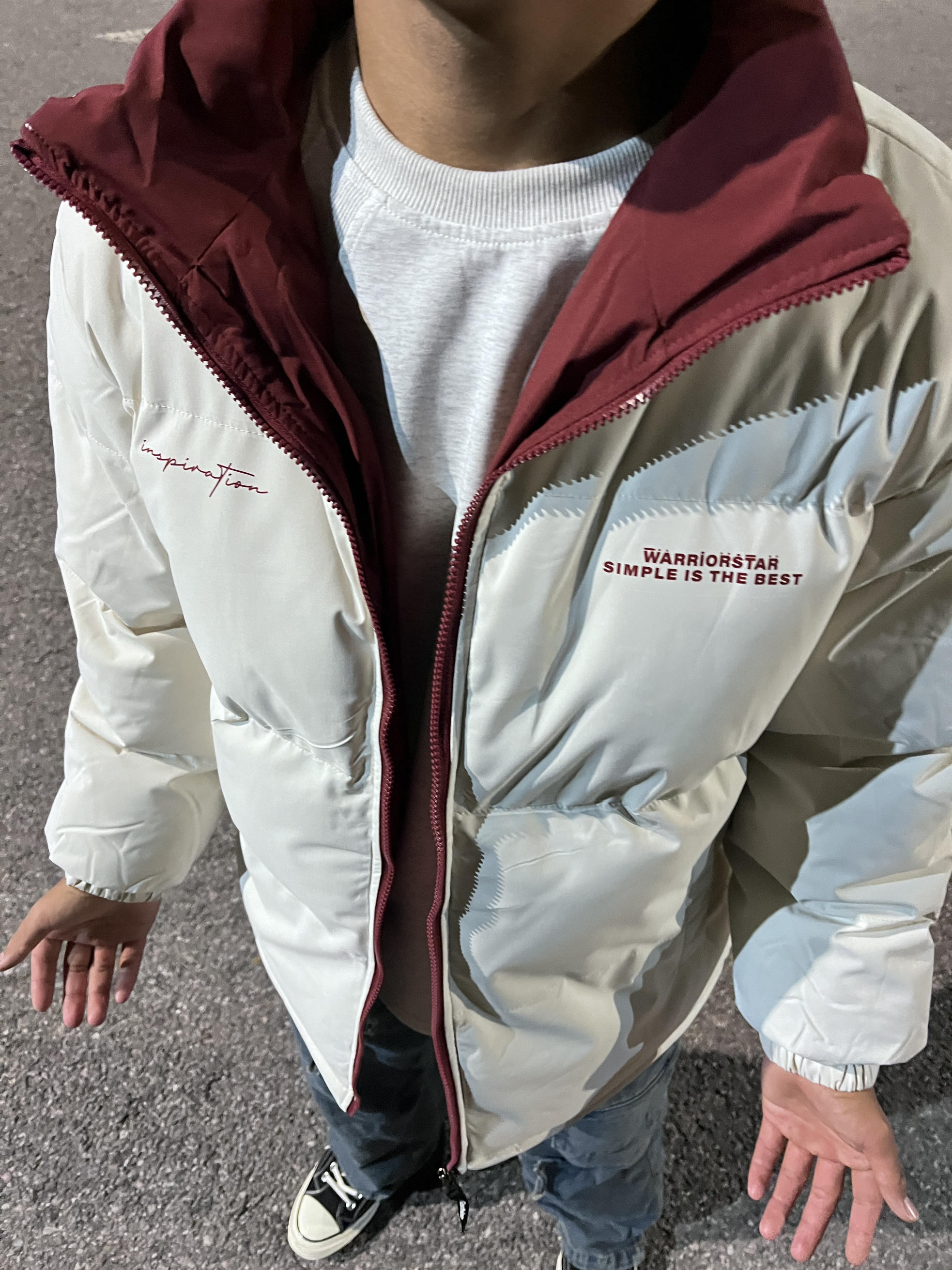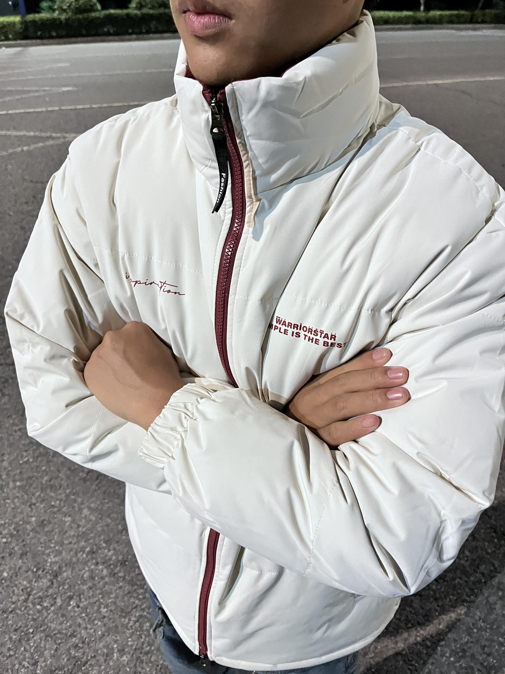 冬天加厚棉服不可缺的单品! 这款 Warrior/回力 撞色加厚棉服,白色主色+酒红拉链, 简约又有美式复古感! 高支高密棉衣材质,防风防水,冬天穿超暖 宽松版型不挑身材,立领设计保暖力up 胸前“SIMPLE IS THE BEST”字母超有态度 日常通勤、户外活动都能穿 搭配牛仔裤或休闲裤,轻松get时尚保暖look!