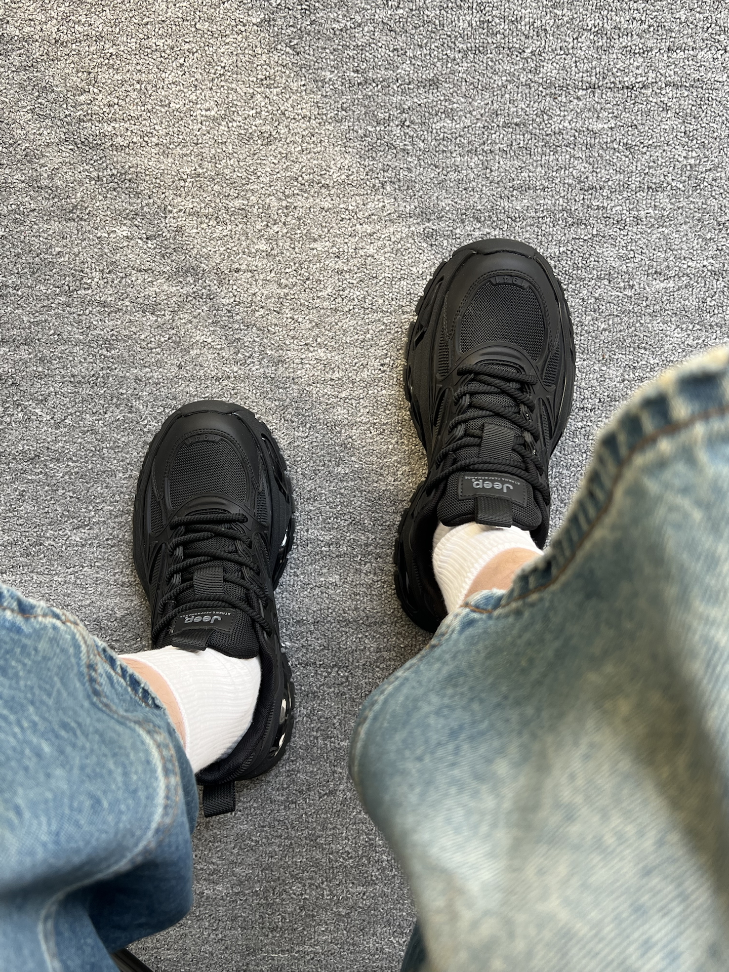 这双全黑机能风老爹鞋吼酷飒呀 整体是帅炸街的暗黑黑 波浪厚底自带潮感 我觉得穿上还蛮稳当的 网面+皮革拼接透气不闷脚 这个立体纹路设计我也很喜欢 平时搭短裤真的敲帅气