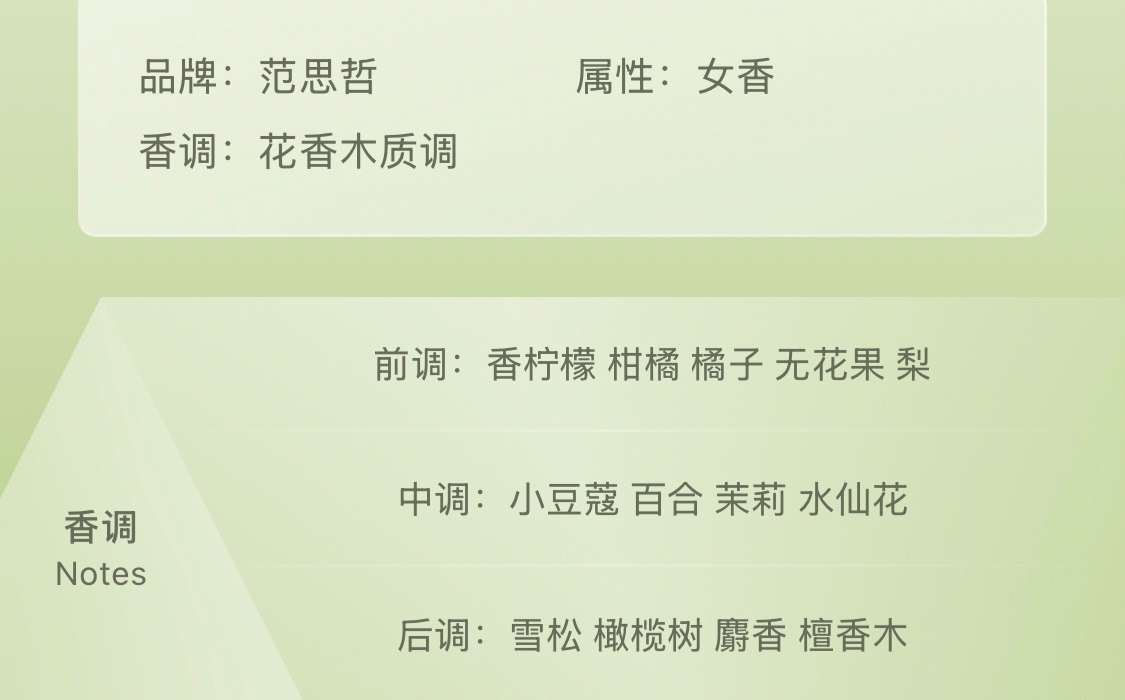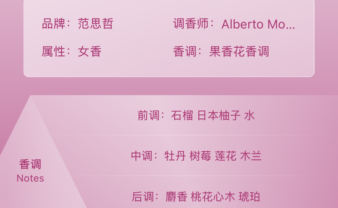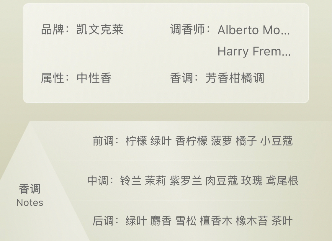 Ck 前调:柠檬 绿叶 菠萝 橘子 香柠檬 中调:铃兰 茉莉 紫罗兰 肉豆蔻 玫瑰 后调:麝香 绿叶 雪松 檀香木 范思哲粉钻 前调:石榴 日本柚子 水 中调:牡丹 树莓 莲花 后调:麝香 桃花心木 琥珀 范思哲心动地中海 前调:香柠檬 柑橘 无花果 中调:小豆蔻 百合 茉莉 后调:雪松 橄榄树 麝香 檀香木
