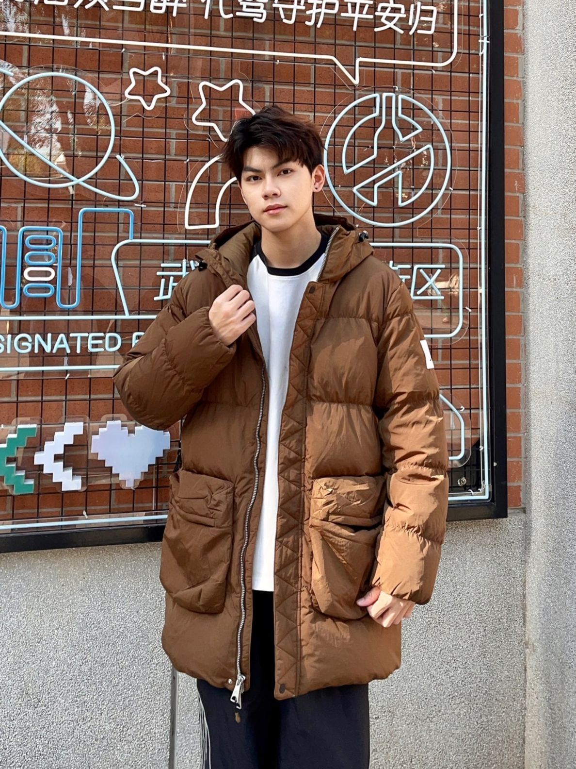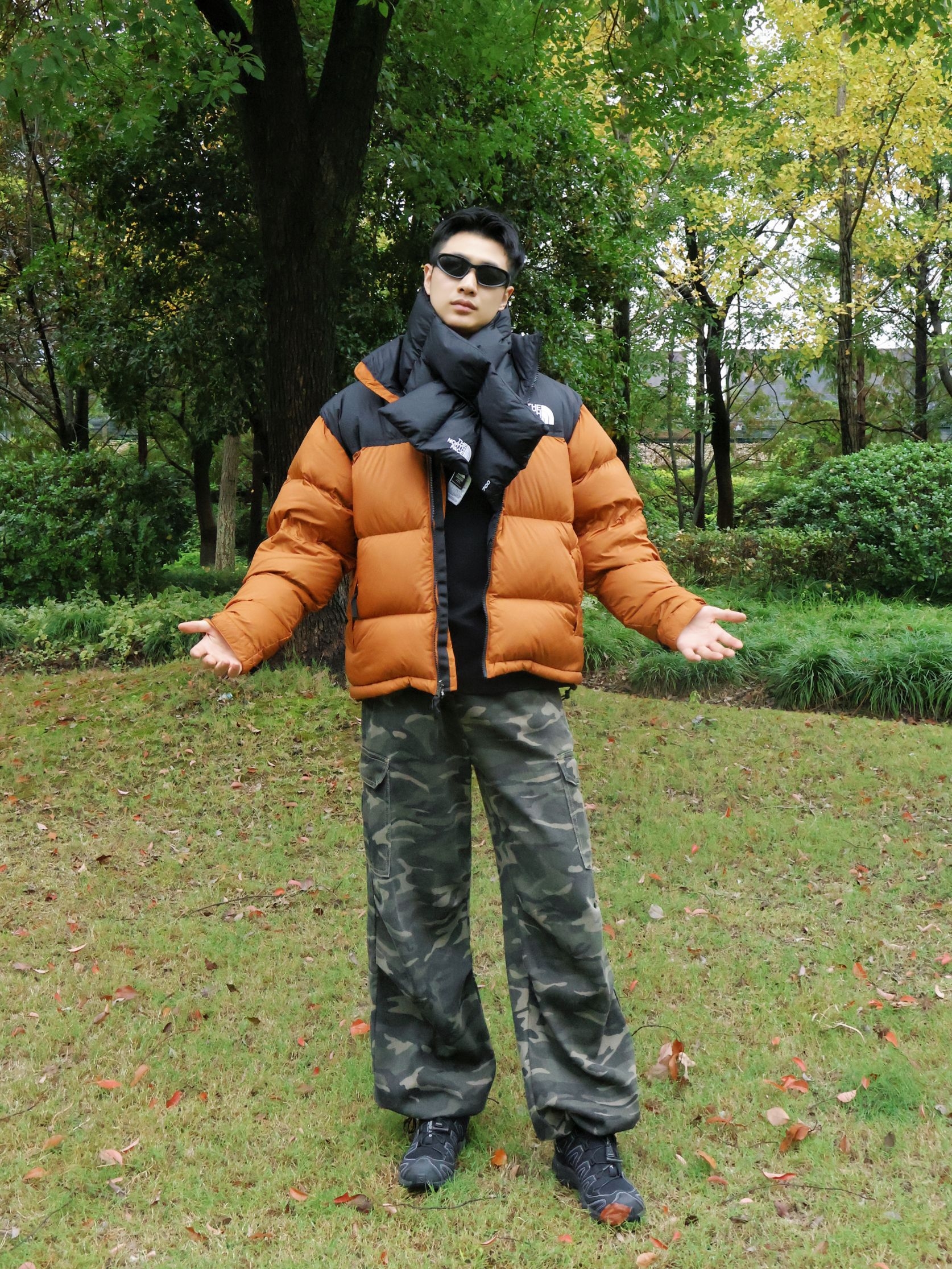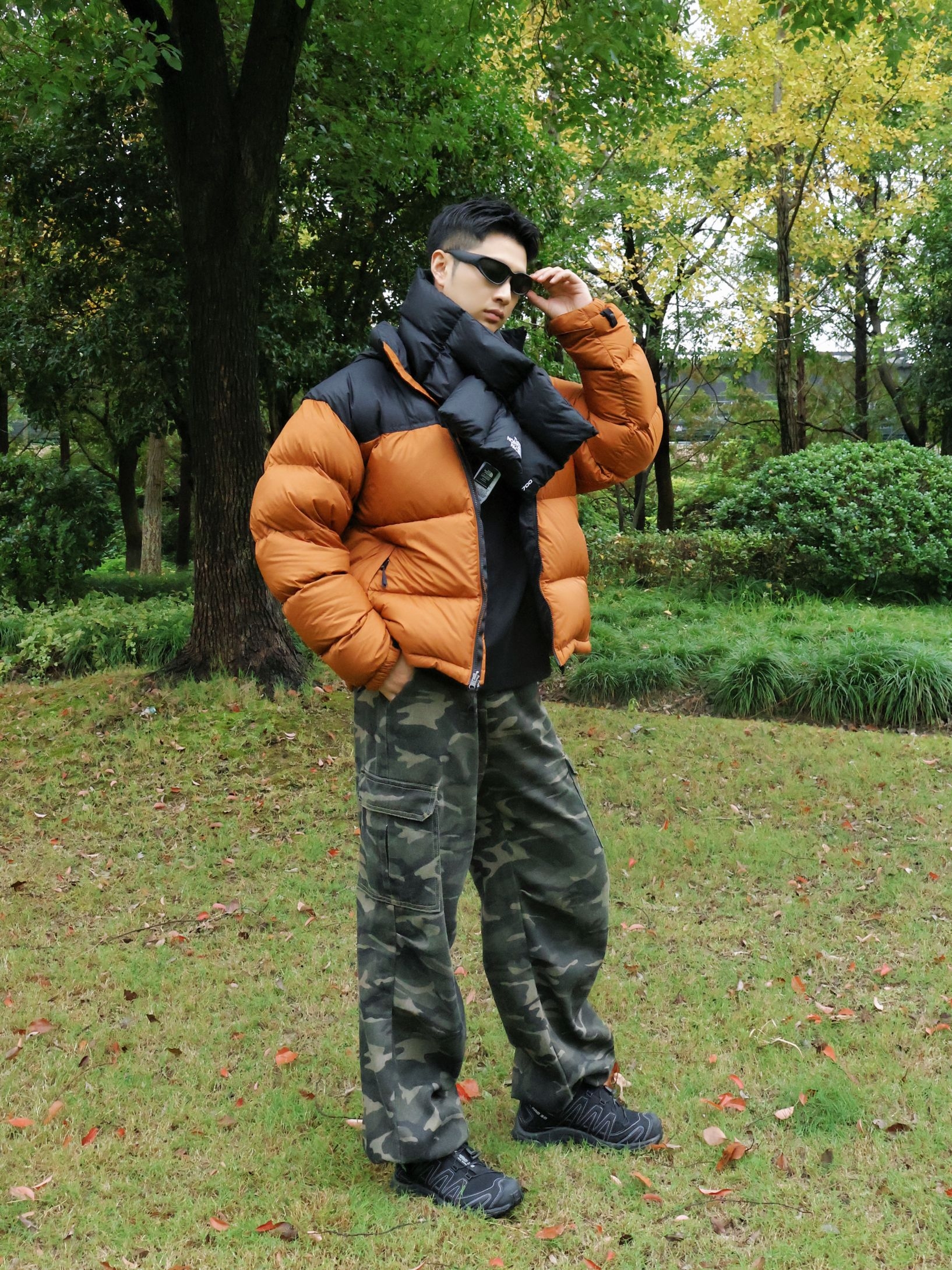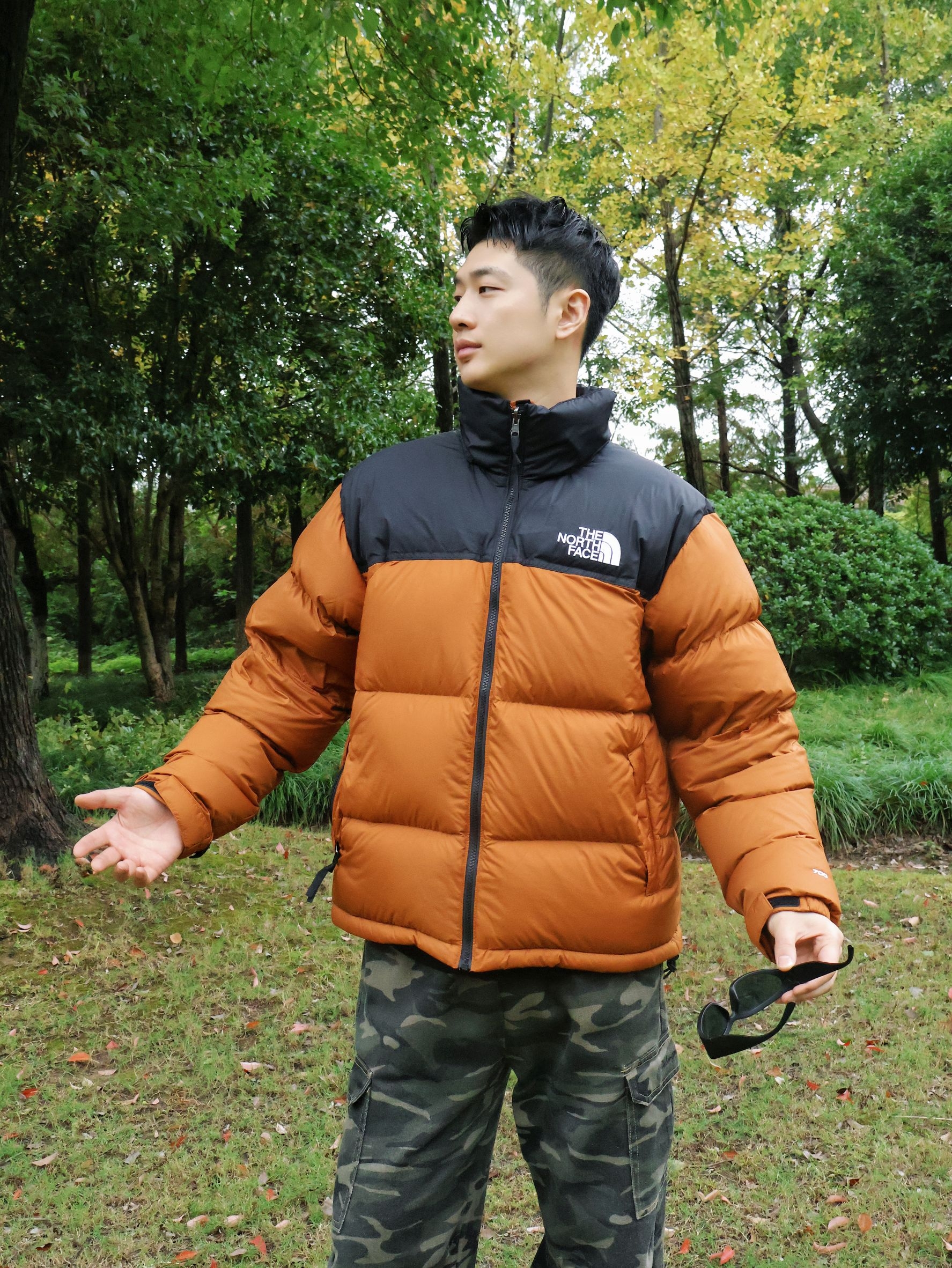 今天户外上身THE NORTH FACE 城市户外羽绒服~ 衣服黑棕拼色很简约干净~ 上身显得很有质感的~ 保暖性很好~充绒量很足的~ 帽子是可以隐藏的~可以收到领子里面~ 整体户外还是很实用百搭~ 衣服面防水效果也可以~ 户外小雨完全没问题~ 小倪:181cm 70kg 上身xl合身~ 搭配户外迷彩裤~ 是可以束脚的~宽松舒适~ 户外萨洛蒙徒步鞋~ 黑色也是百搭款~ 冬天户外这一身很帅呀~