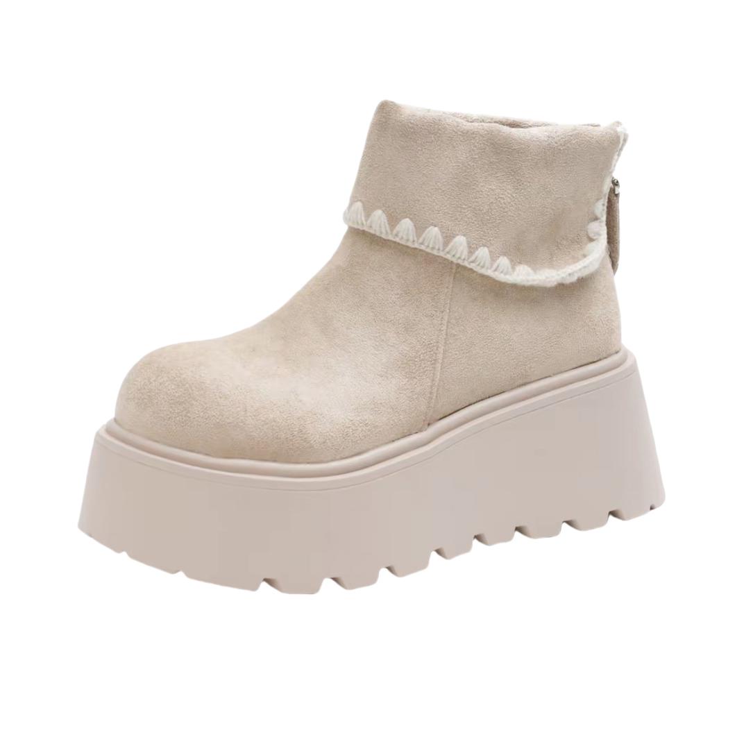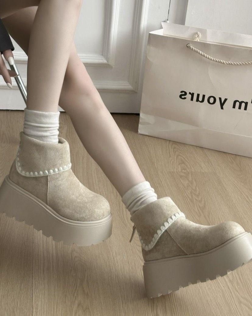 这双奶茶色厚底靴直接戳中温柔心!麂皮质感软乎乎,花边装饰甜到犯规,厚底自带“长腿滤镜”还踩起来巨舒服~搭堆堆袜温柔翻倍,日常通勤或约会穿都适配,上脚秒变氛围感甜妹,秋冬穿搭的温柔底牌就是它!