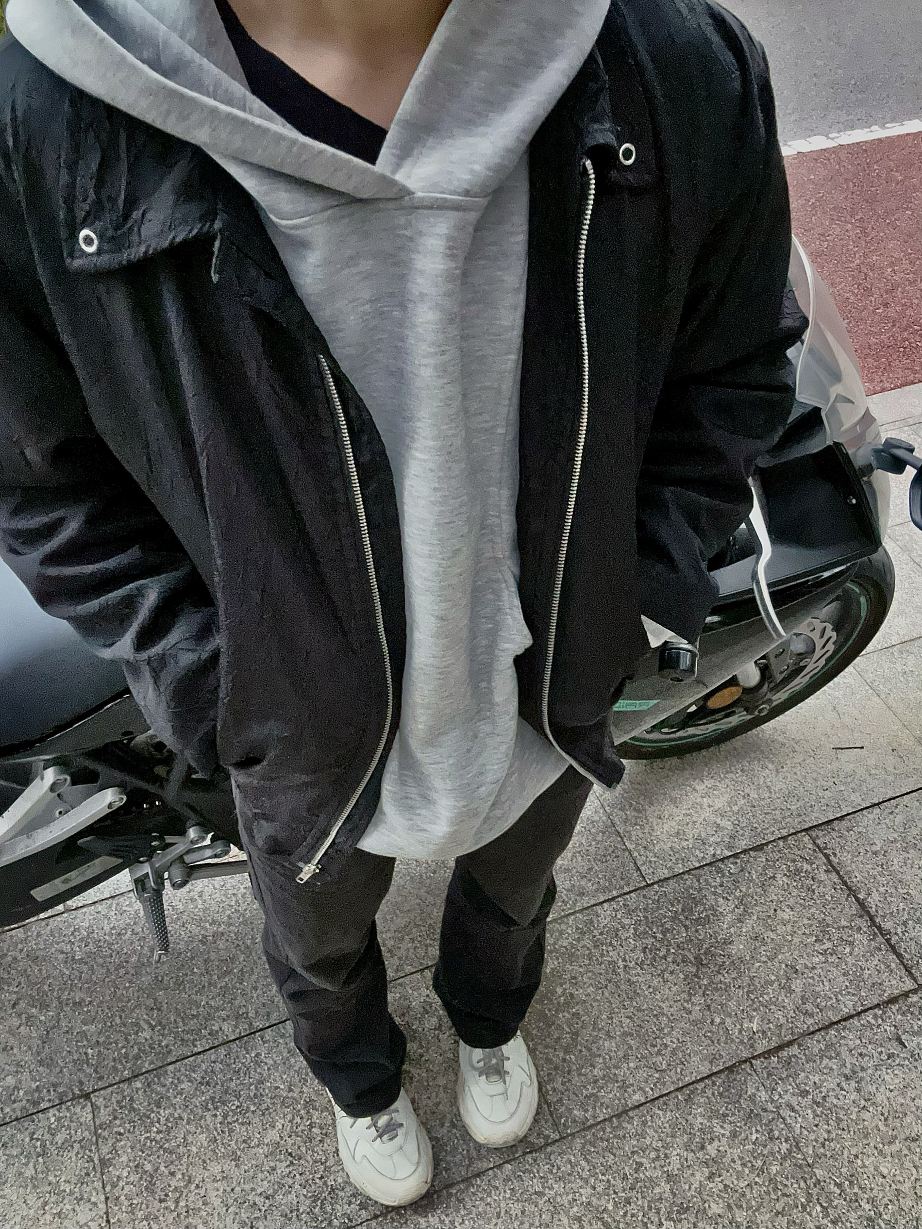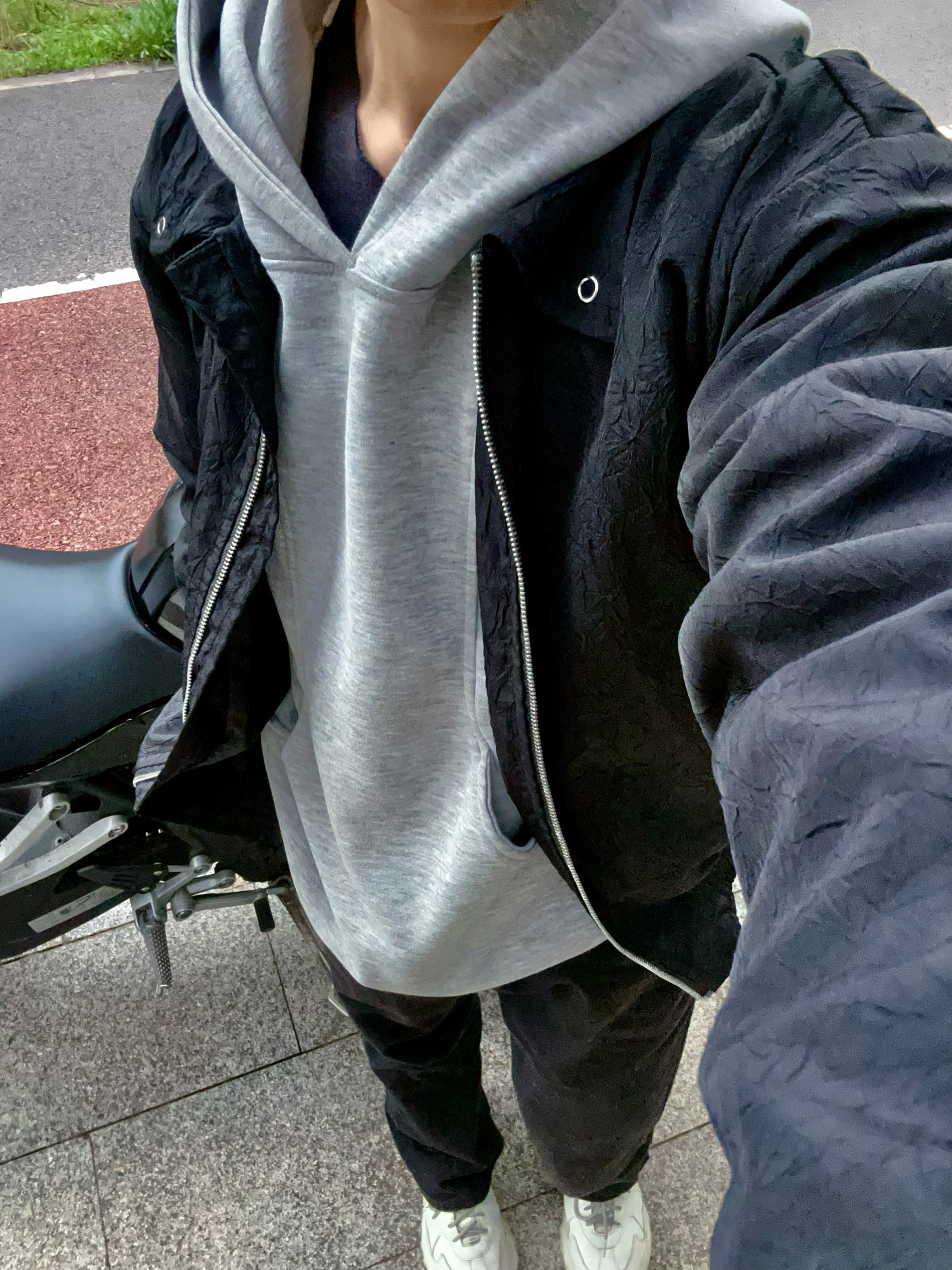 “今天这套是‘松弛感优先’的叠穿逻辑:灰调连帽衫打底,外搭黑色夹克刚好中和了机车的冷硬,黑绿配色的机械感和穿搭的低饱和调撞得很舒服。停在城市边缘的步道旁,风裹着草木的软,和机车金属件的锐混在一块儿,日常穿搭和喜欢的事物同框时,才算把‘风格’穿成自己的节奏。”