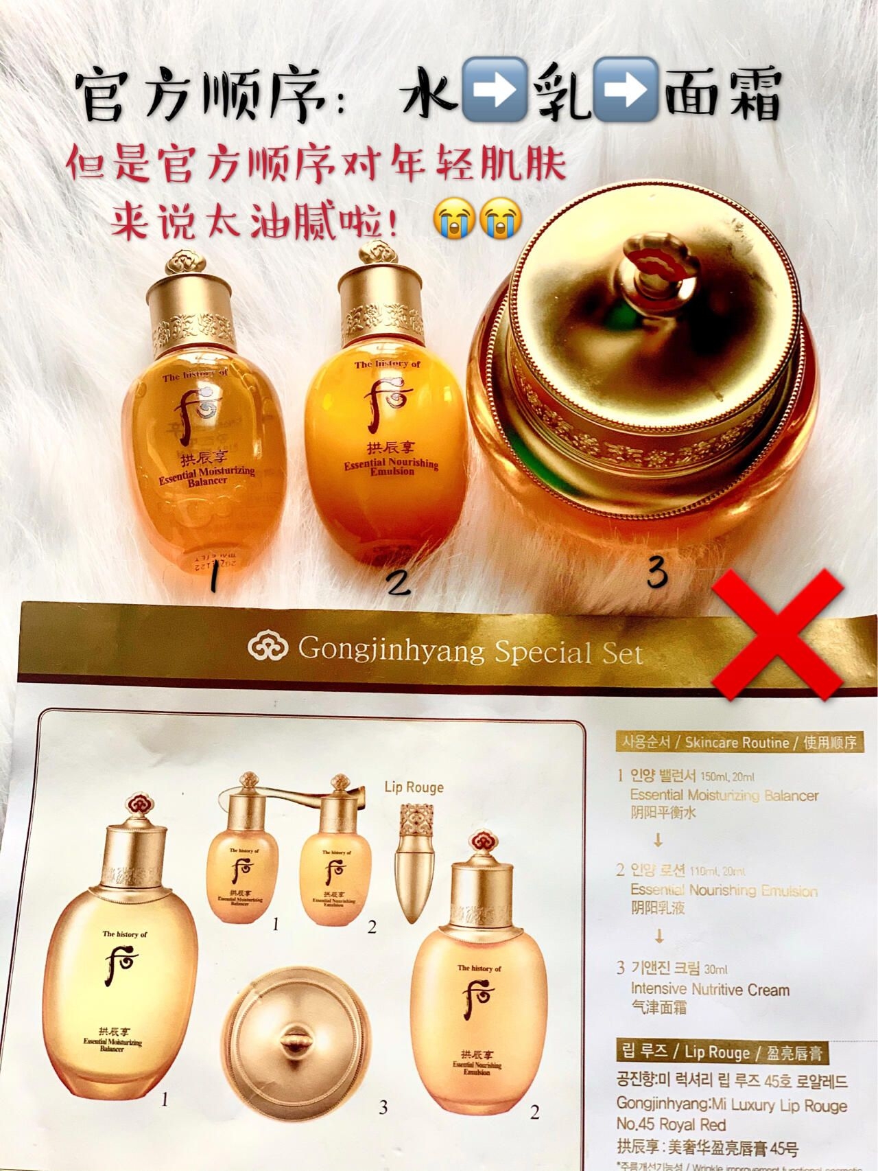 本篇笔记关联了The history of whoo/后 拱辰享紧塑护肤礼盒套装 锁水滋润润颜 水(150ml+20ml)+乳(110ml+20ml)+霜40ml+唇膏15ml等商品,为用户提供真实的使用体验和购买参考。
