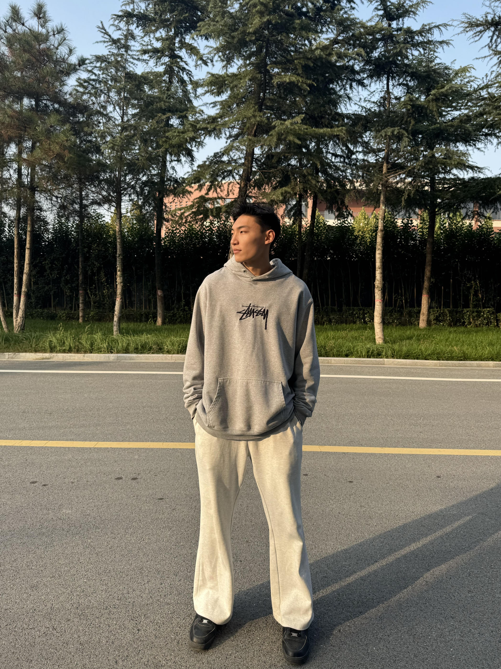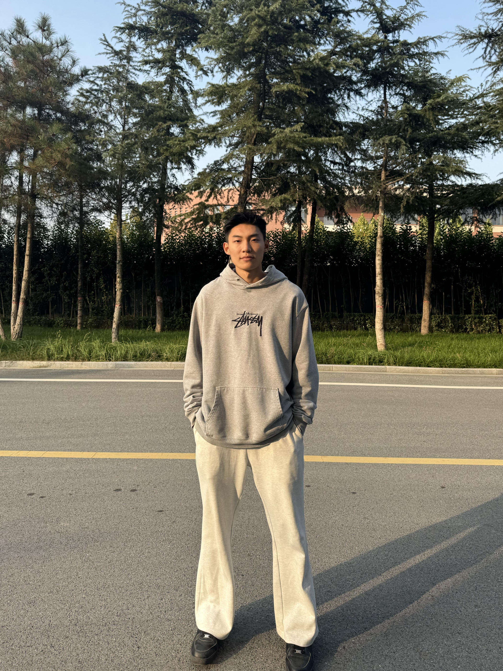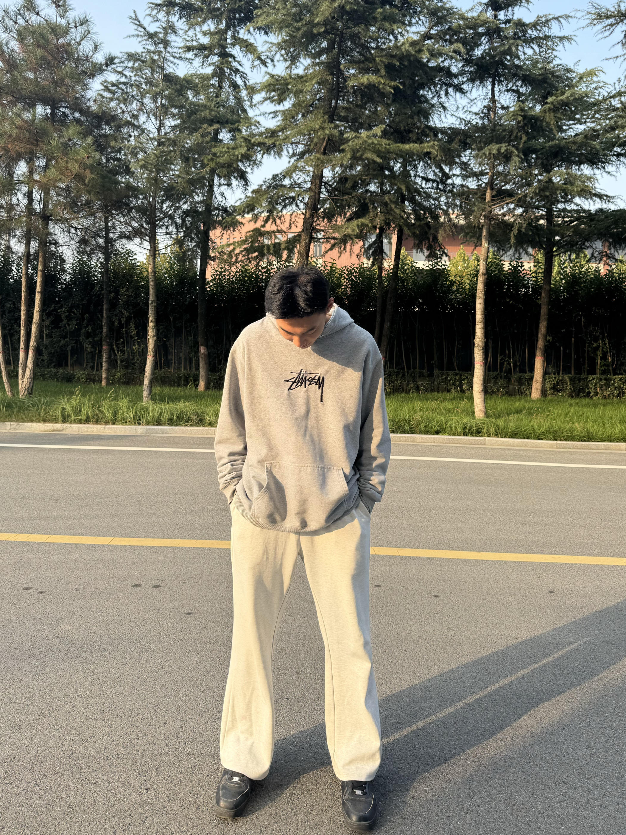身高|体重:183 65kg 🧍♂️ 穿搭风格:今日灰色系运动休闲风! 👔 上衣:斯图西经典的刺绣卫衣 非常好穿 质量特别好 冬天单穿或搭配羽绒服都可以 👖 下装:一件百搭的灰色阔腿卫裤 面料舒适 👟 鞋子:百搭的黑色板鞋 也可以搭配运动鞋 帆布鞋 达到不一样的感觉