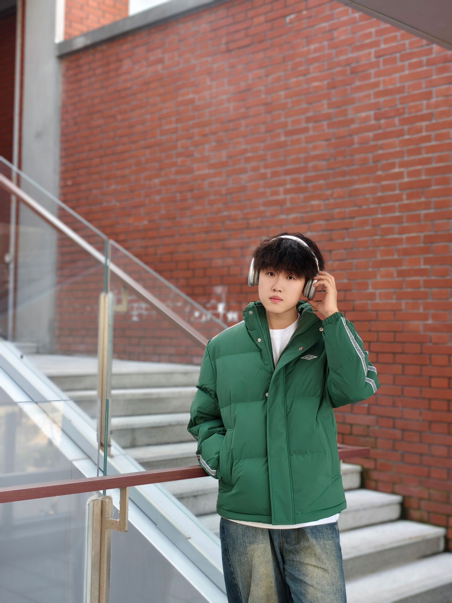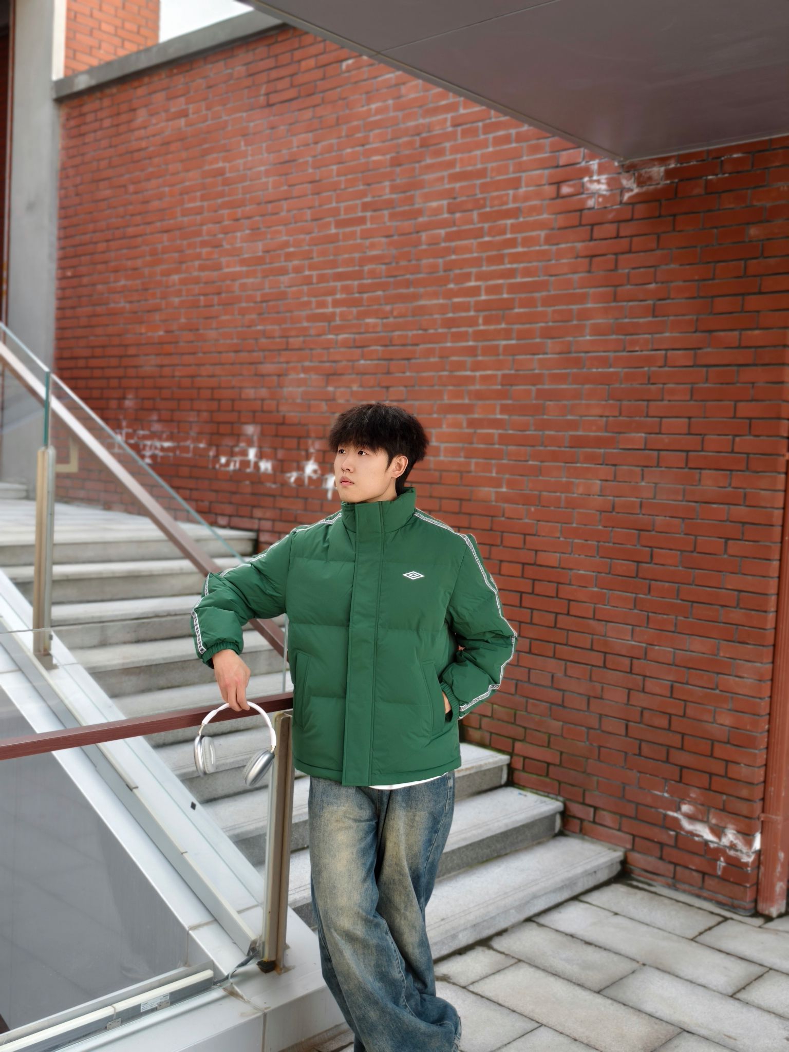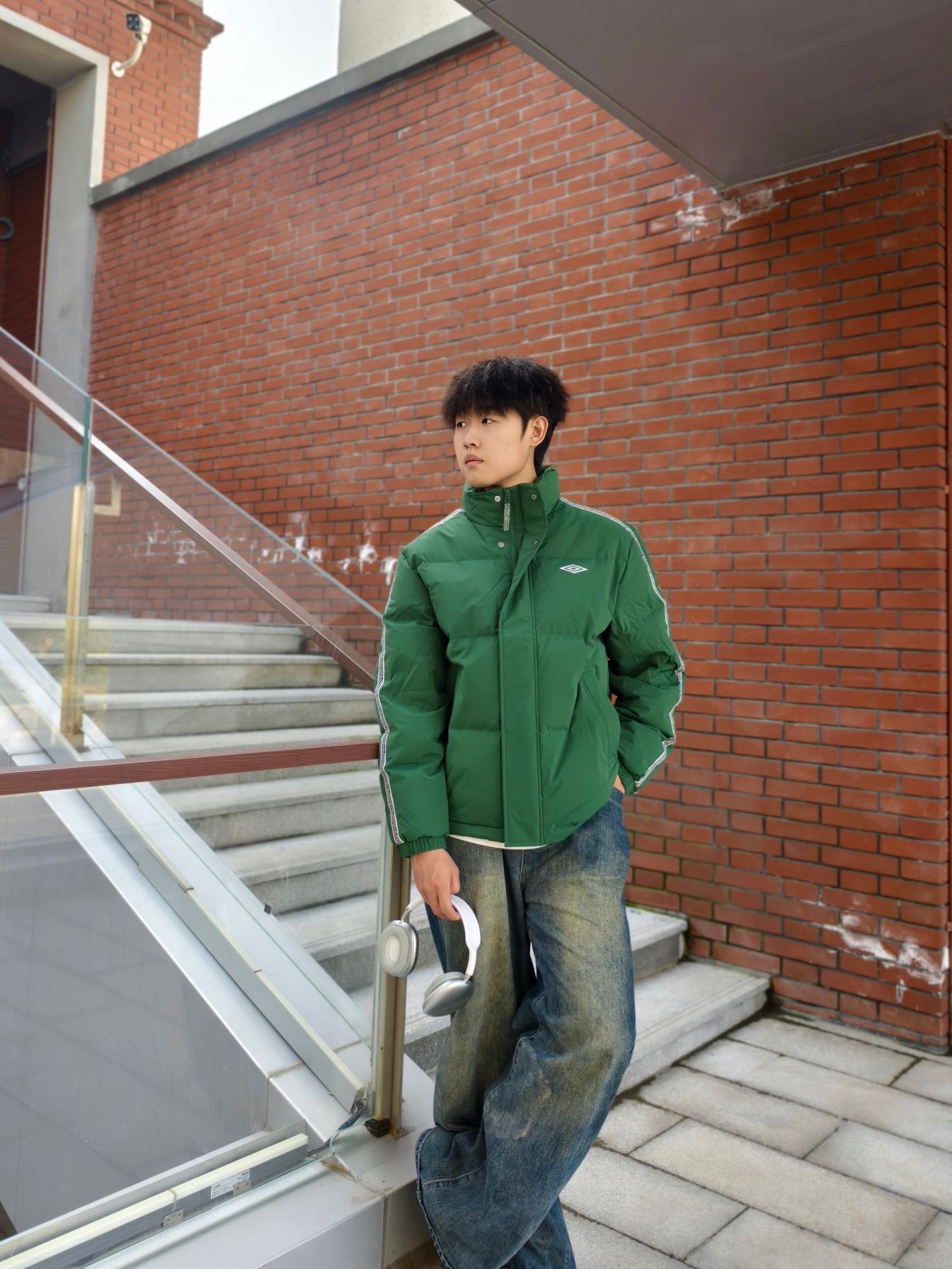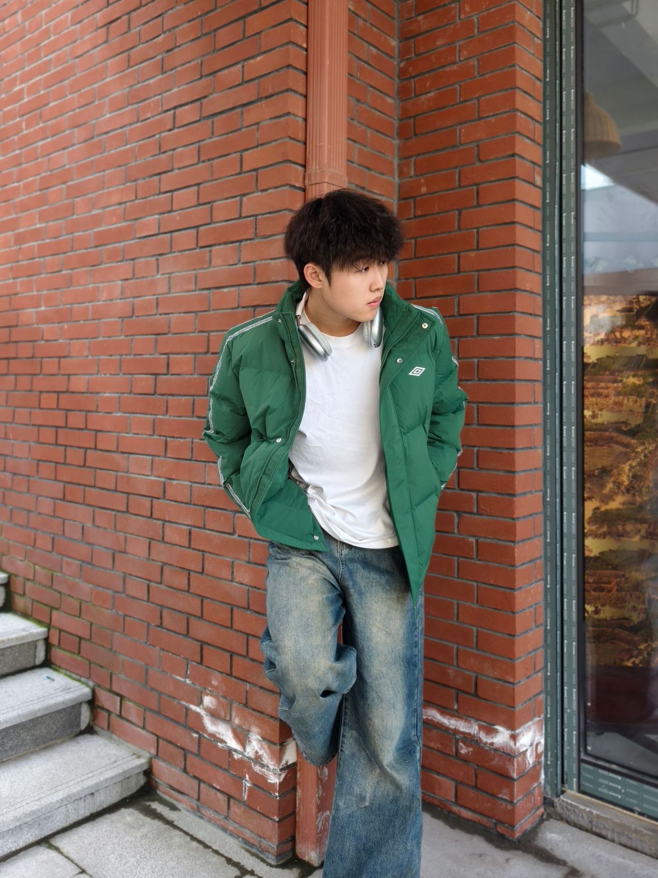 墨绿是真的藏肉又显气色,身上这件#umbro/茵宝 羽绒服挺实用的。 ✅防点小风小溅水+轻羽绒填充,揣兜出门不压身 ✅内搭白T刚好中和厚重感,不用费脑叠穿 ✅下装是软乎乎的做旧阔腿牛仔裤👖,休闲又自然 鞋子搭了双老爹鞋,走通勤路脚不酸,还能跟外套颜色呼应上 懒人出门套上就走,舒服和顺眼都占了。 📏178/140斤 L码