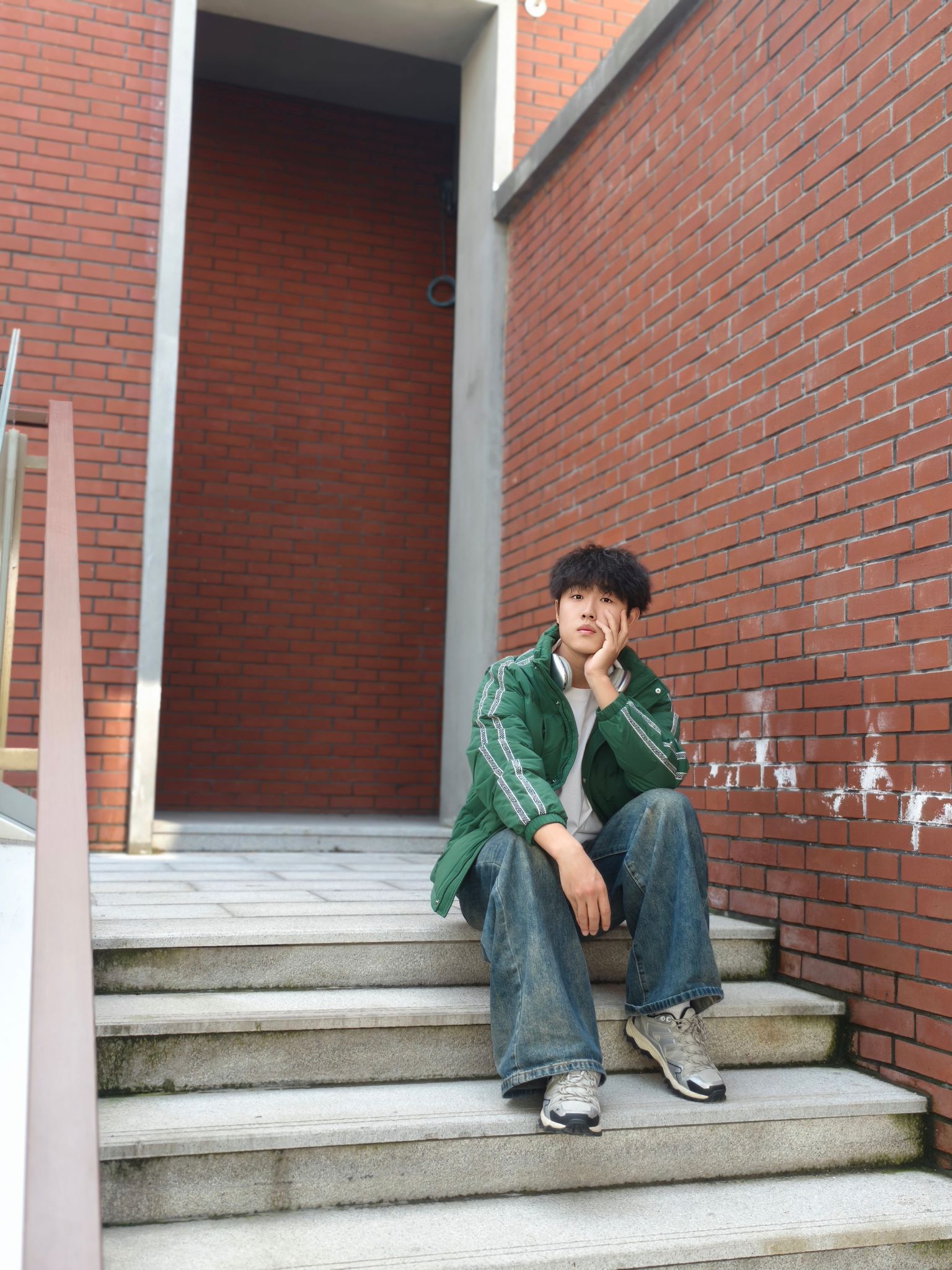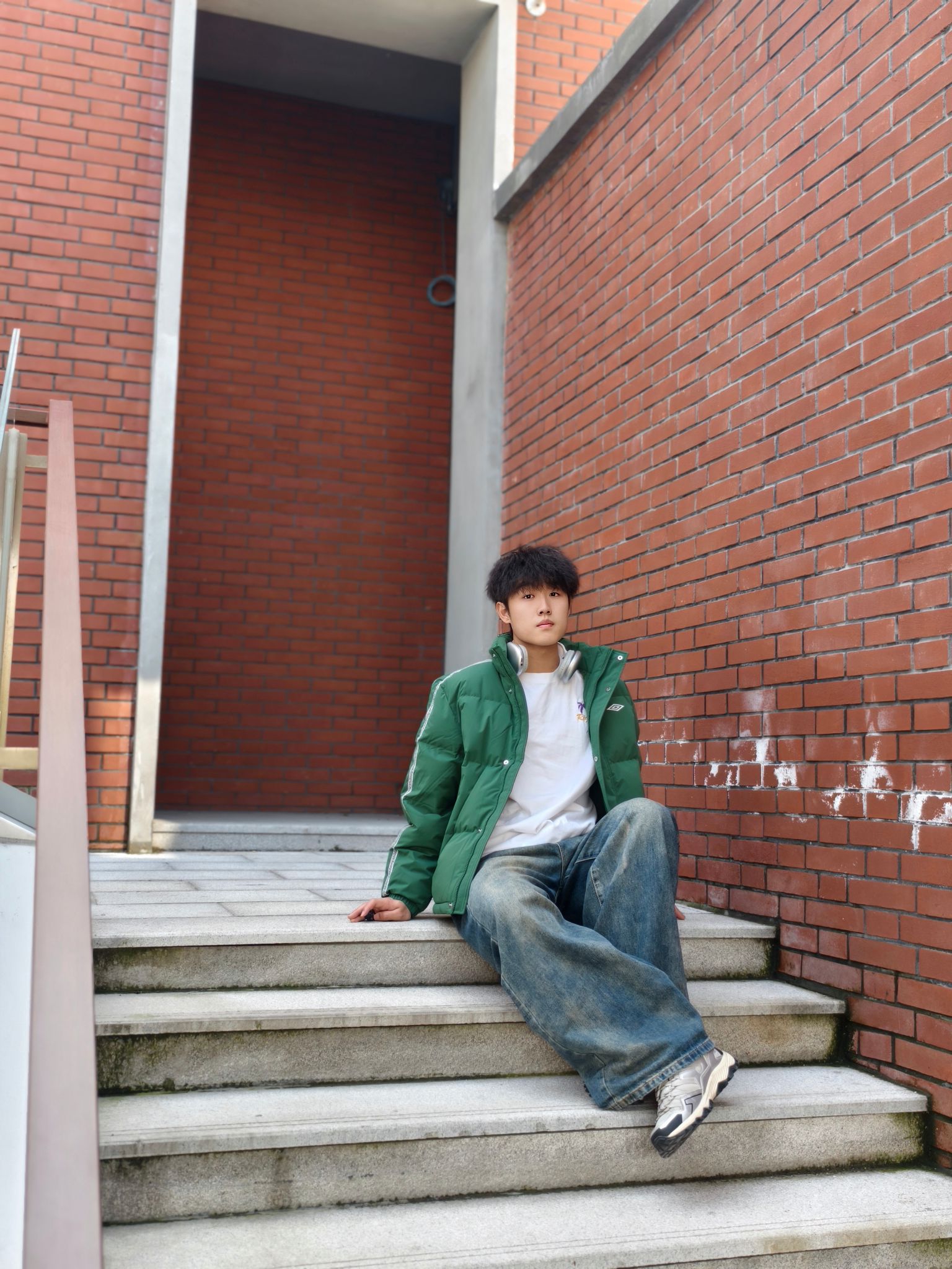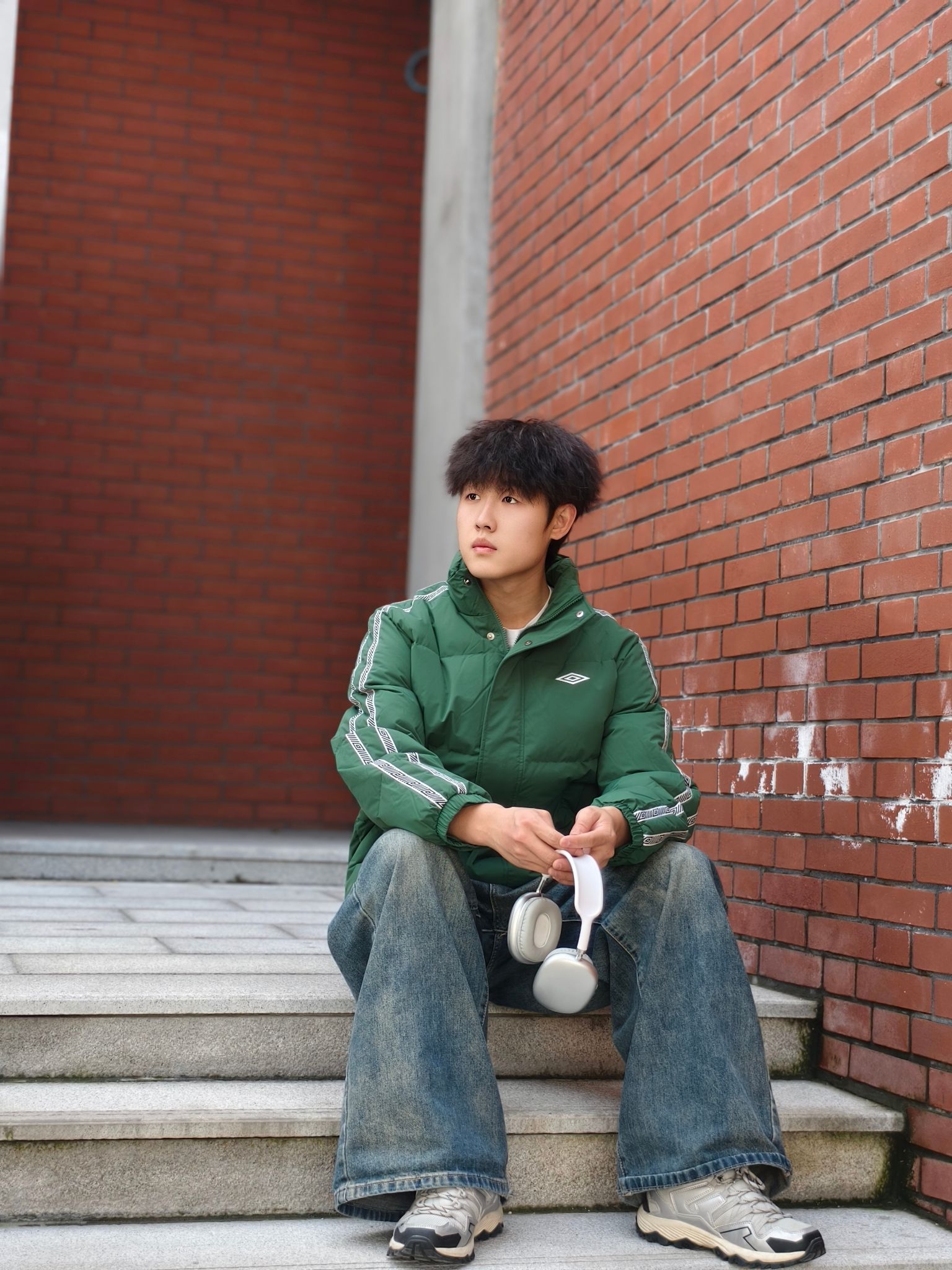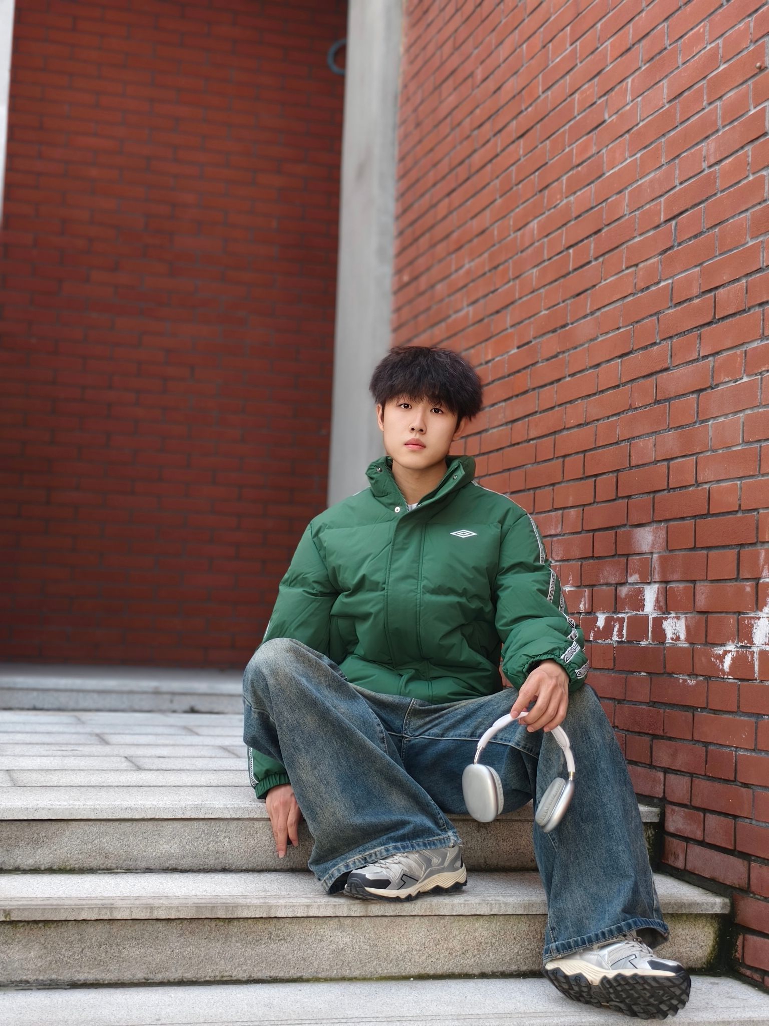 墨绿是真的藏肉又显气色,身上这件#umbro/茵宝 羽绒服挺实用的。 ✅防点小风小溅水+轻羽绒填充,揣兜出门不压身 ✅内搭白T刚好中和厚重感,不用费脑叠穿 ✅下装是软乎乎的做旧阔腿牛仔裤👖,休闲又自然 鞋子搭了双老爹鞋,走通勤路脚不酸,还能跟外套颜色呼应上 懒人出门套上就走,舒服和顺眼都占了。 📏178/140斤 L码
